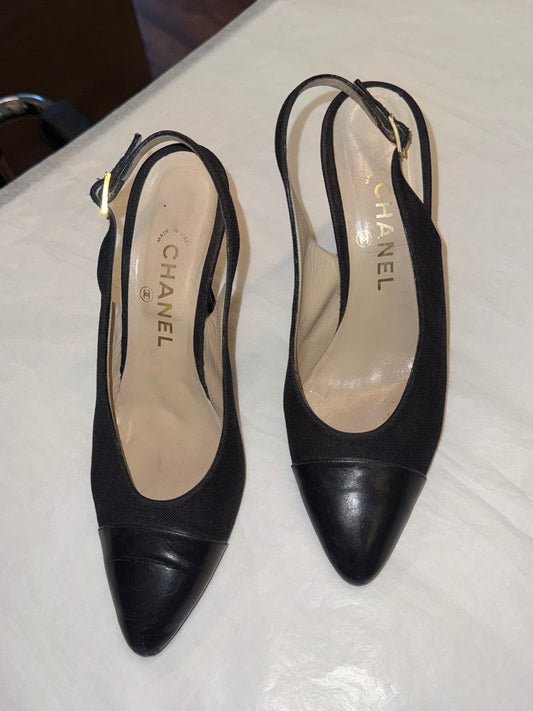 Chanel Black Cap Toe Slingback Heels 37 EU