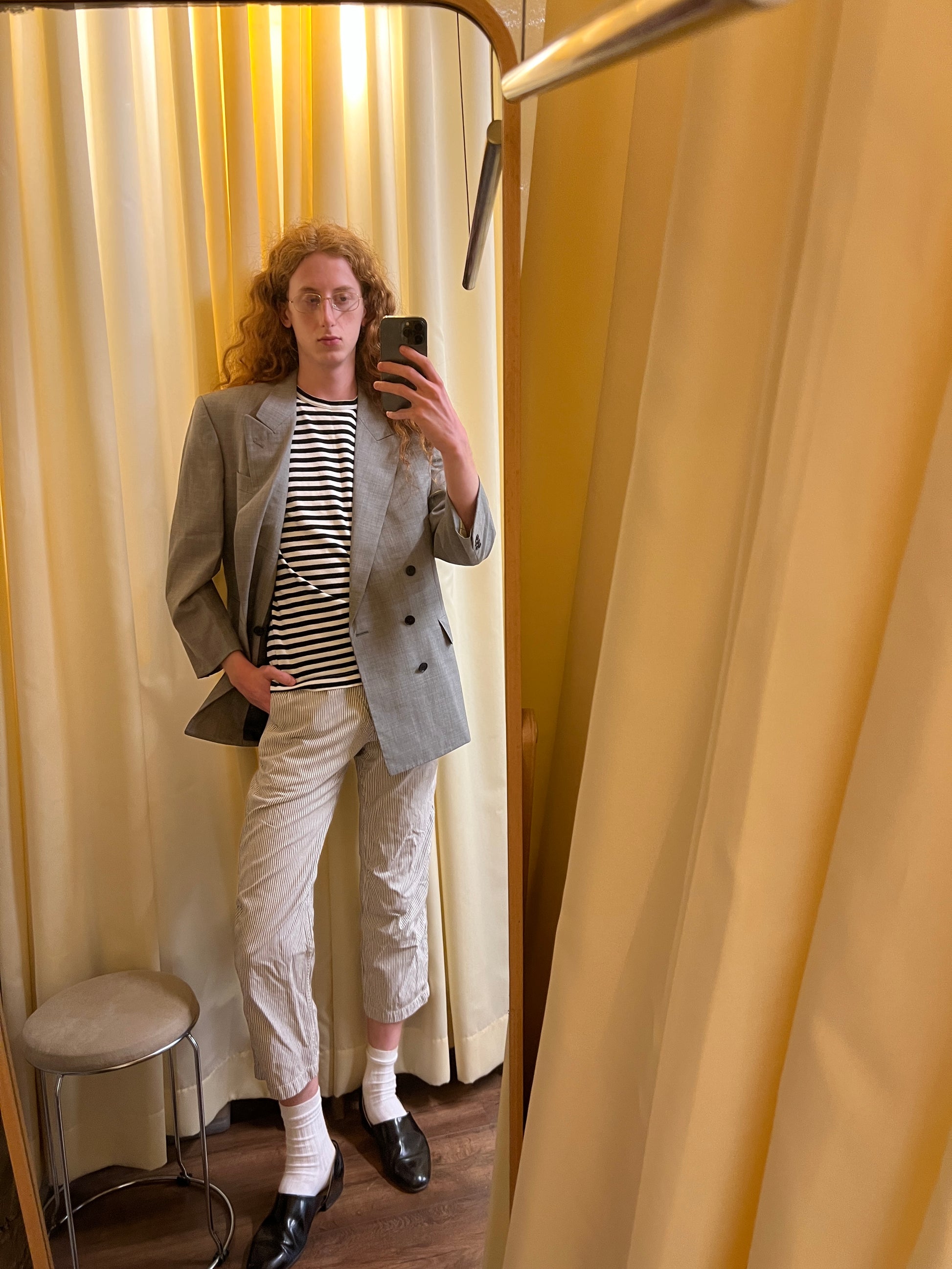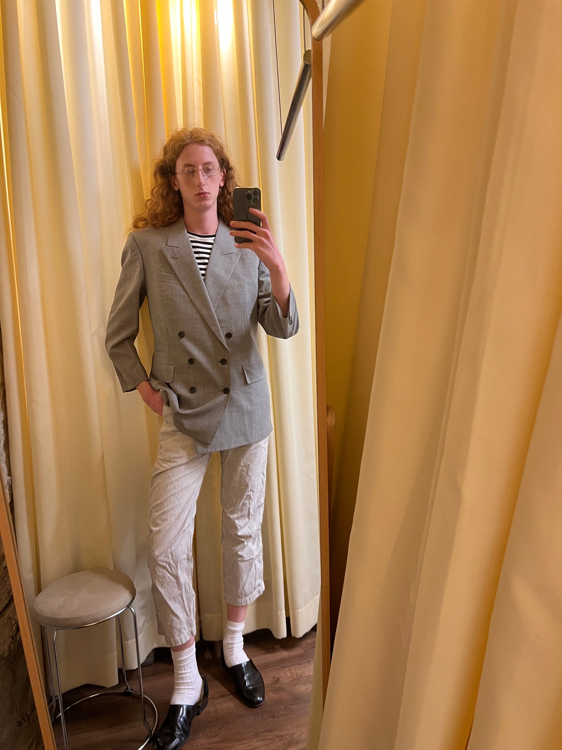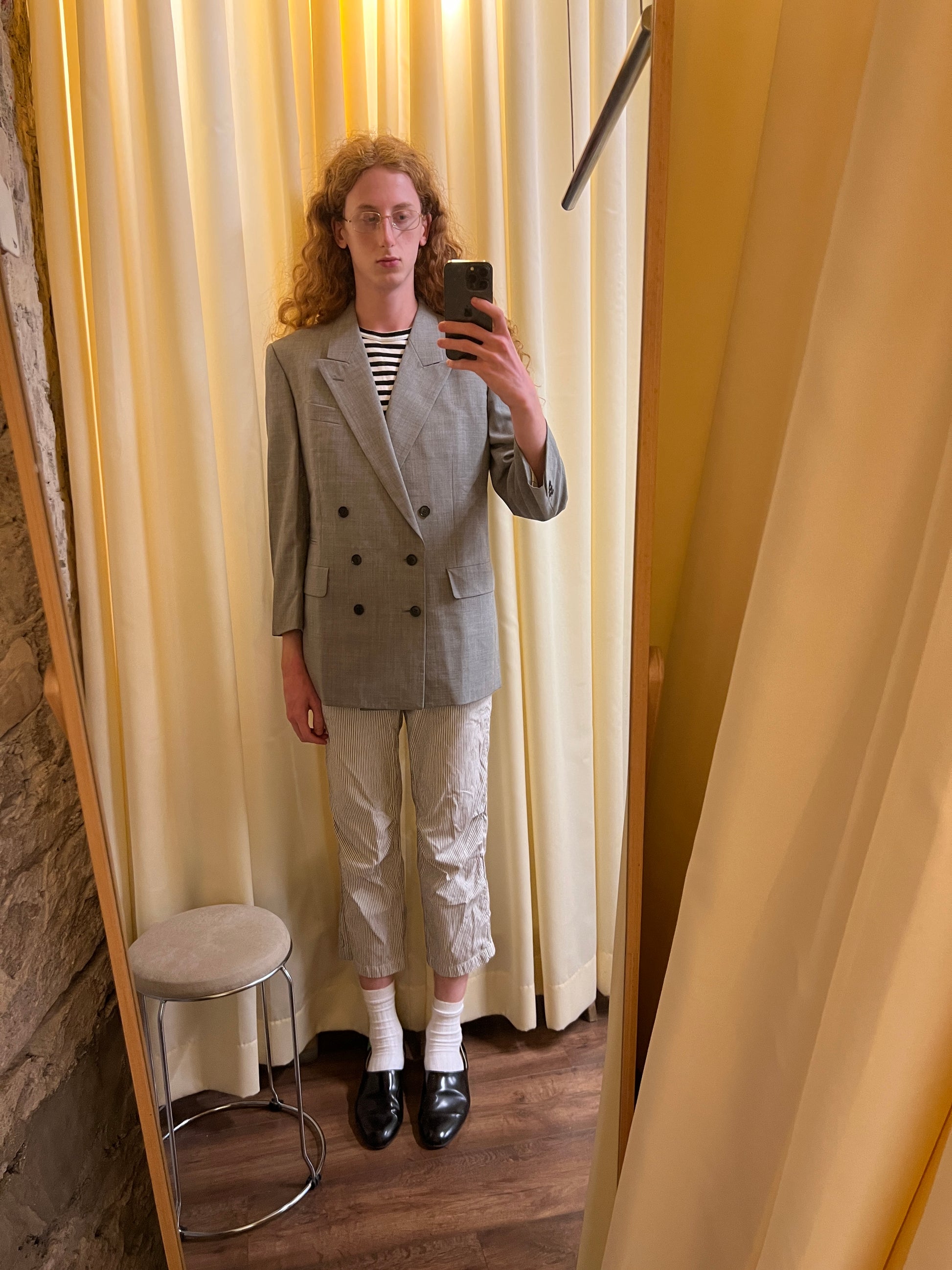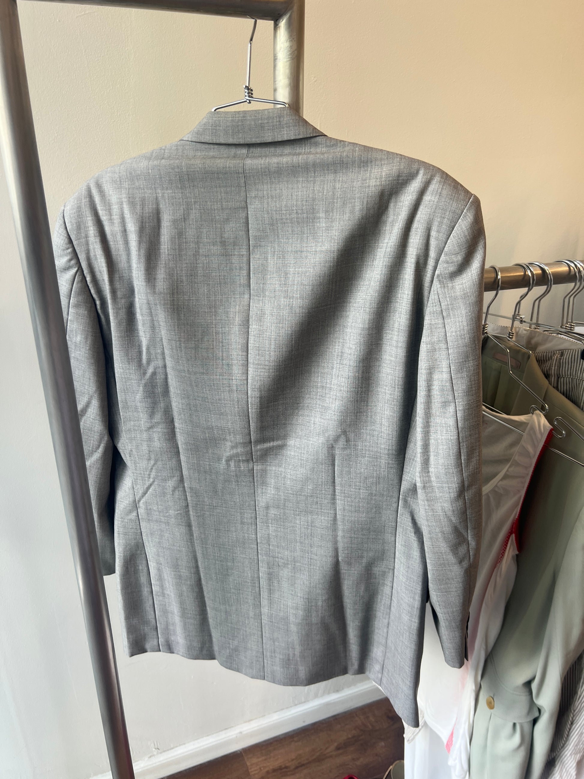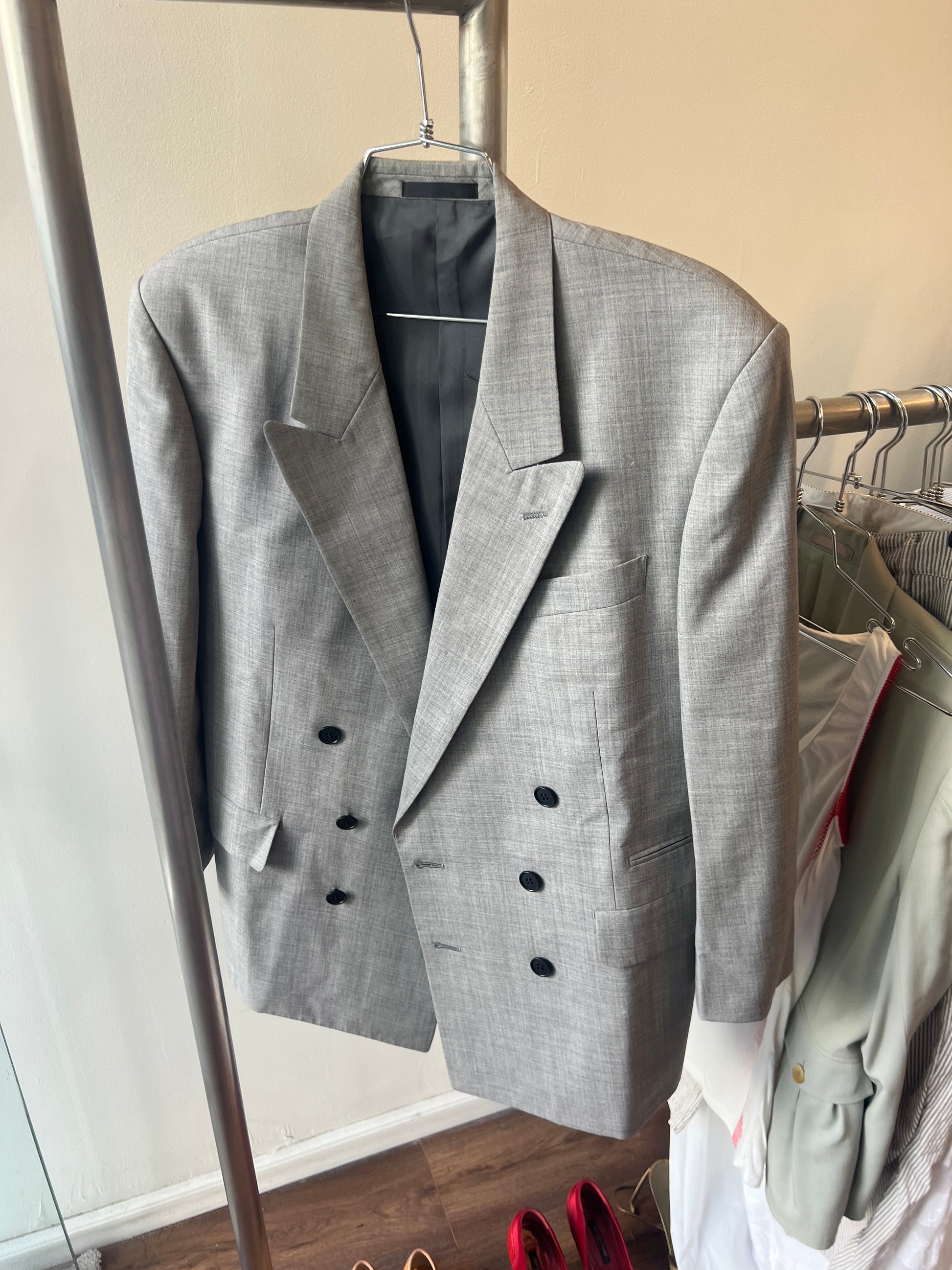 grey melange double breasted tailored blazer with black buttons