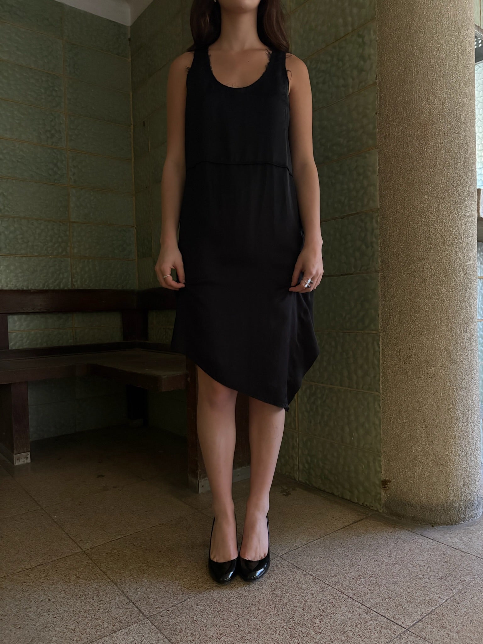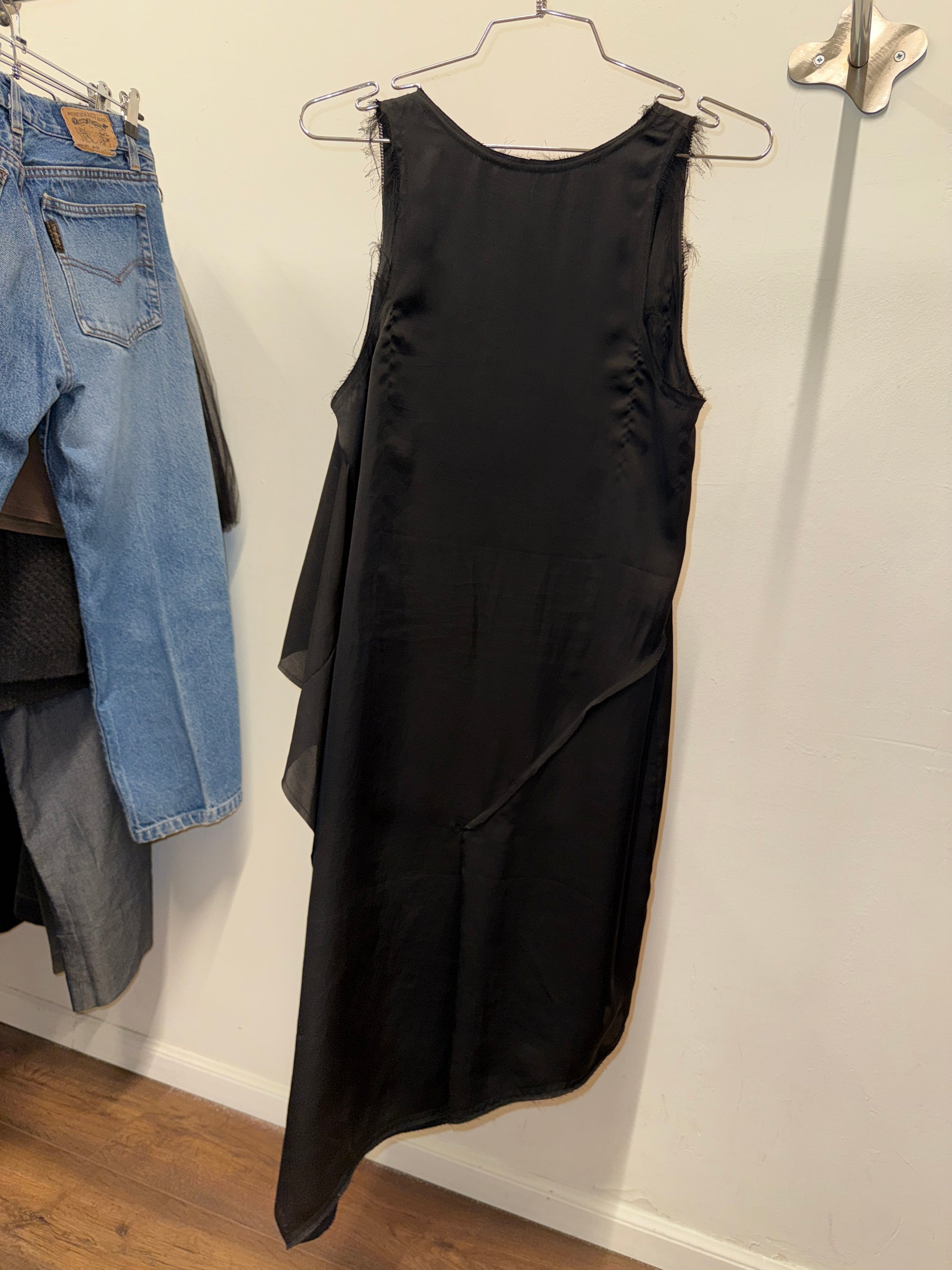 Lightweight polyester shell with cupro lining, asymmetric layered panels and raw-edge finishes at the armholes and side.