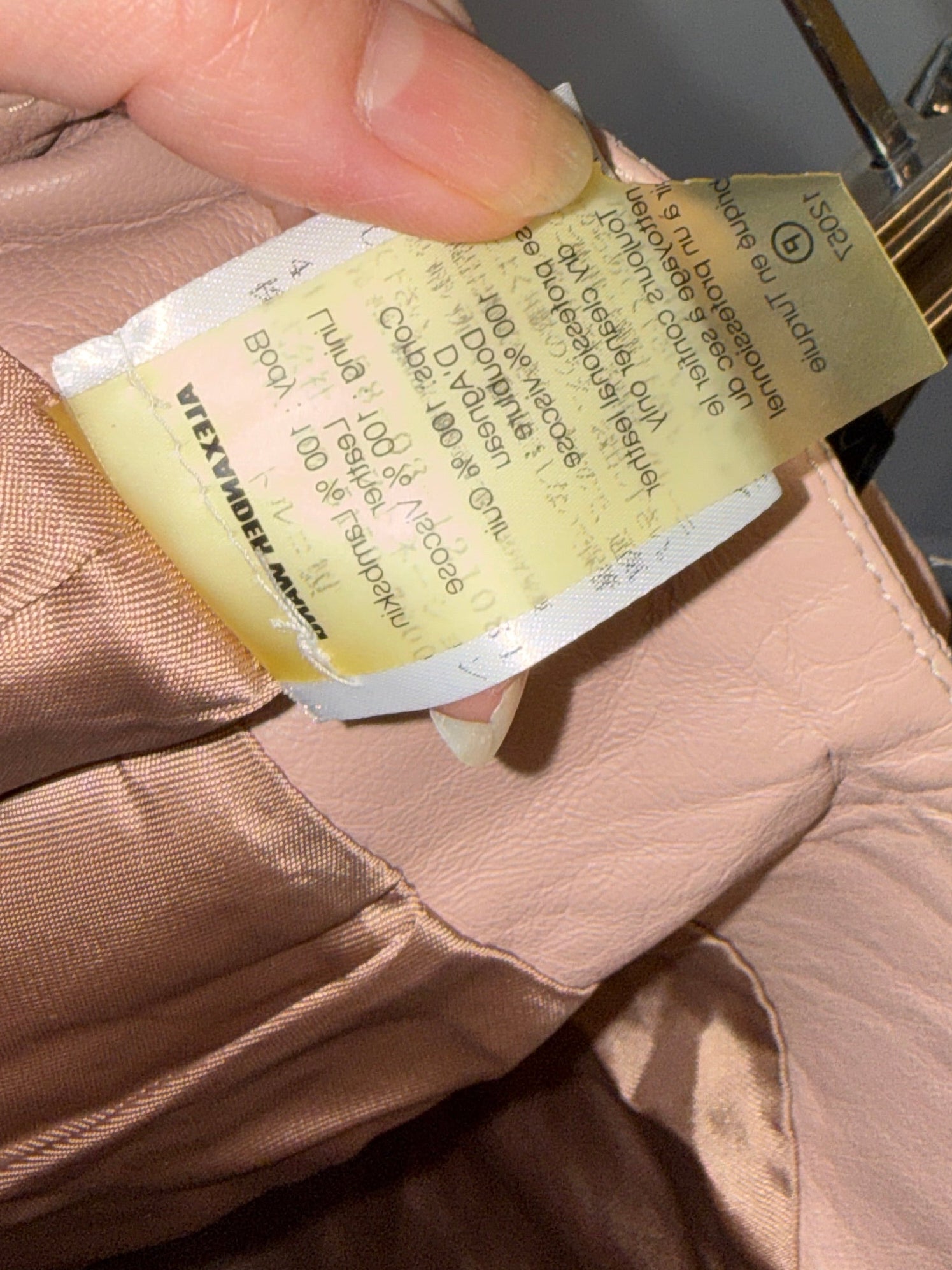 Soft pink-beige lambskin leather mini skirt with a clean minimal A-line silhouette and panel construction. Smooth buttery leather with subtle natural texture and a viscose lining for comfortable wear.