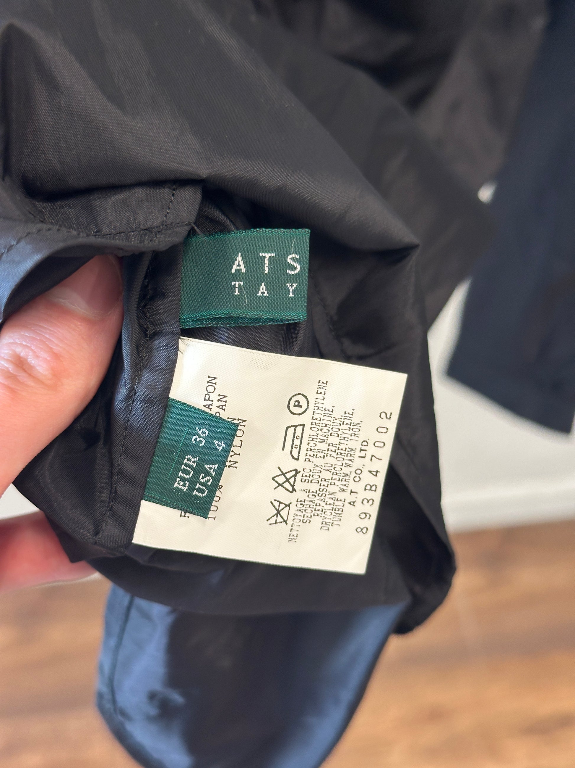black nylon long sleeve top with buttons on the back for closure and webbed stitching design on the chest
