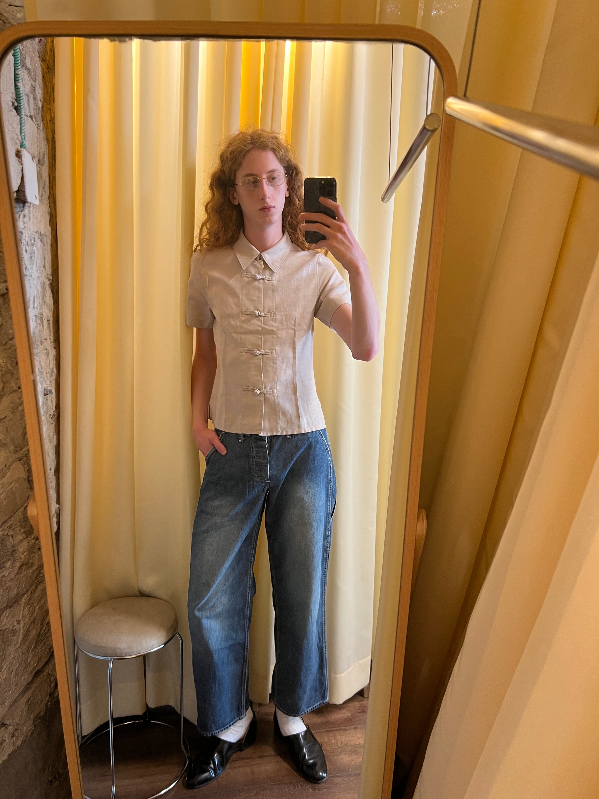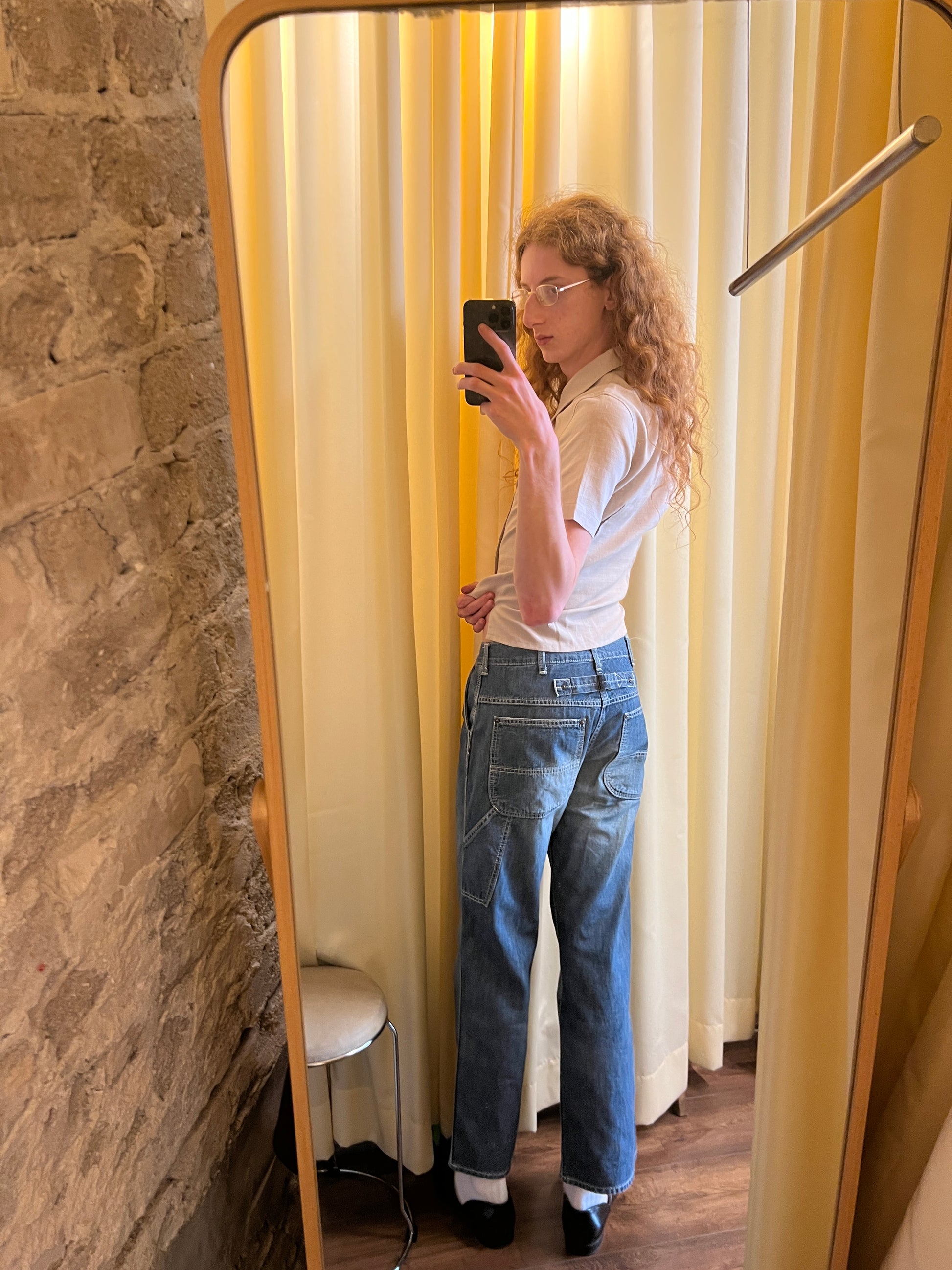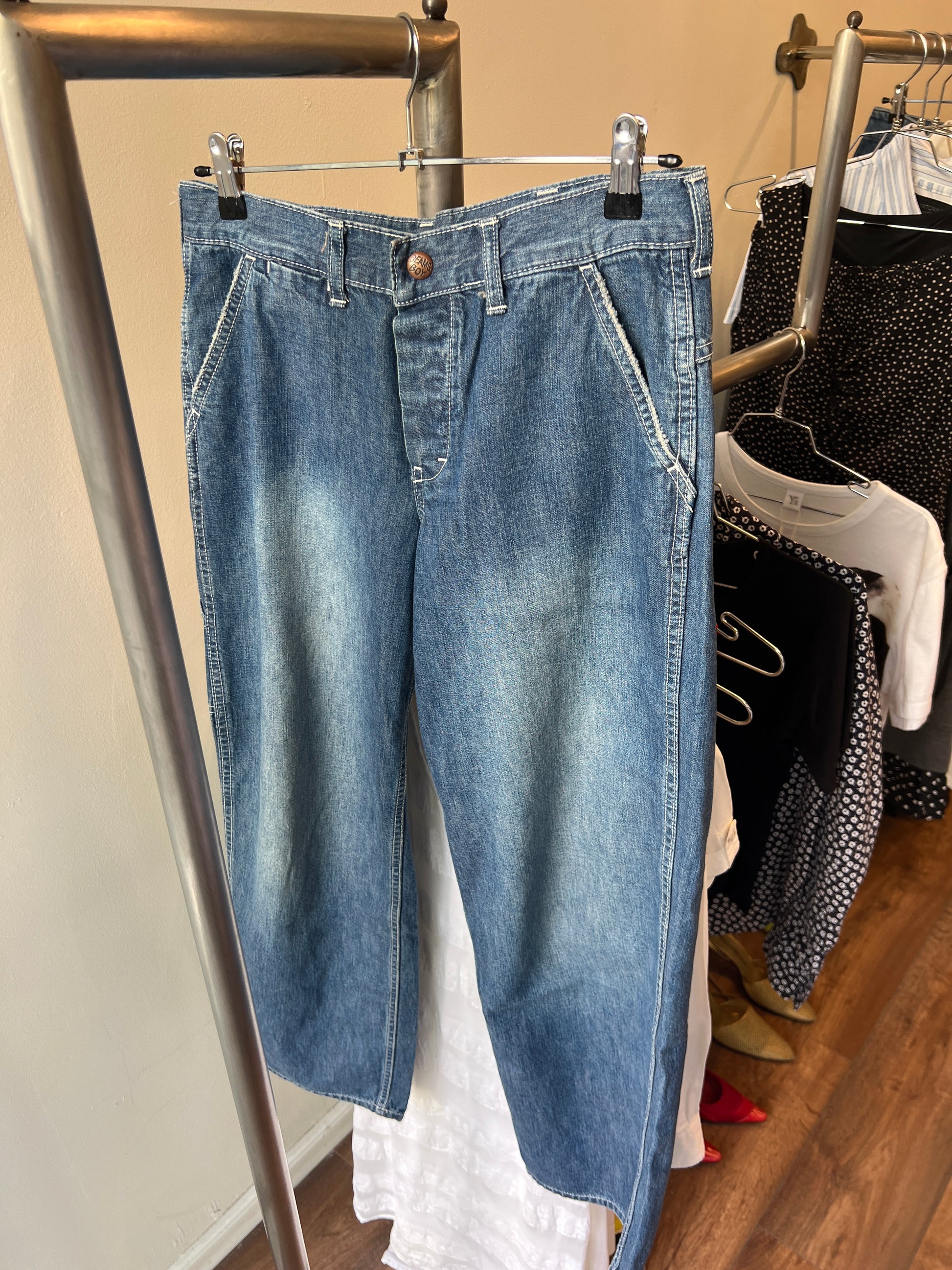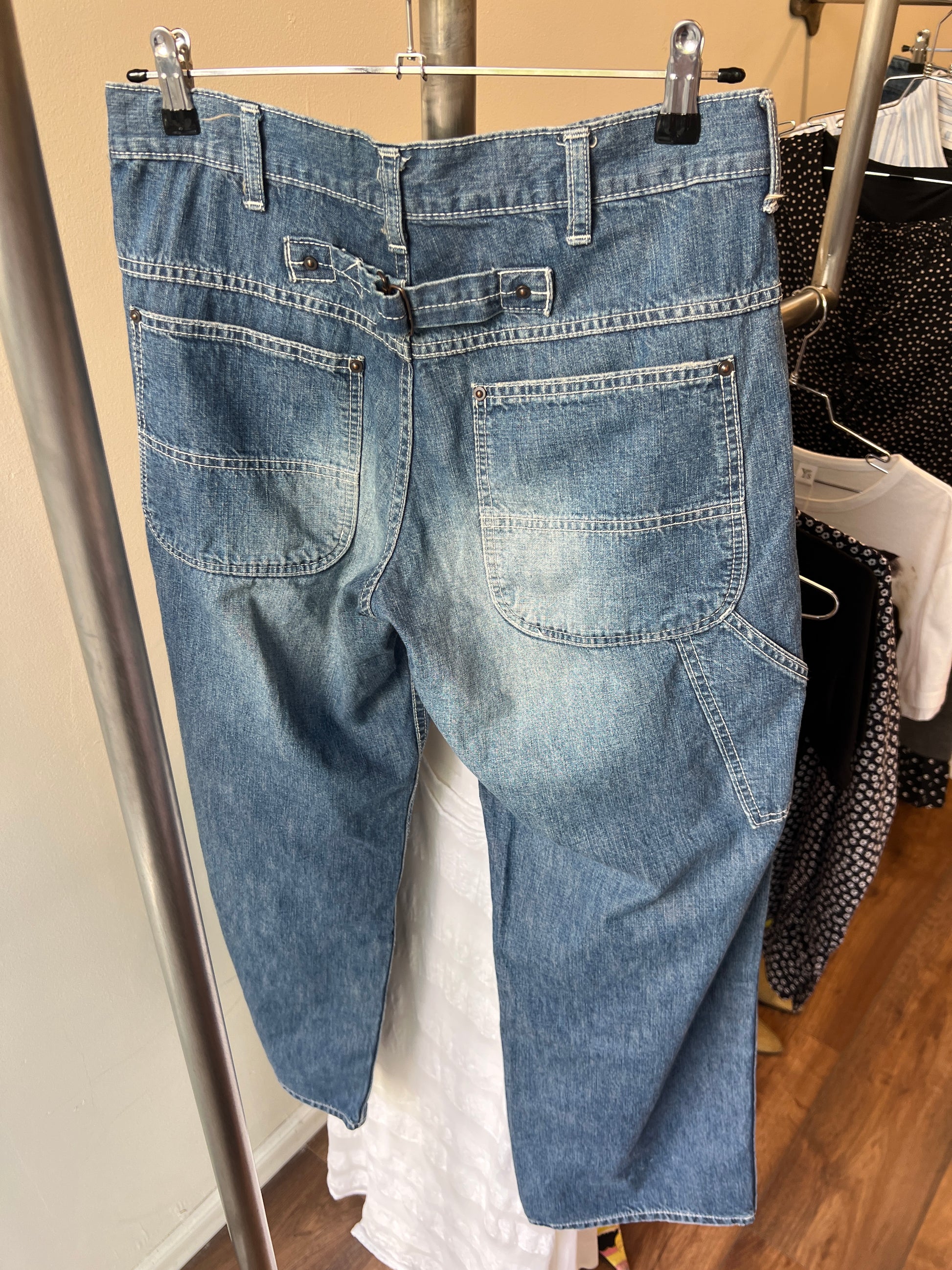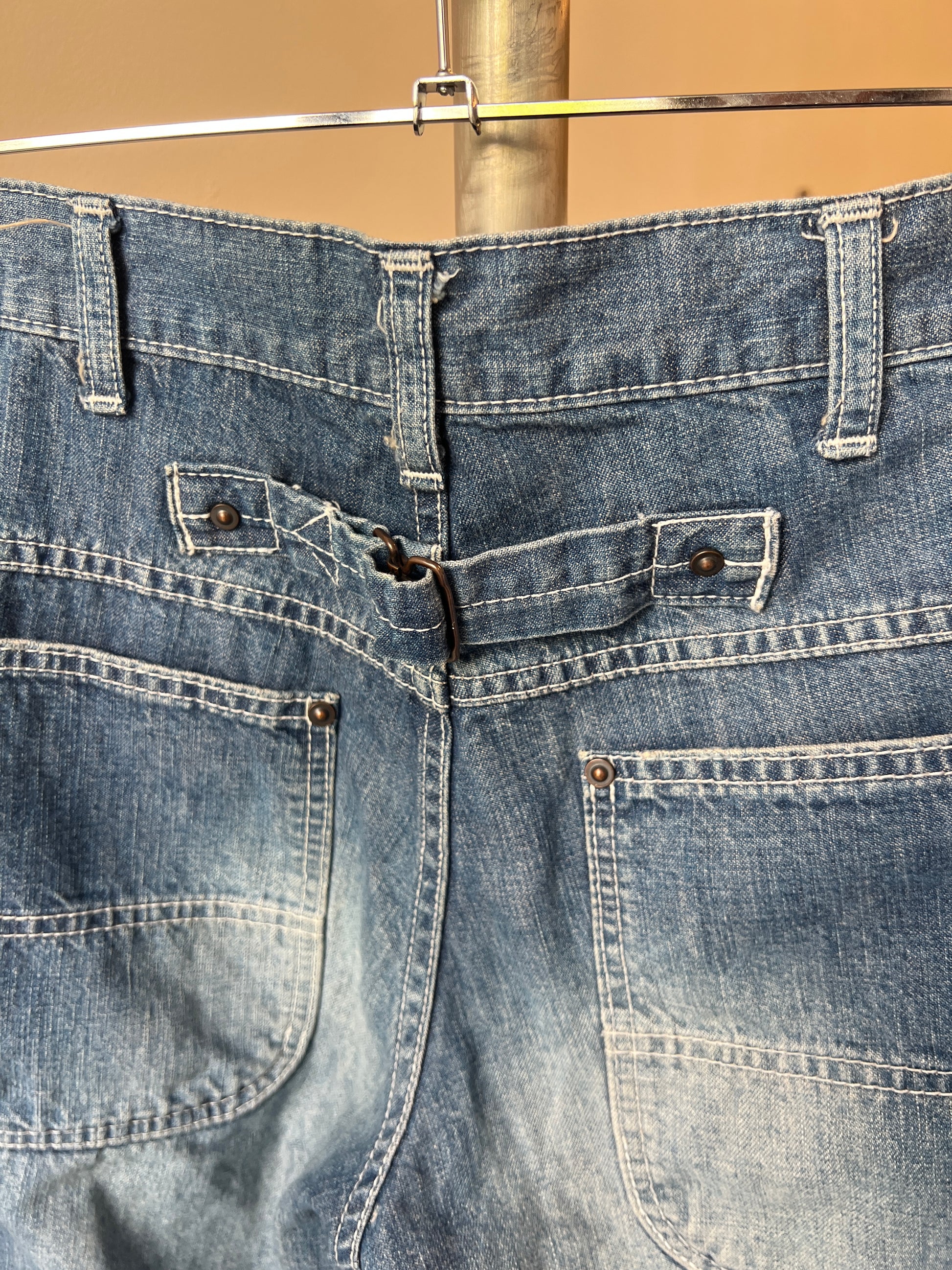 slightly cropped light wash worker type denim jeans with a heavy wash on thighs and a buckle on the back