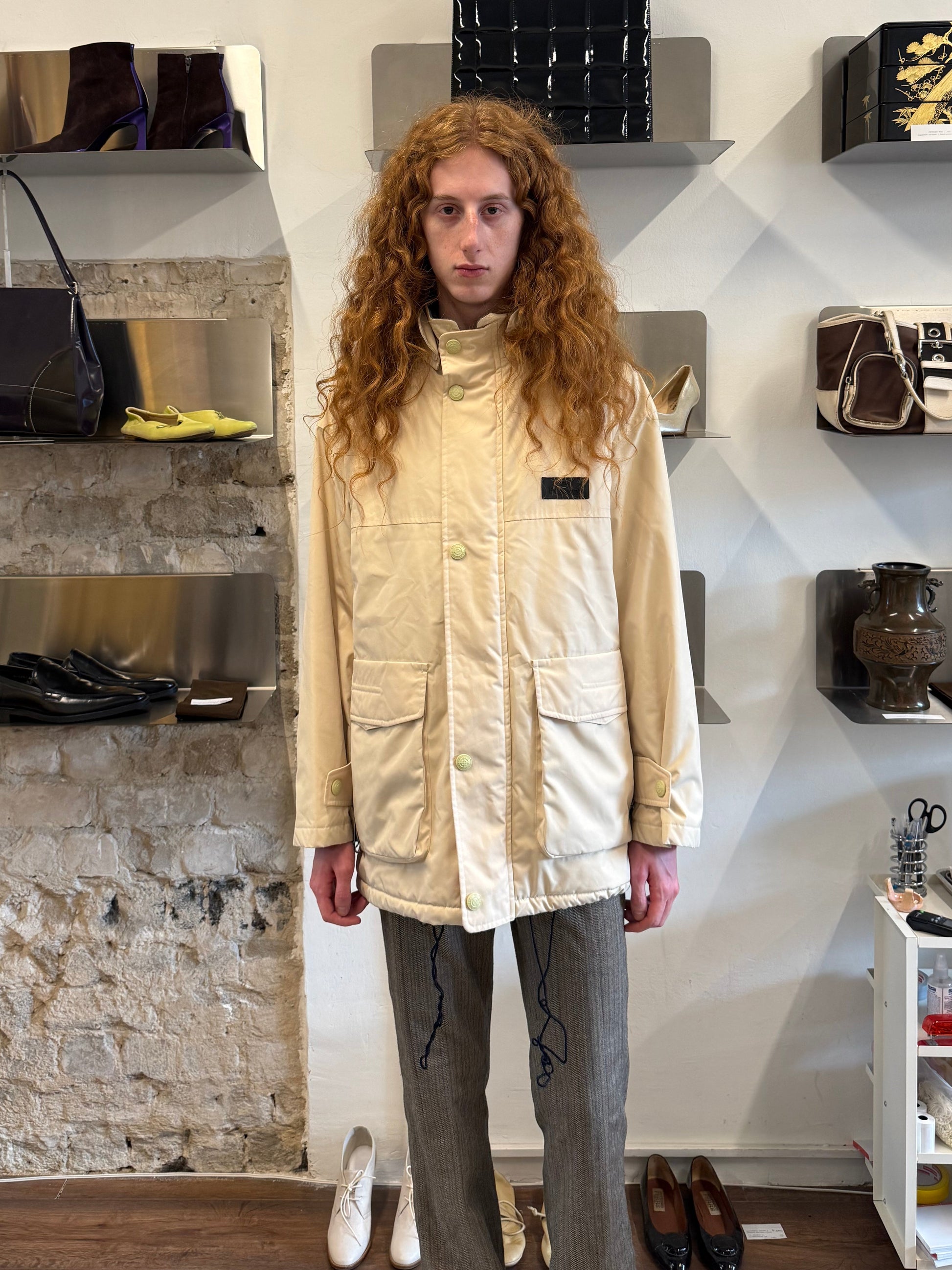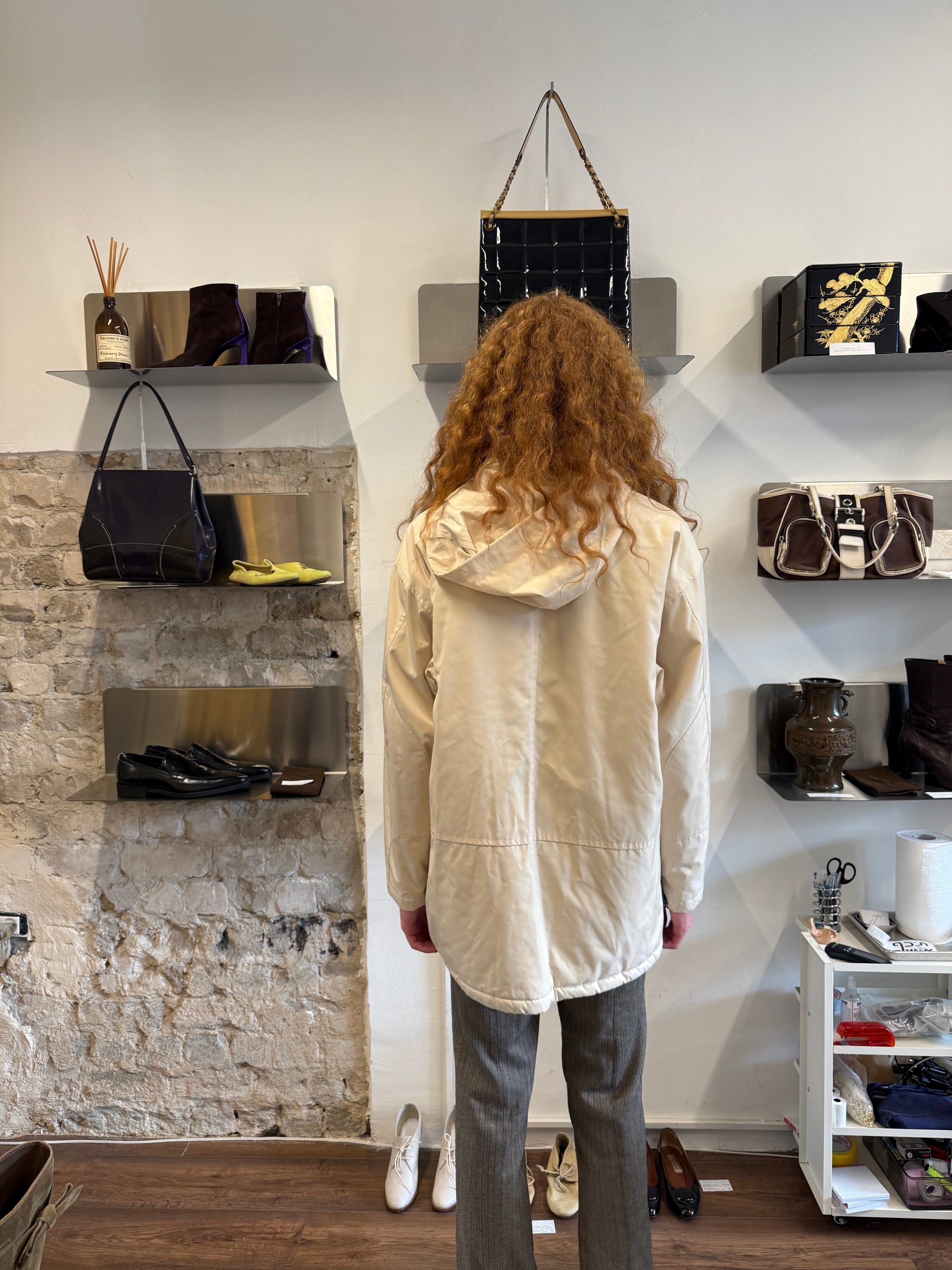 big beige puffer jacket with a detachable hood and fleece lining for extra cold days and nights