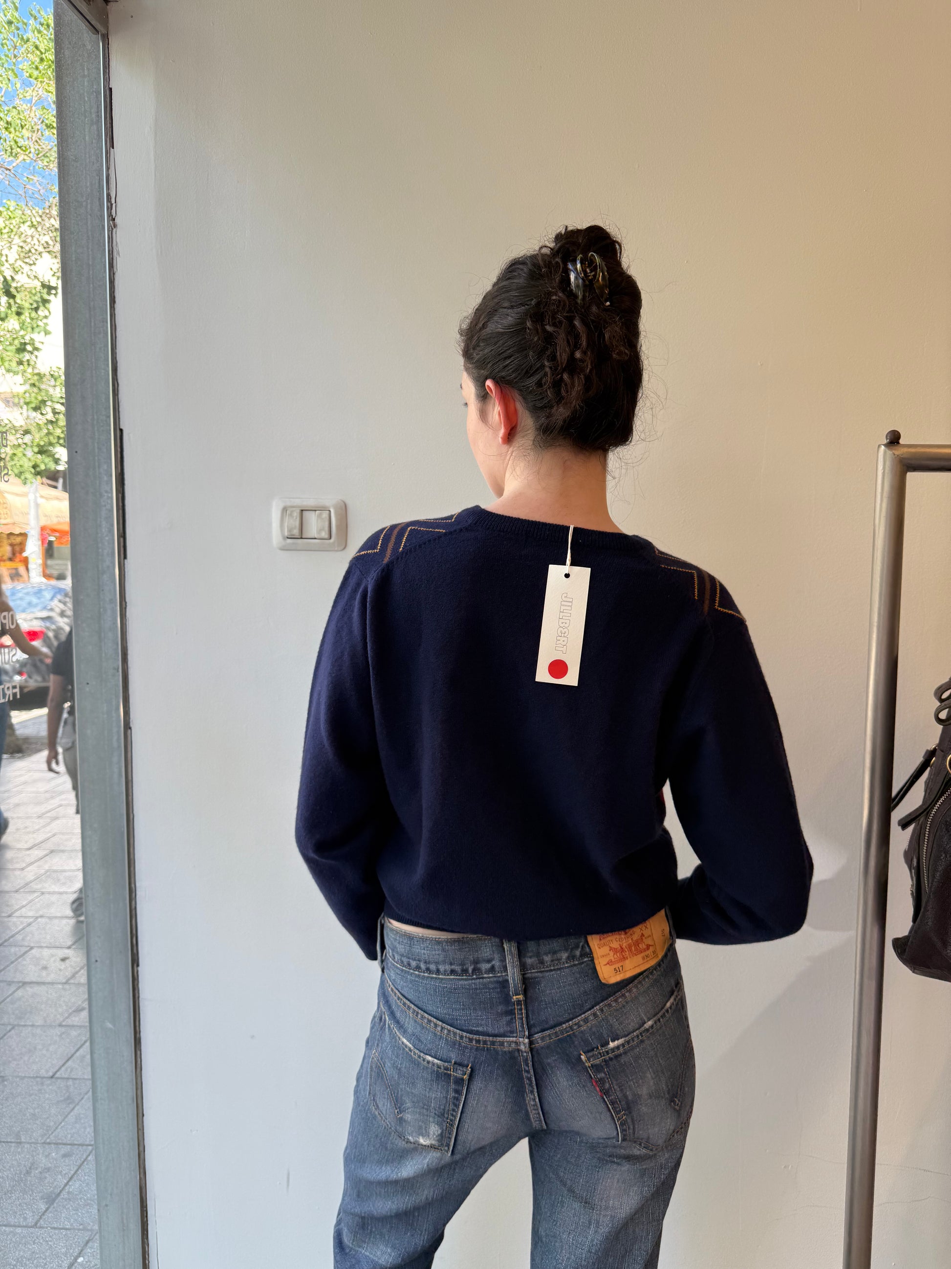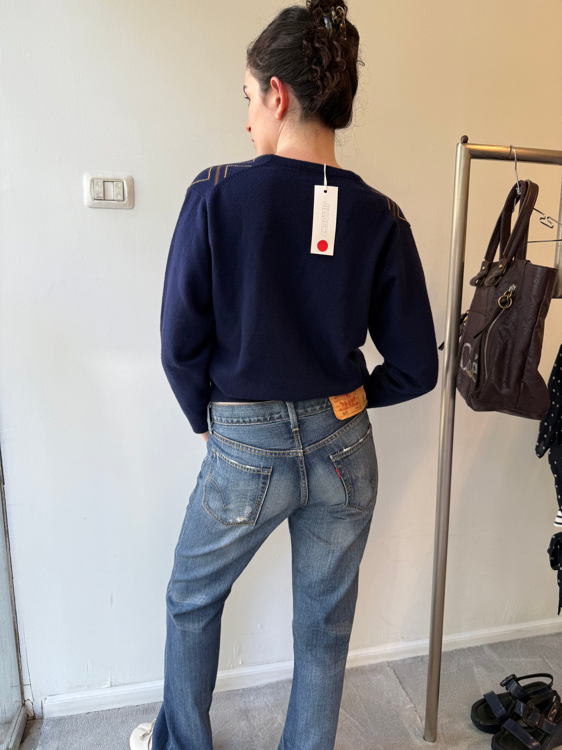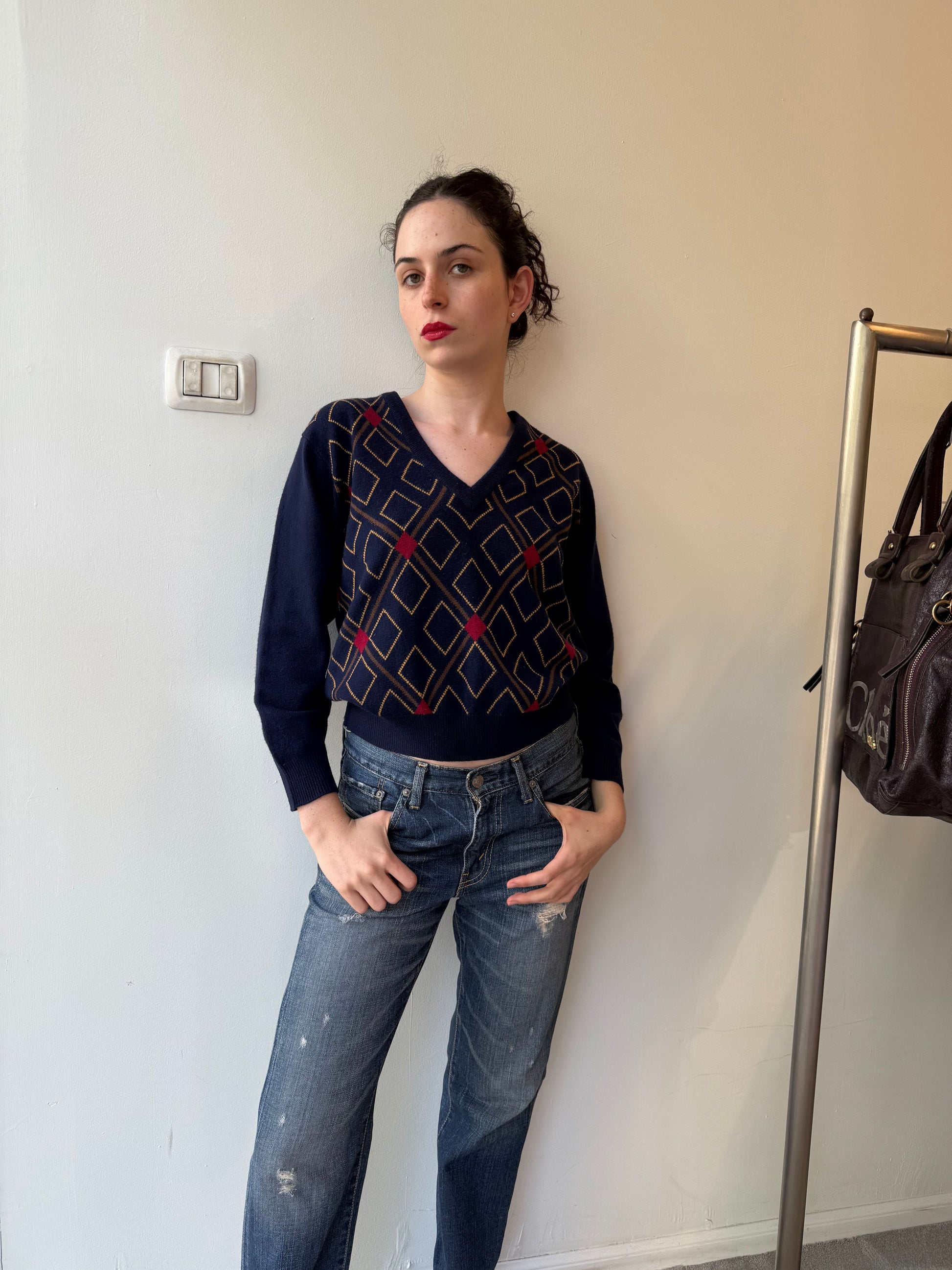 Featuring a luxurious blend of wool and cashmere in a timeless navy shade, accented with Burberrys’ signature geometric check pattern in rich burgundy, beige, and chocolate tones. Classic V-neck and ribbed trims complete the effortlessly chic vintage aesthetic.