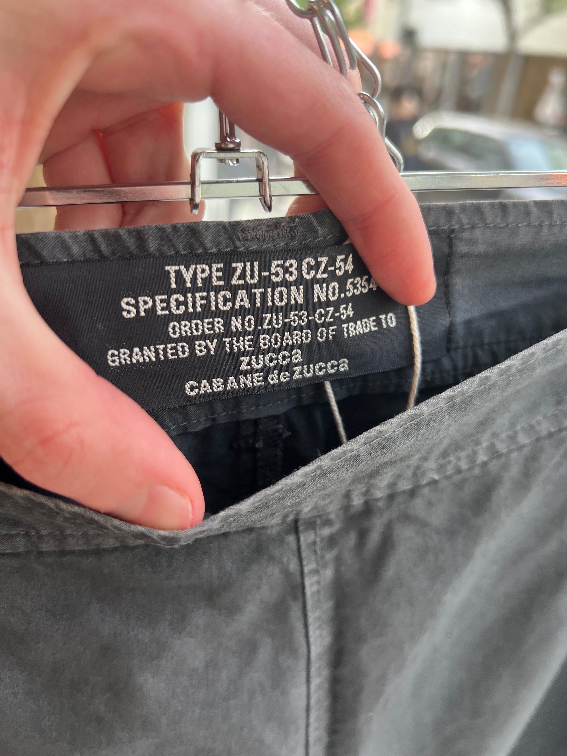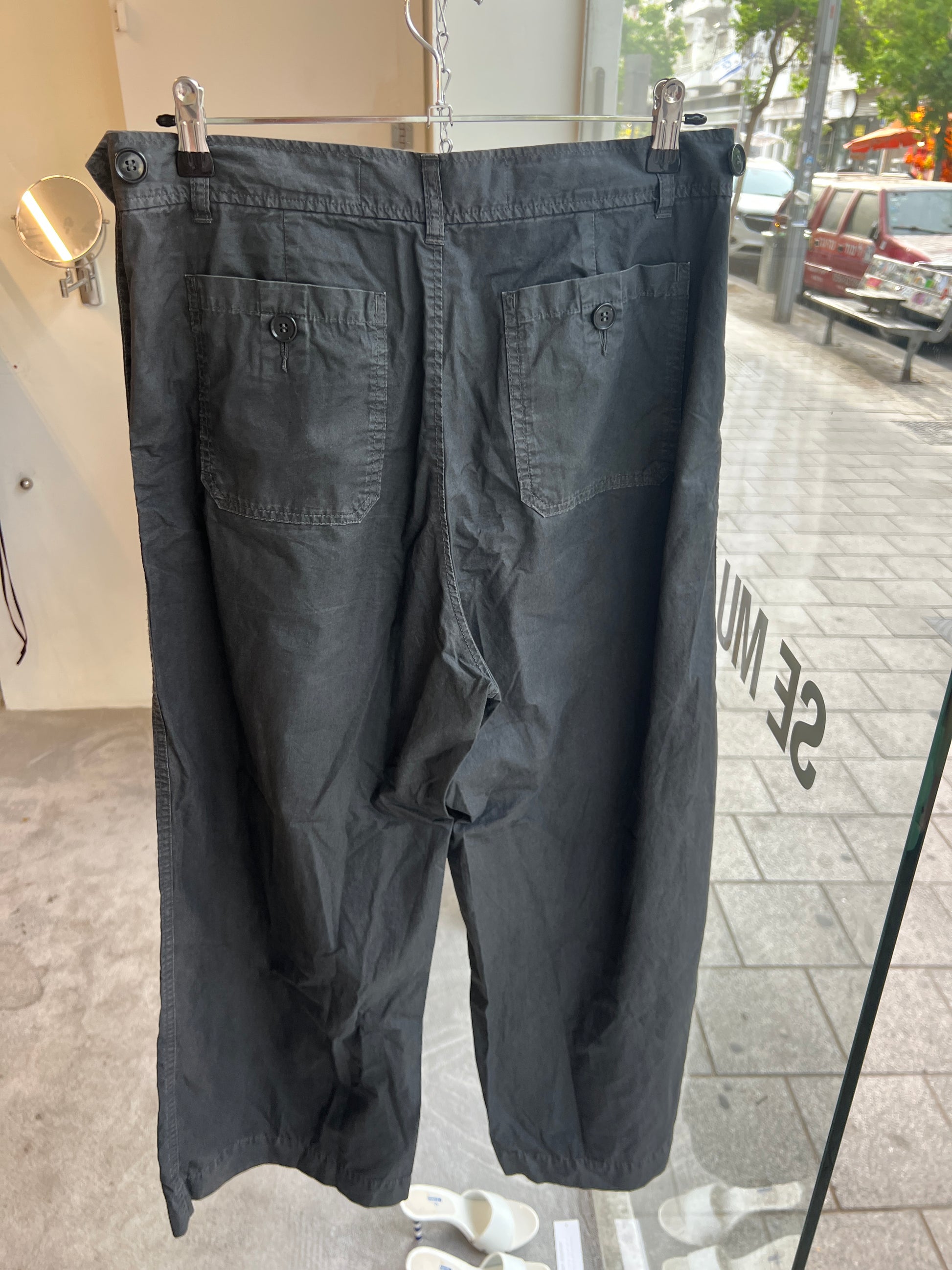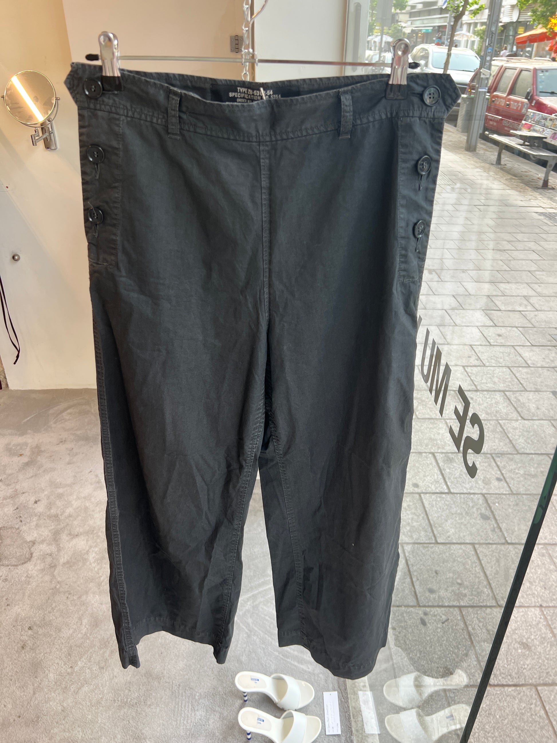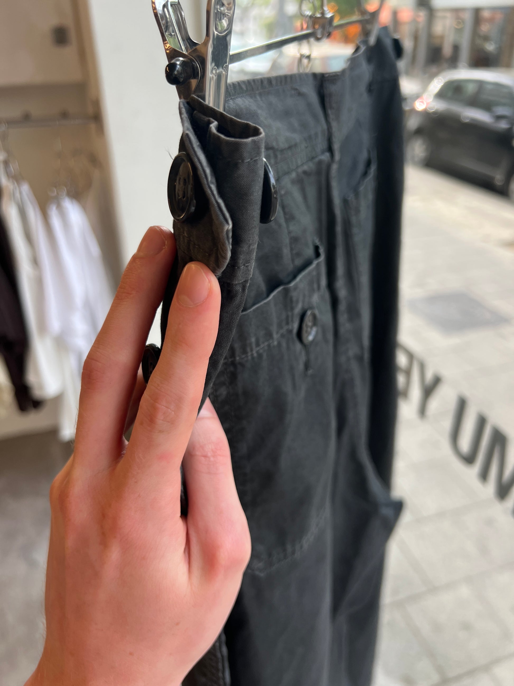 dark grey sailor cargo pants with an option to close it on side buttons to make the waist smaller