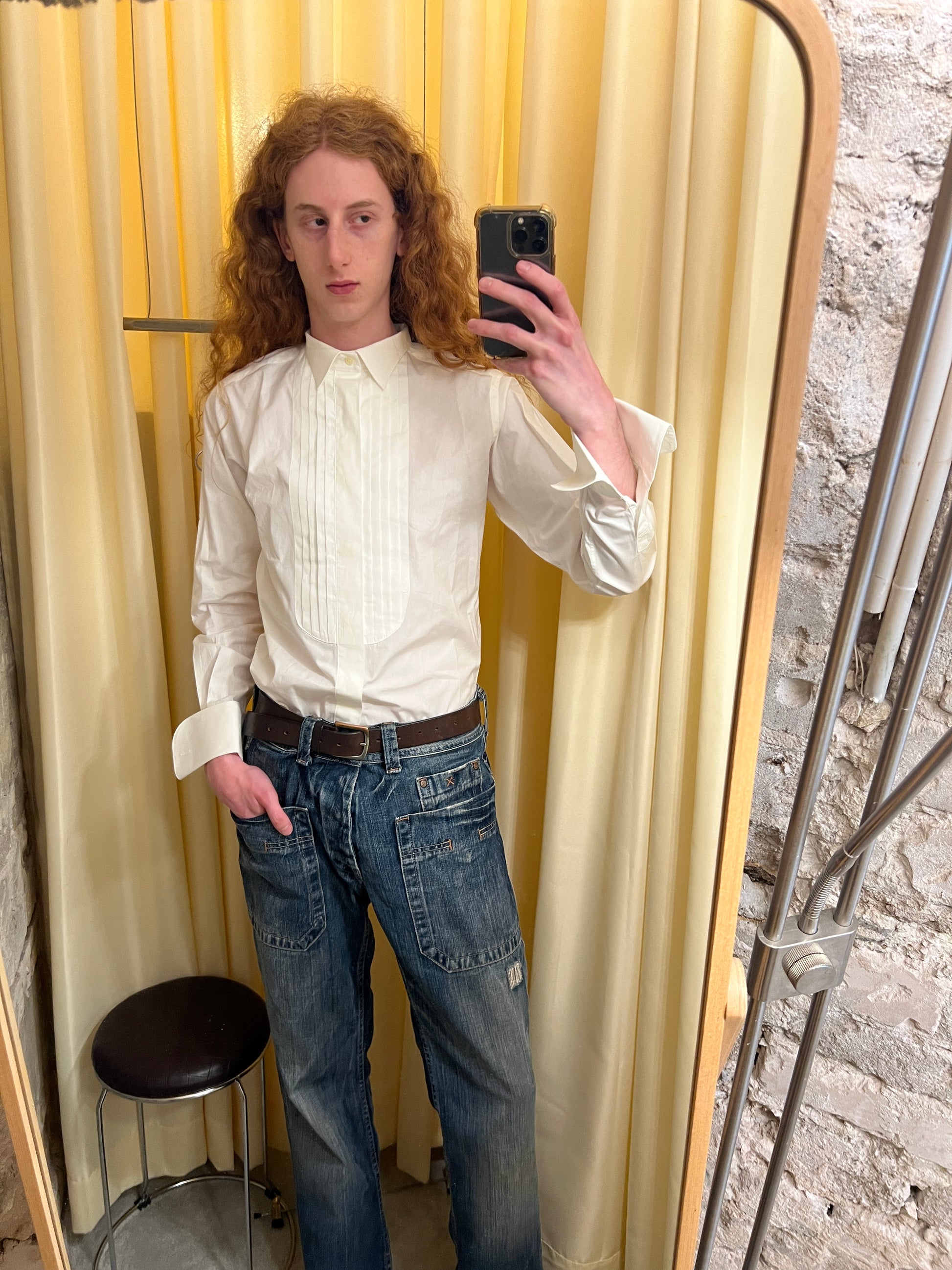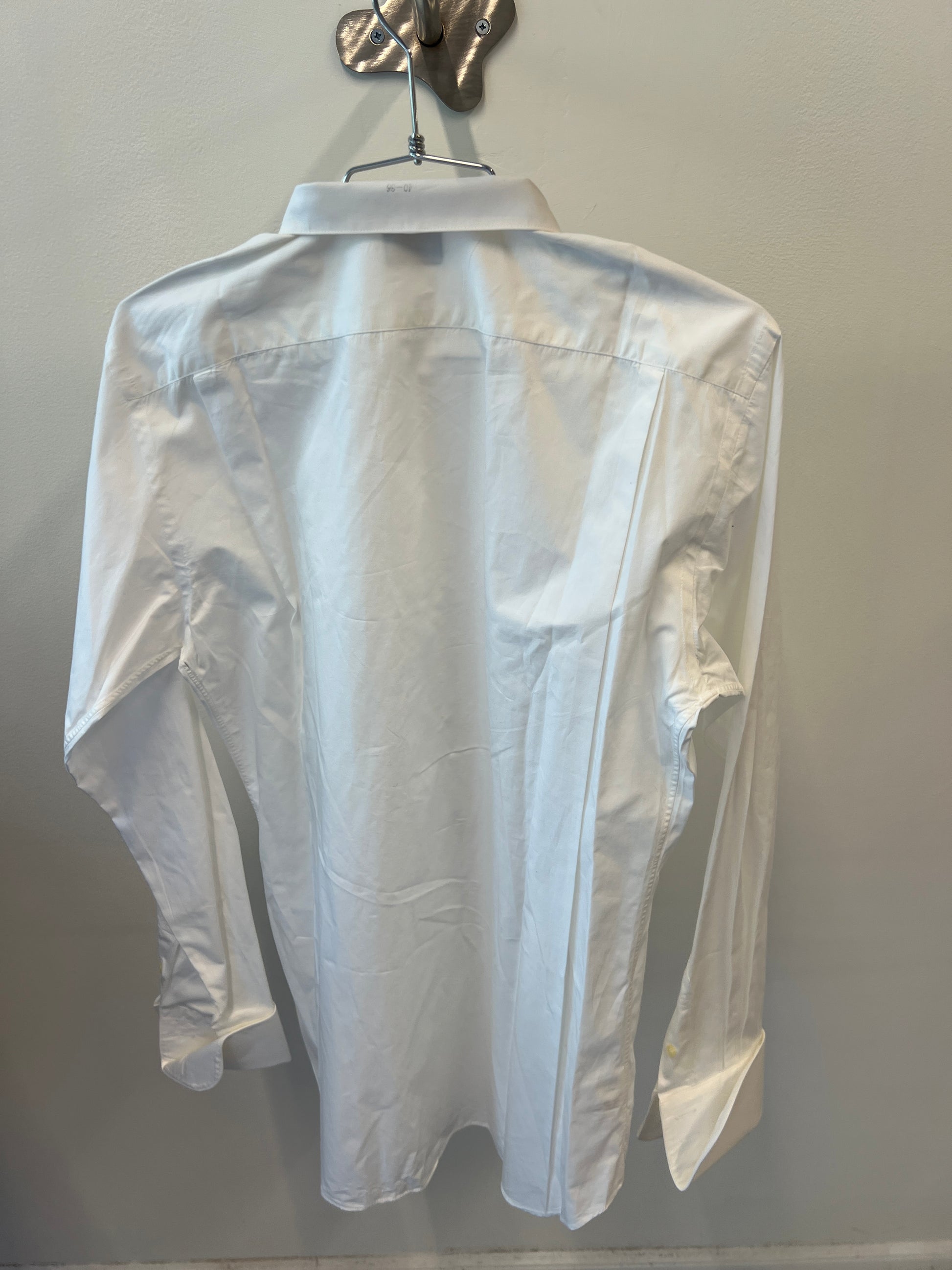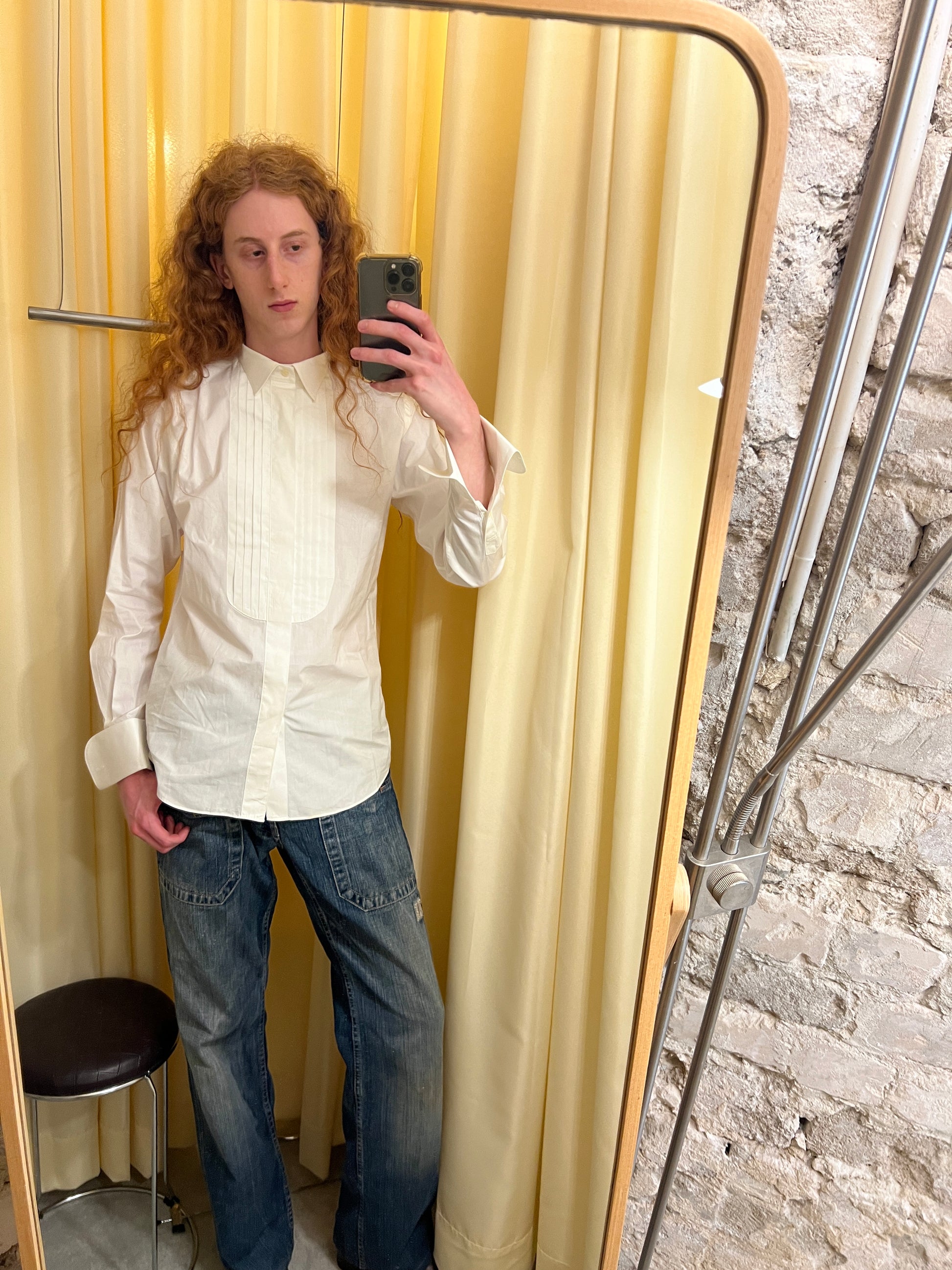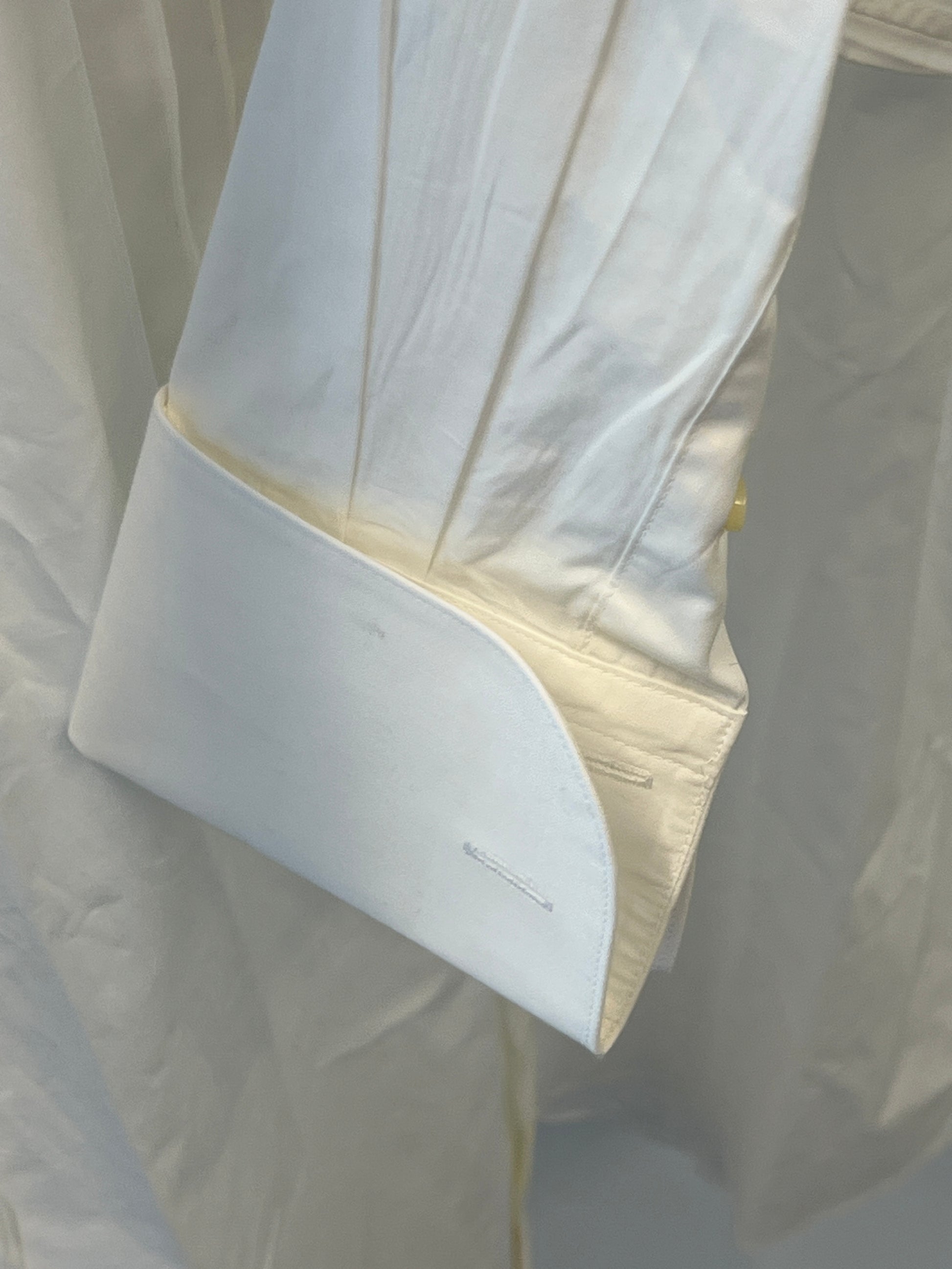white tuxedo style shirt with classic pleat details and stylish cuff foldings