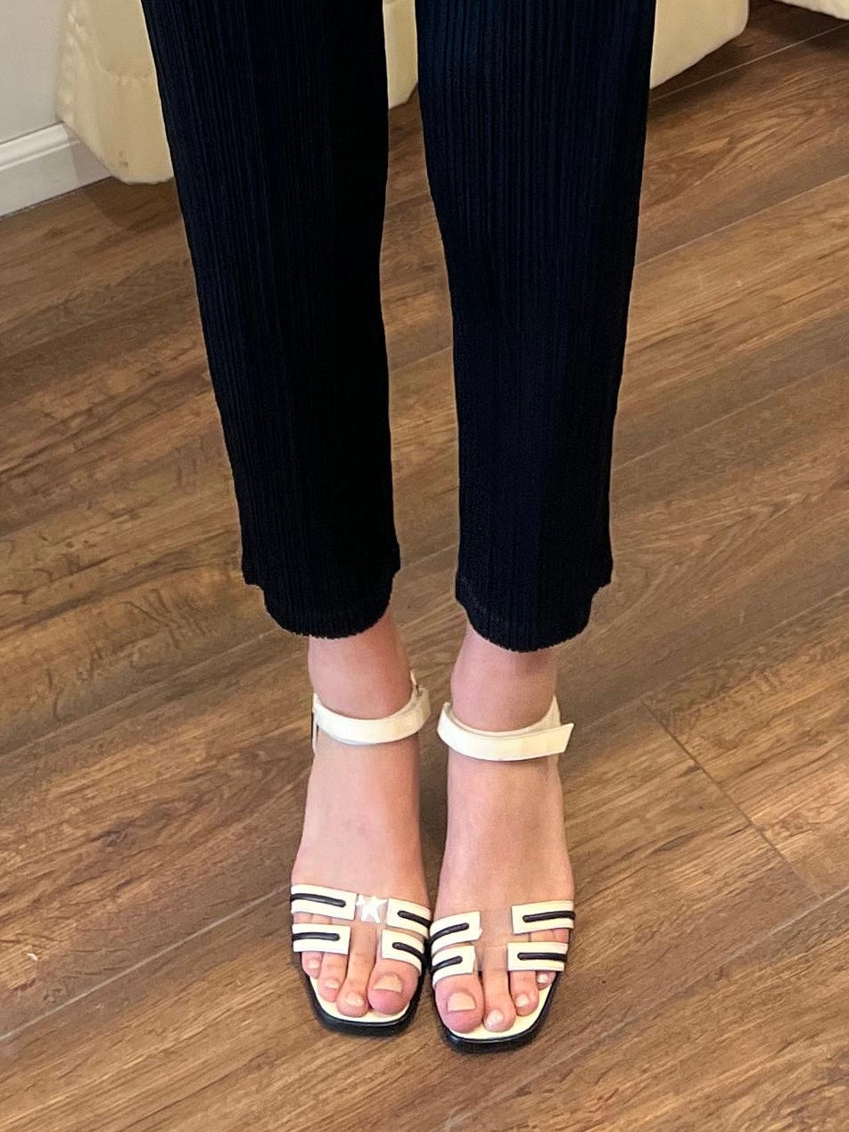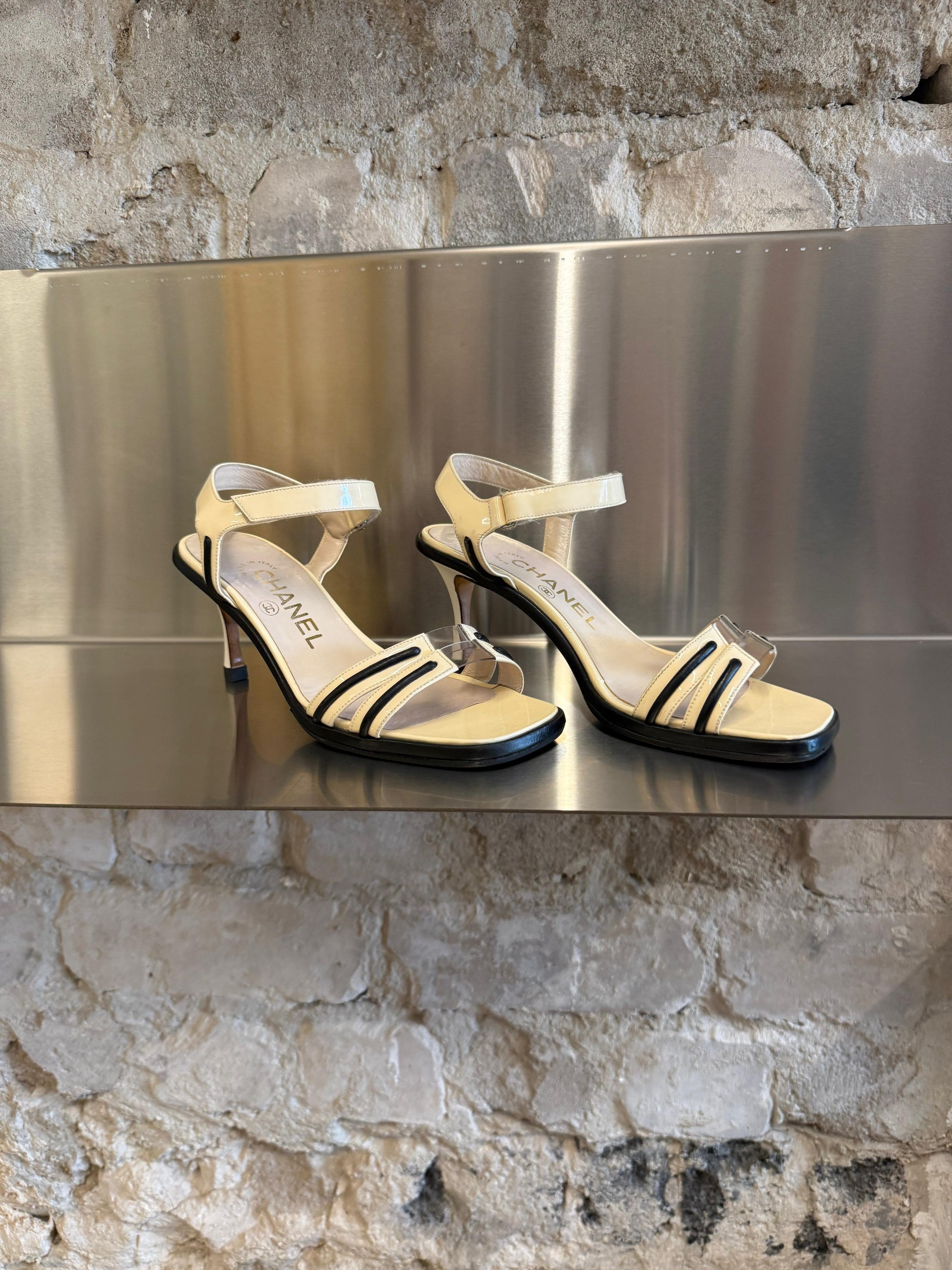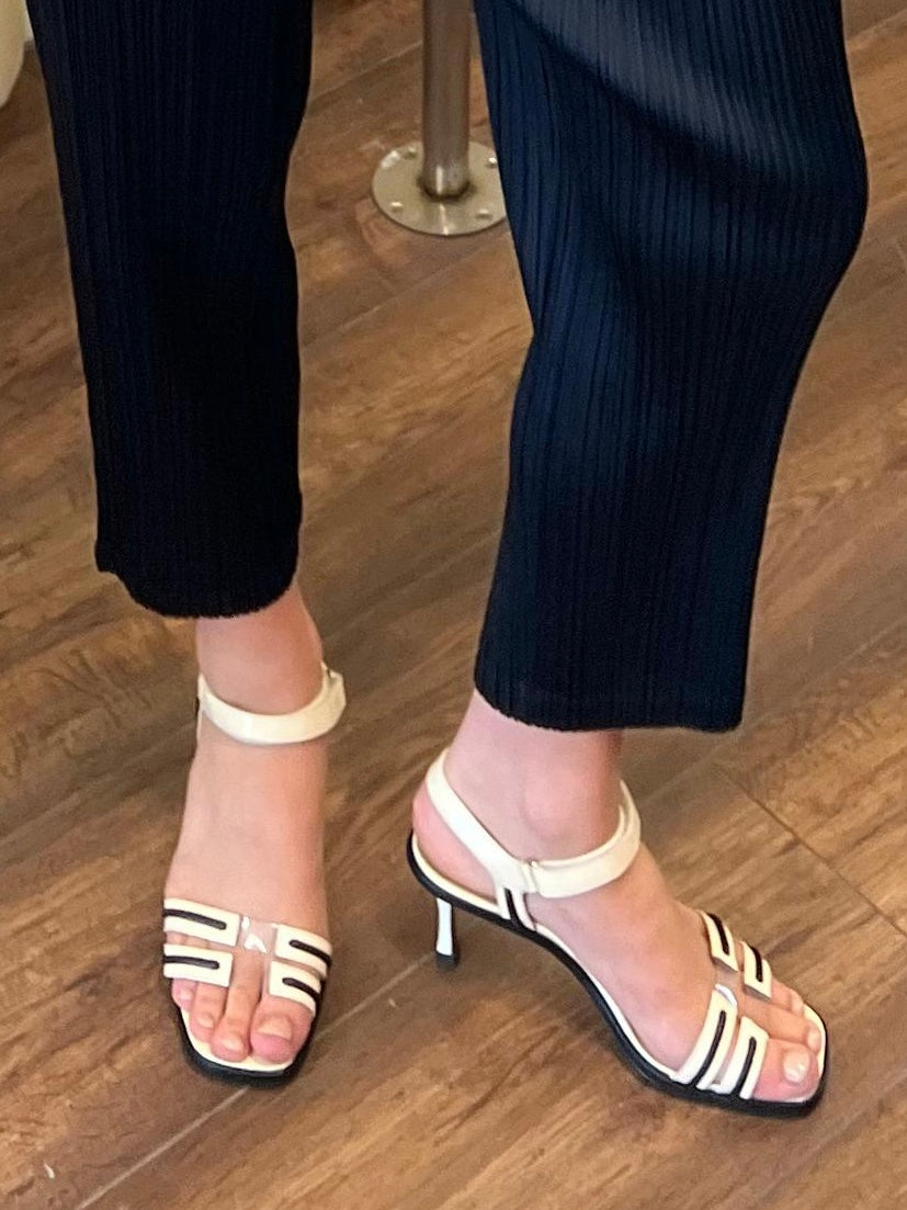 cream sandal heels whit a futuristic look featuring an ankle belt and straps the have black 3D black stripes and clear plastic in the middle of it