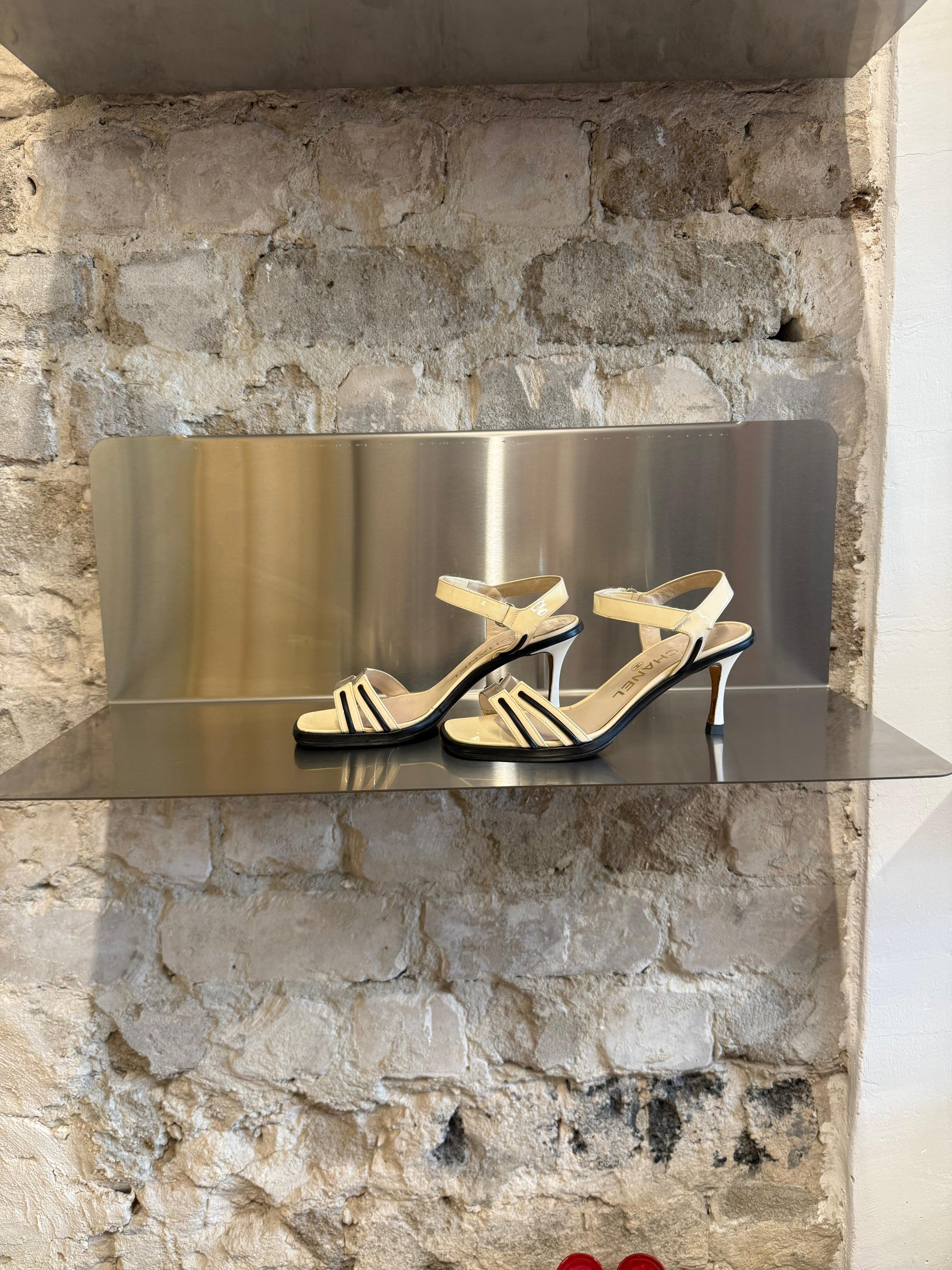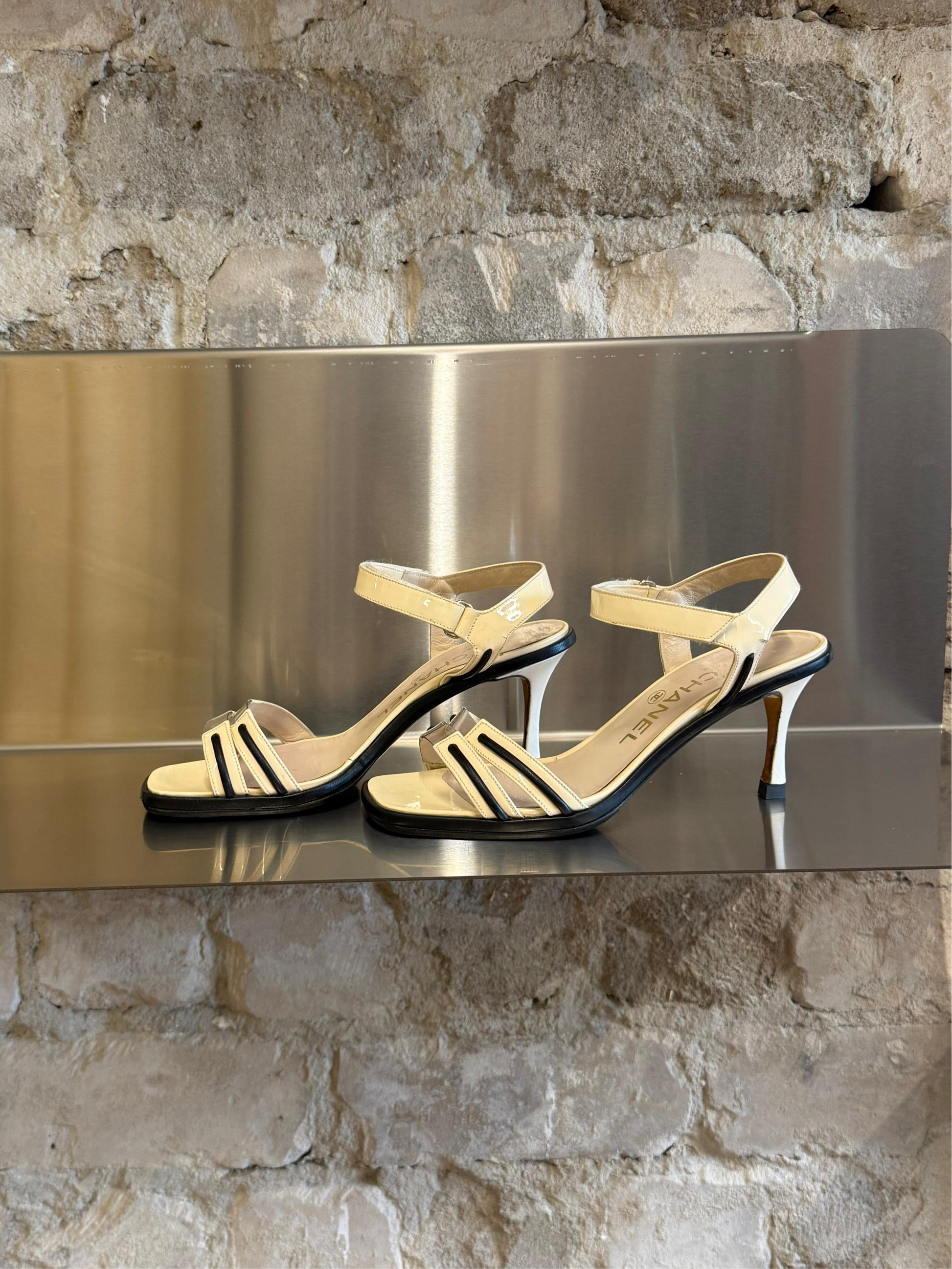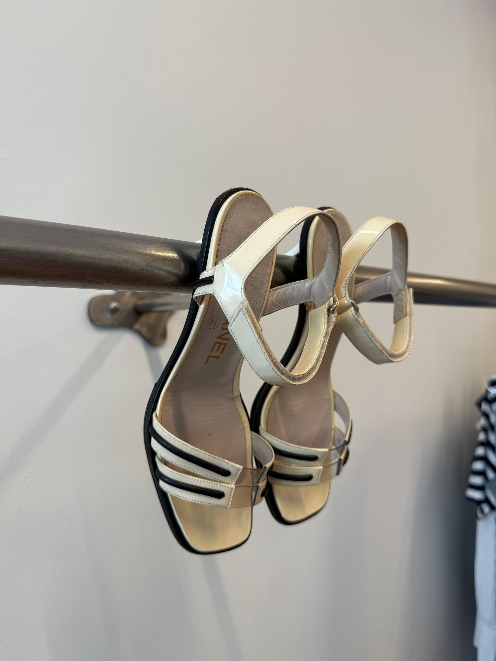 cream sandal heels whit a futuristic look featuring an ankle belt and straps the have black 3D black stripes and clear plastic in the middle of it