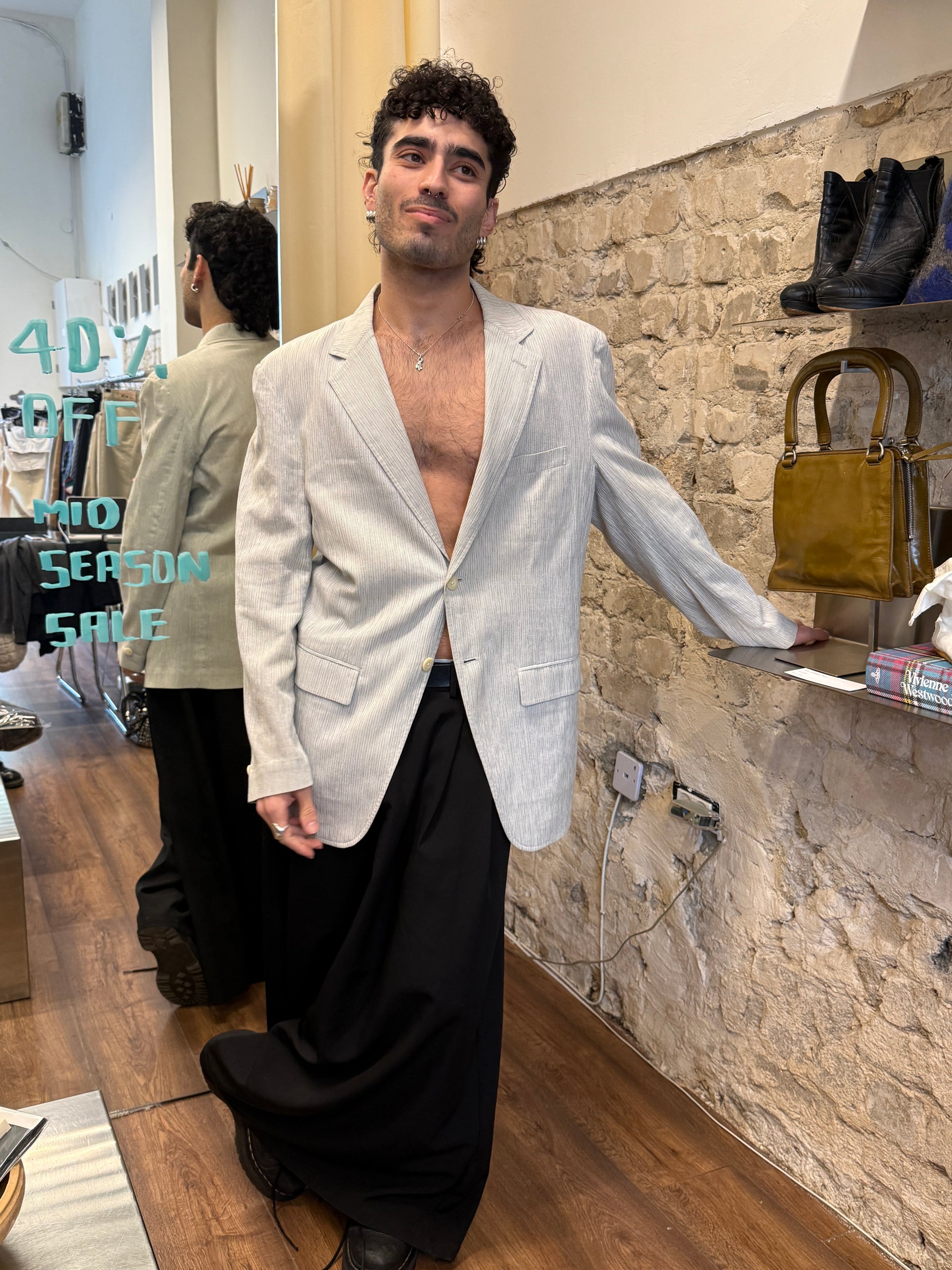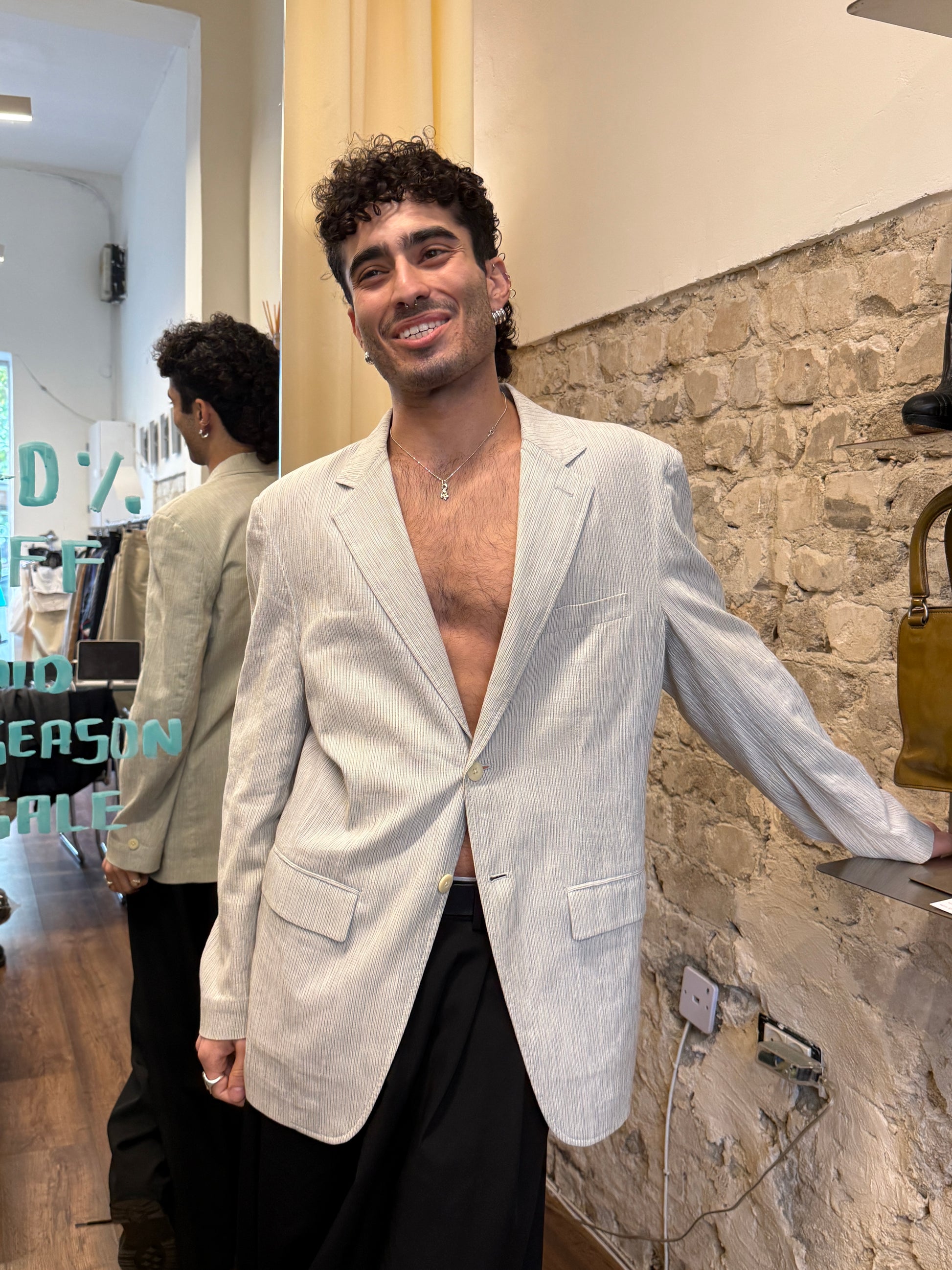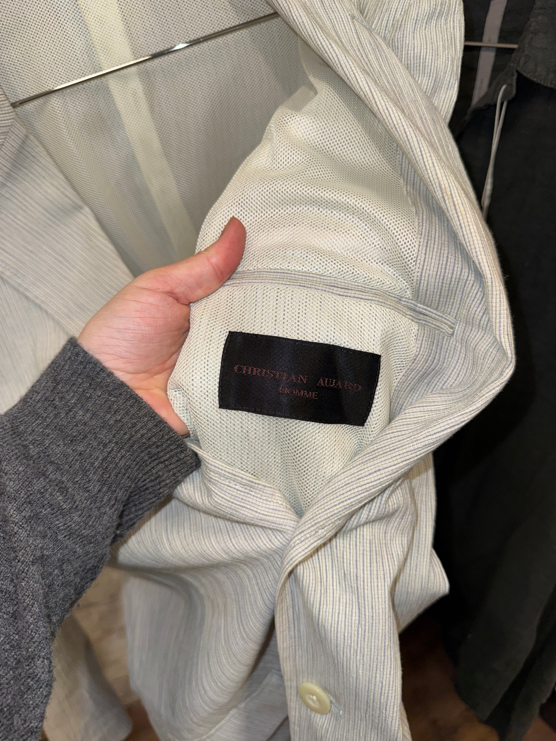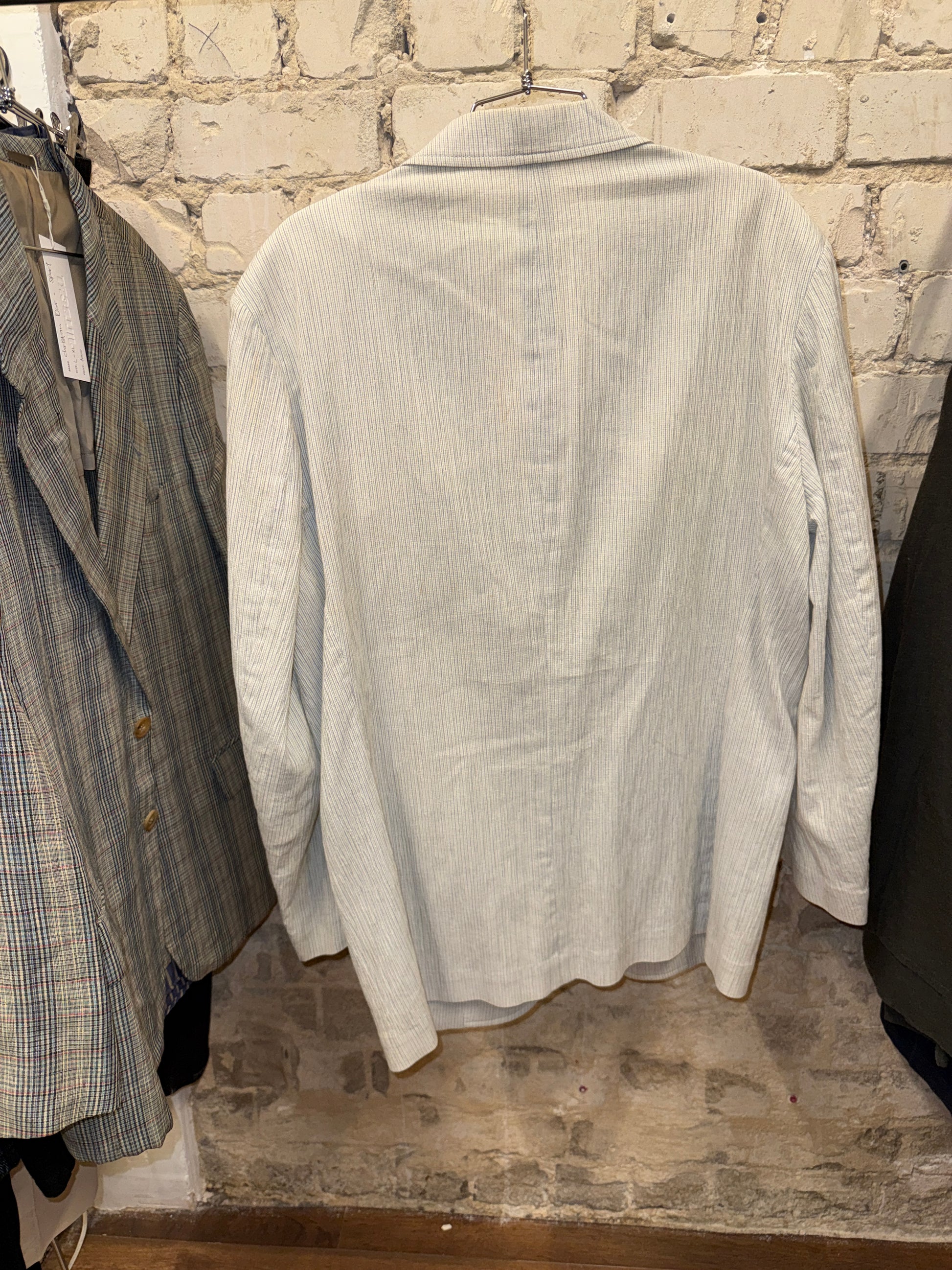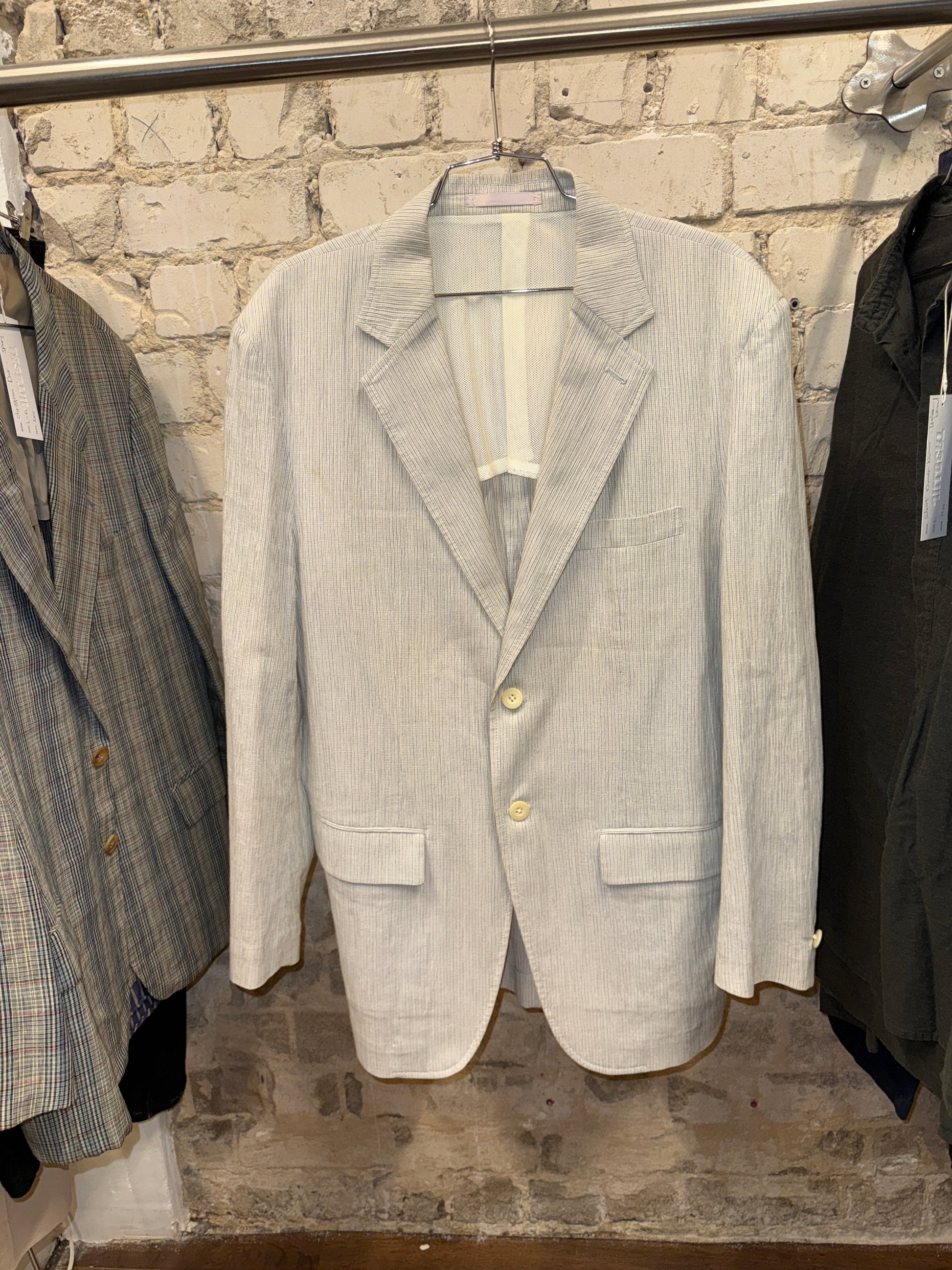 Lightweight pinstripe blazer in an off-white tone with subtle blue stripes. Soft, unstructured construction with classic notch lapels, flap pockets and single-breasted closure. Fully breathable mesh lining inside for summer wear. Sharp but relaxed, evening-ready without feeling formal.