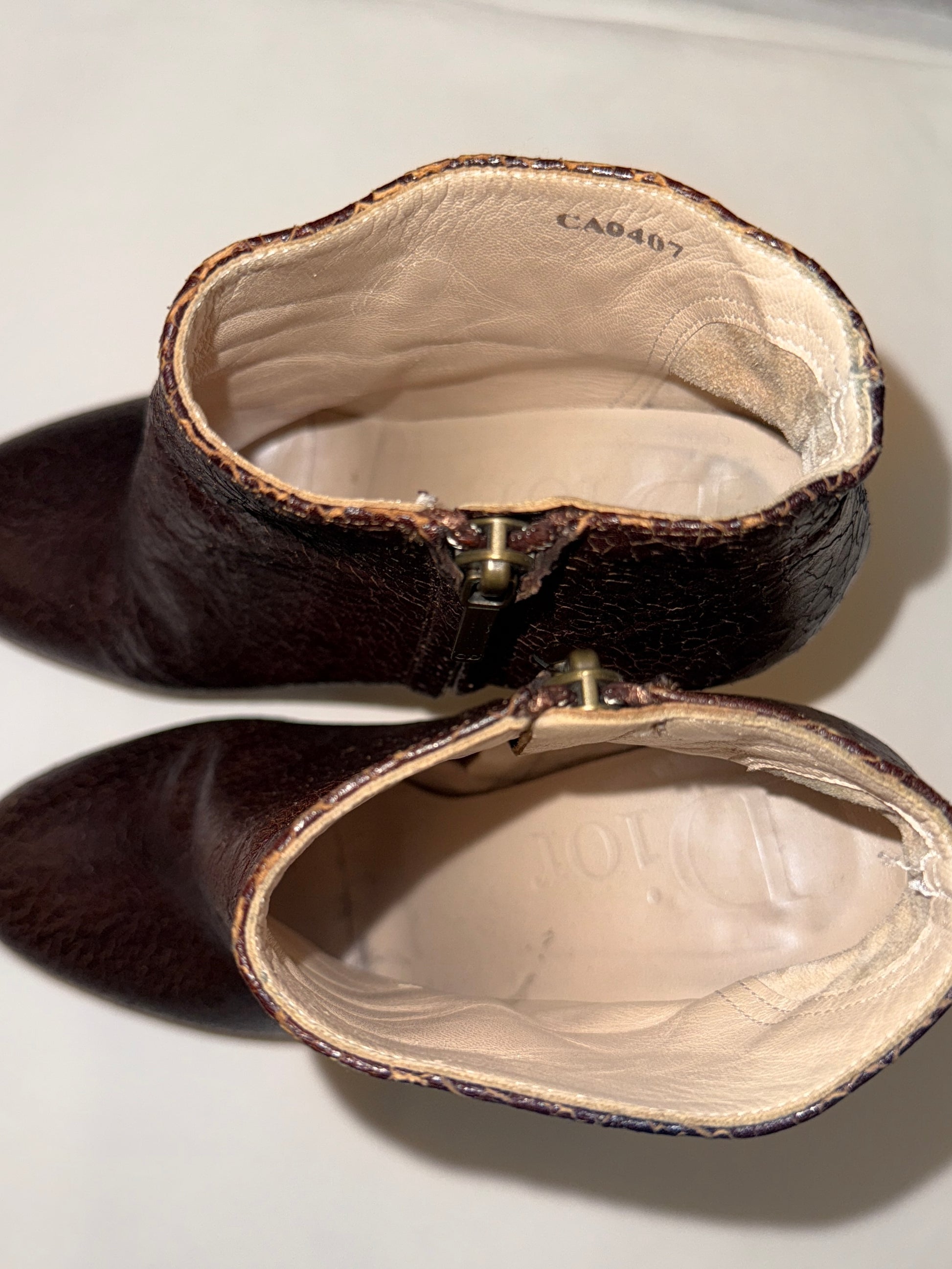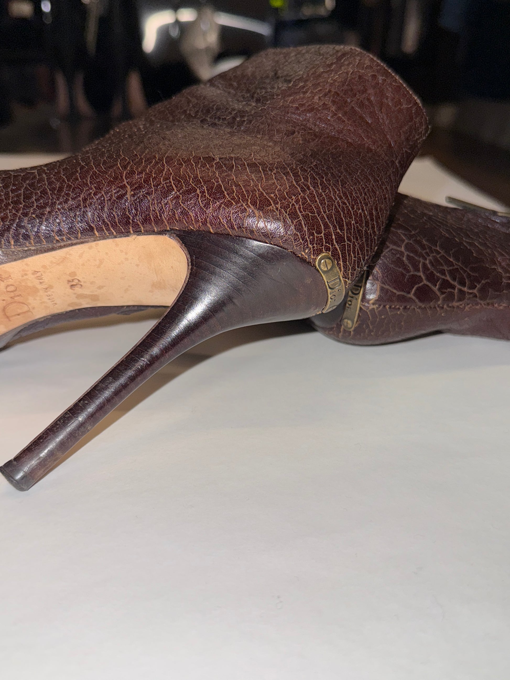Dark brown crackled leather with rich patina, rounded almond toe, front zip closure and slim high heel with a subtle platform for balance. Elegant yet edgy silhouette, very Dior of the late 2000s.