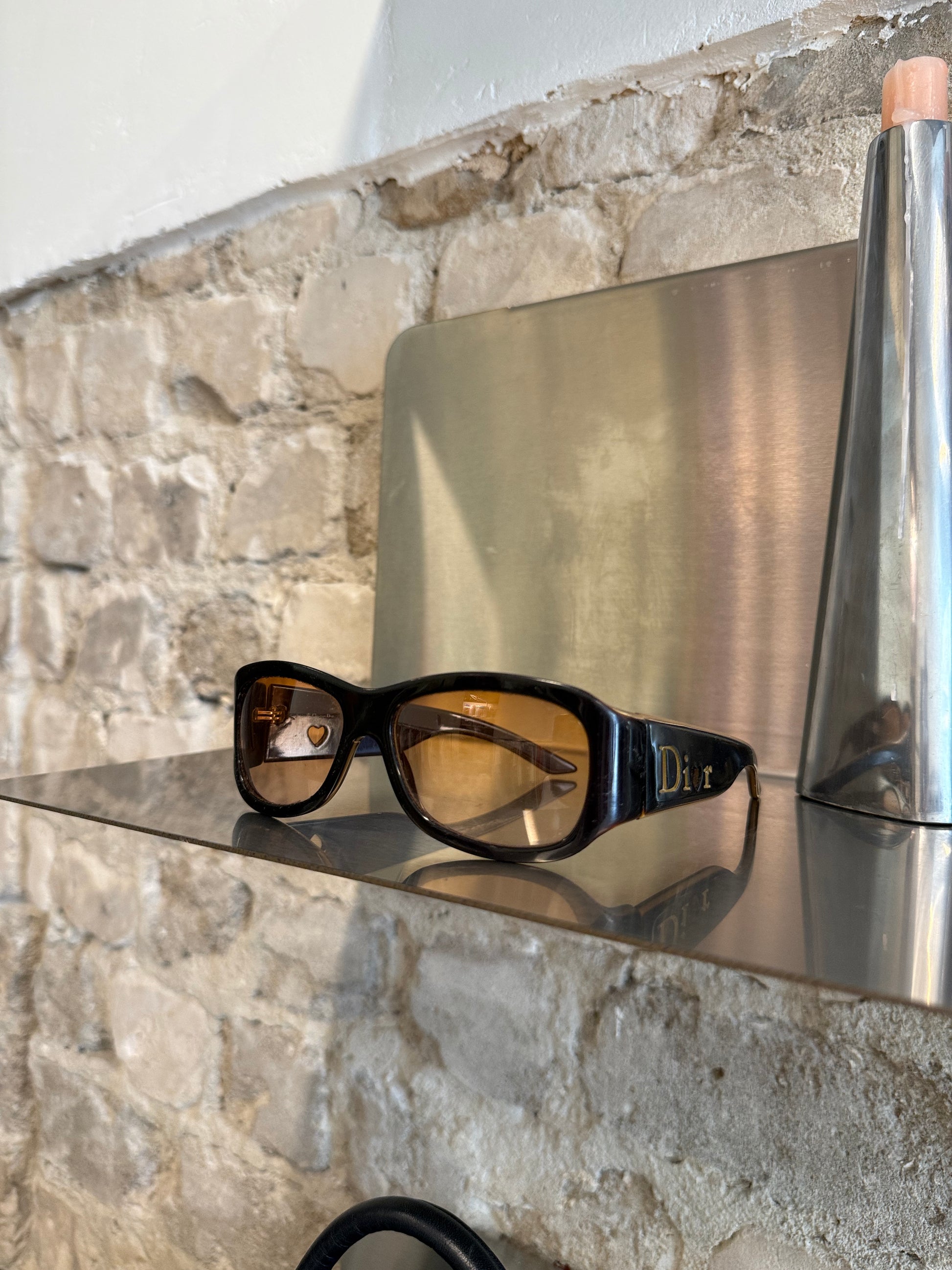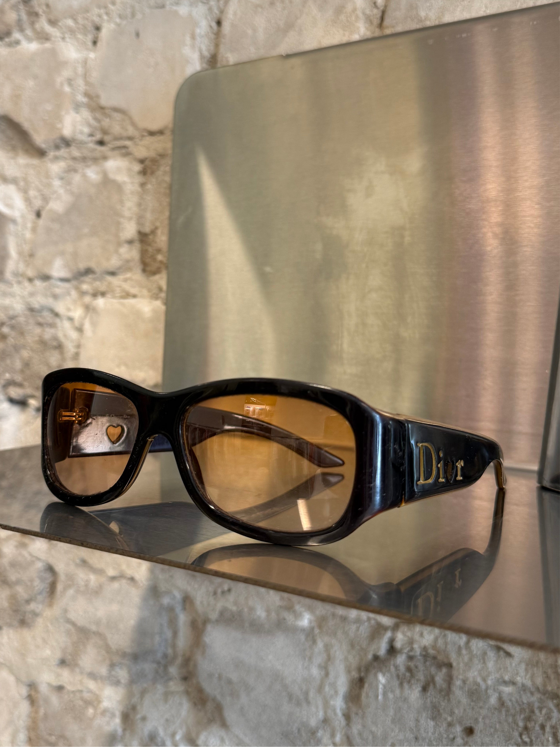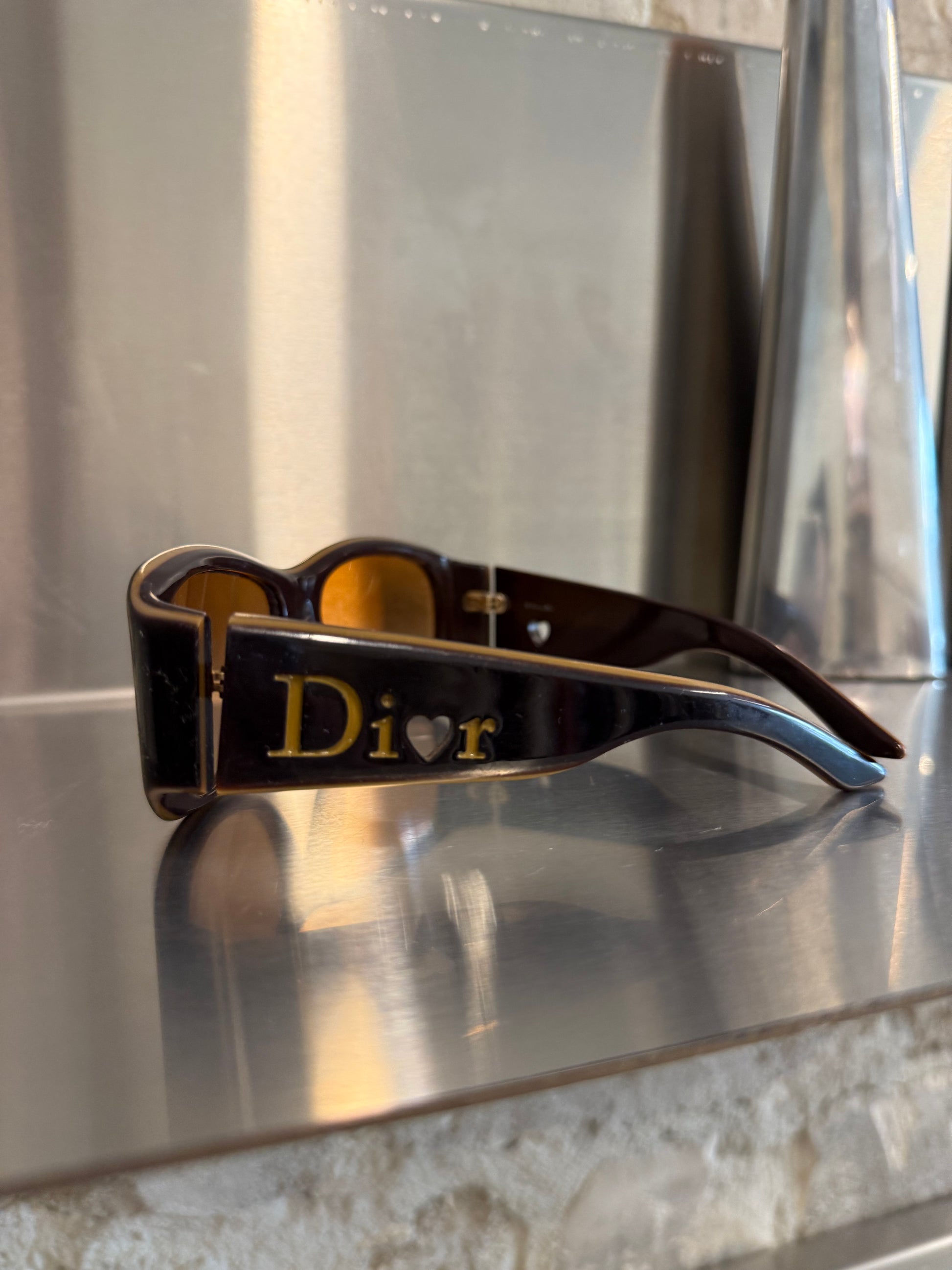 Featuring glossy brown acetate frames, golden Dior logo with a heart cut-out, warm amber lenses, and a chunky Y2K rectangle fit.