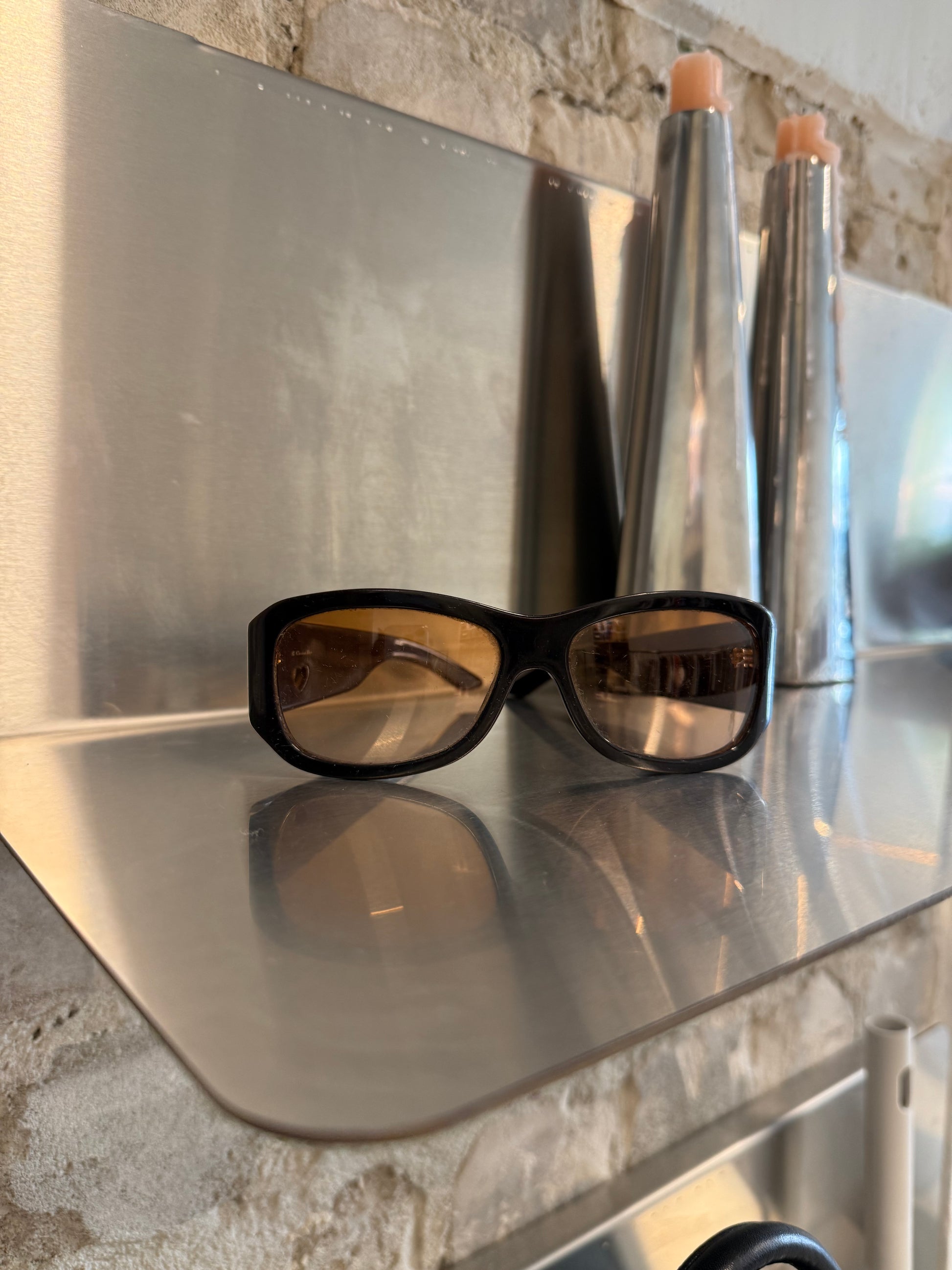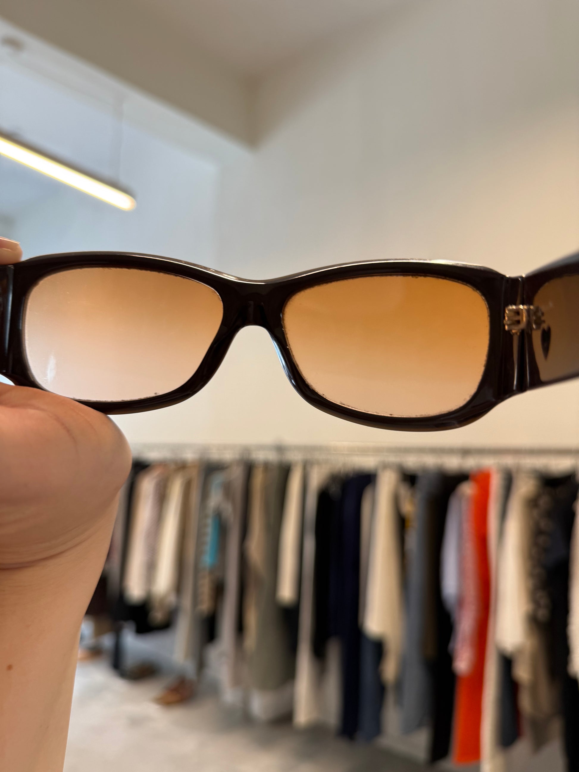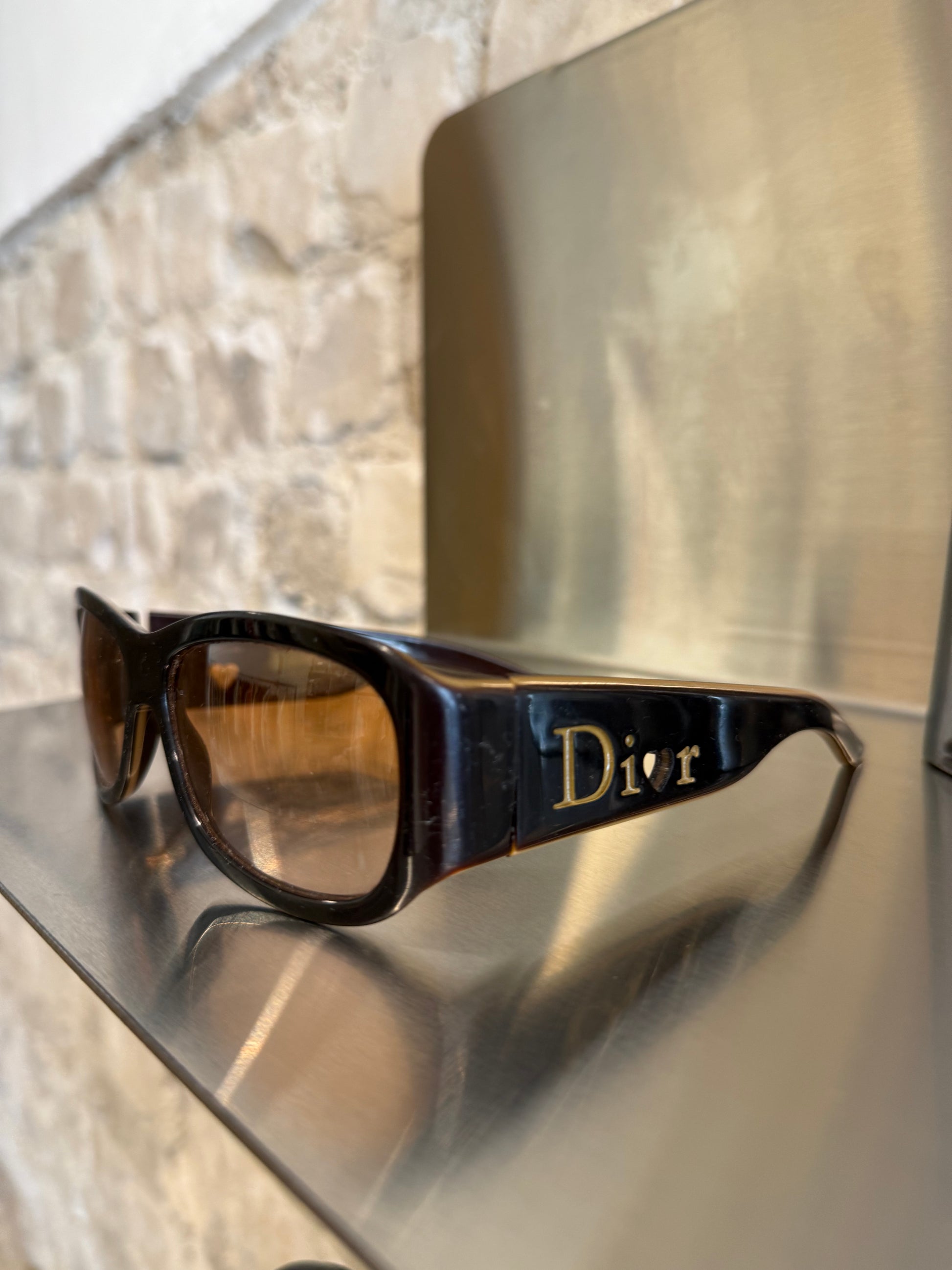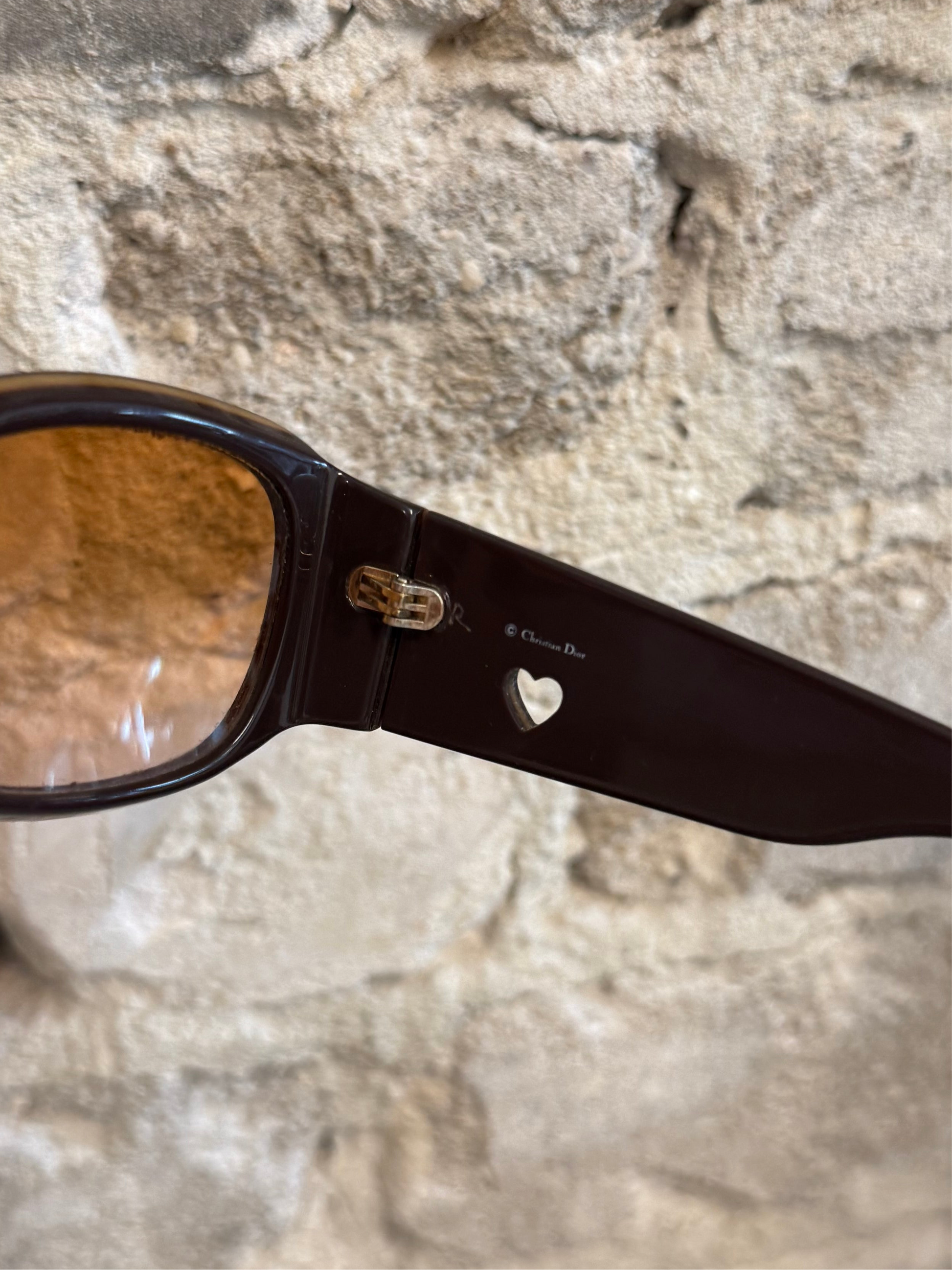 Featuring glossy brown acetate frames, golden Dior logo with a heart cut-out, warm amber lenses, and a chunky Y2K rectangle fit.