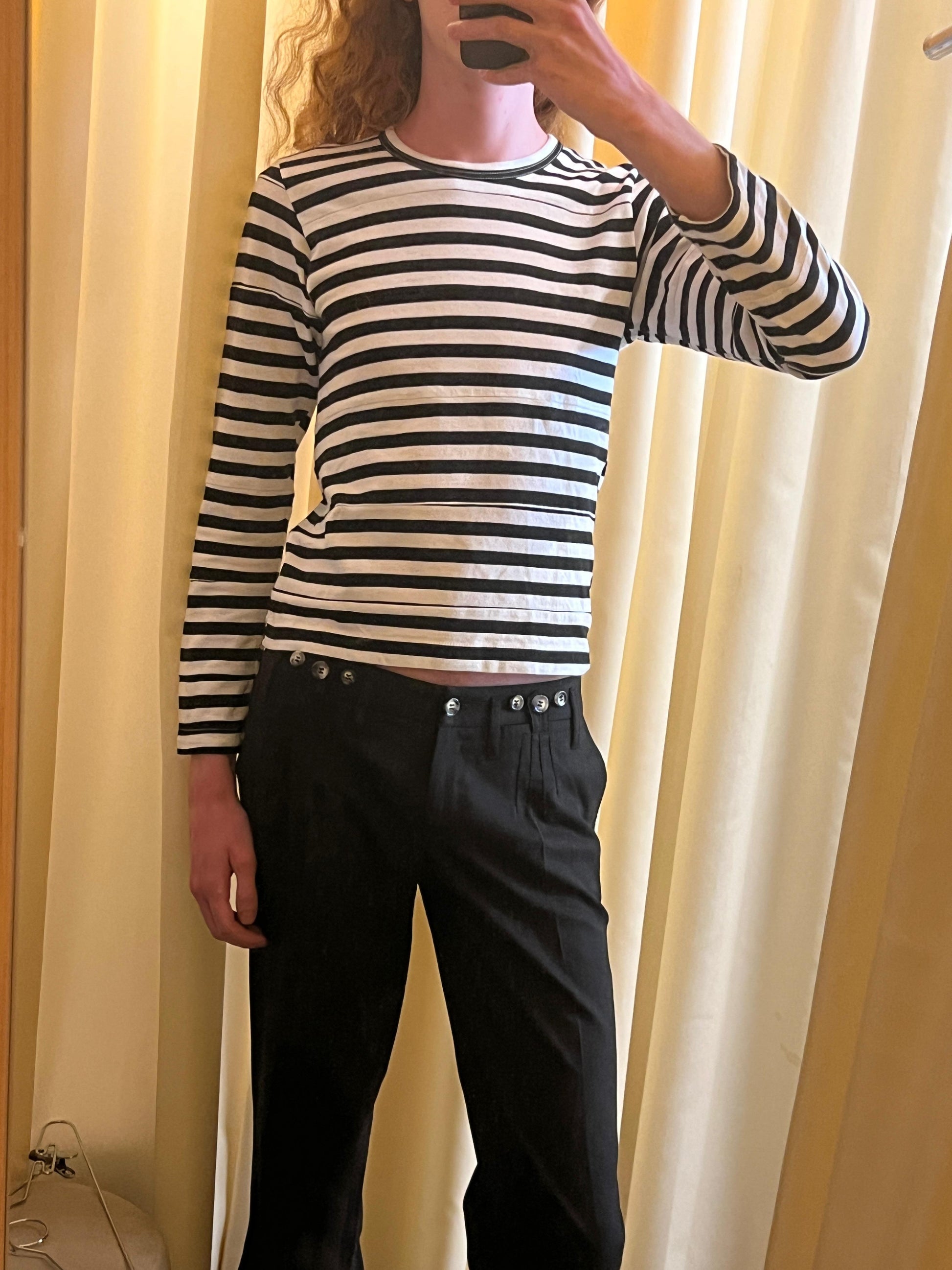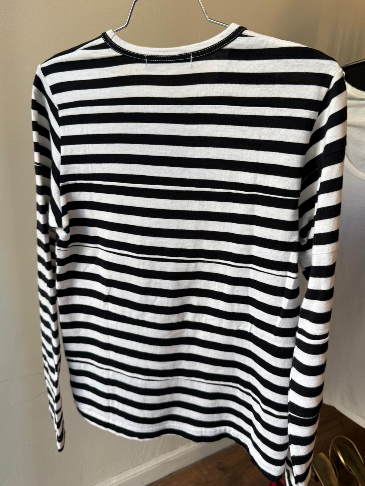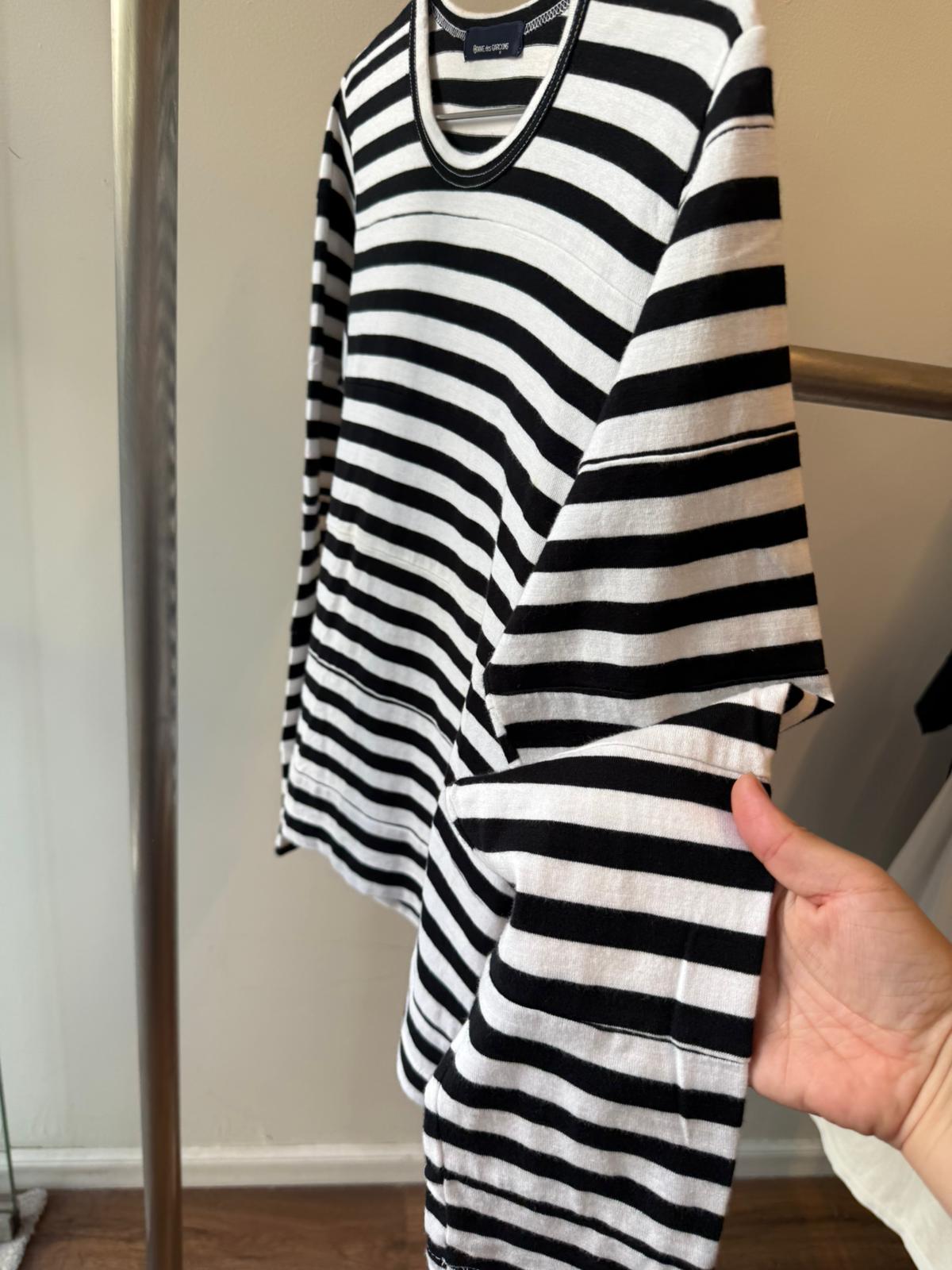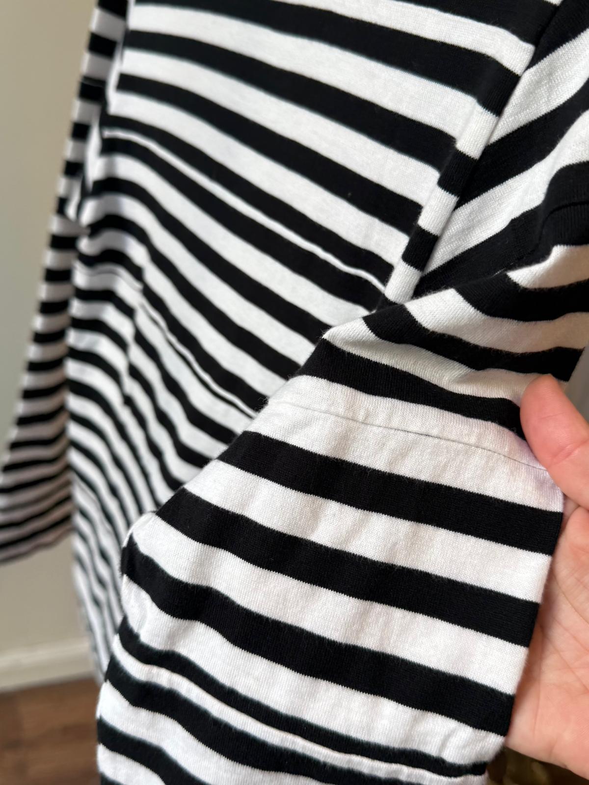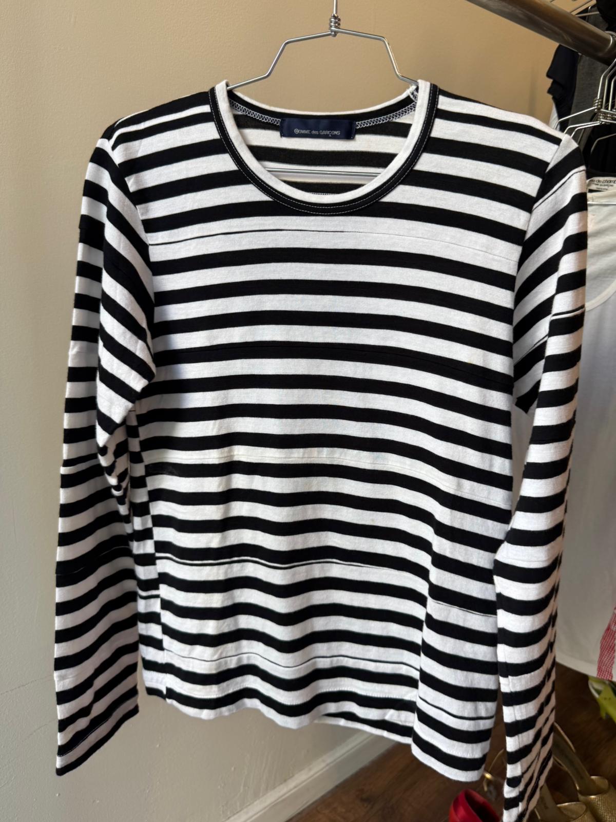 white simple long sleeve t-shirt with black stripes made in a cut & sew technique to create a 3-D effect