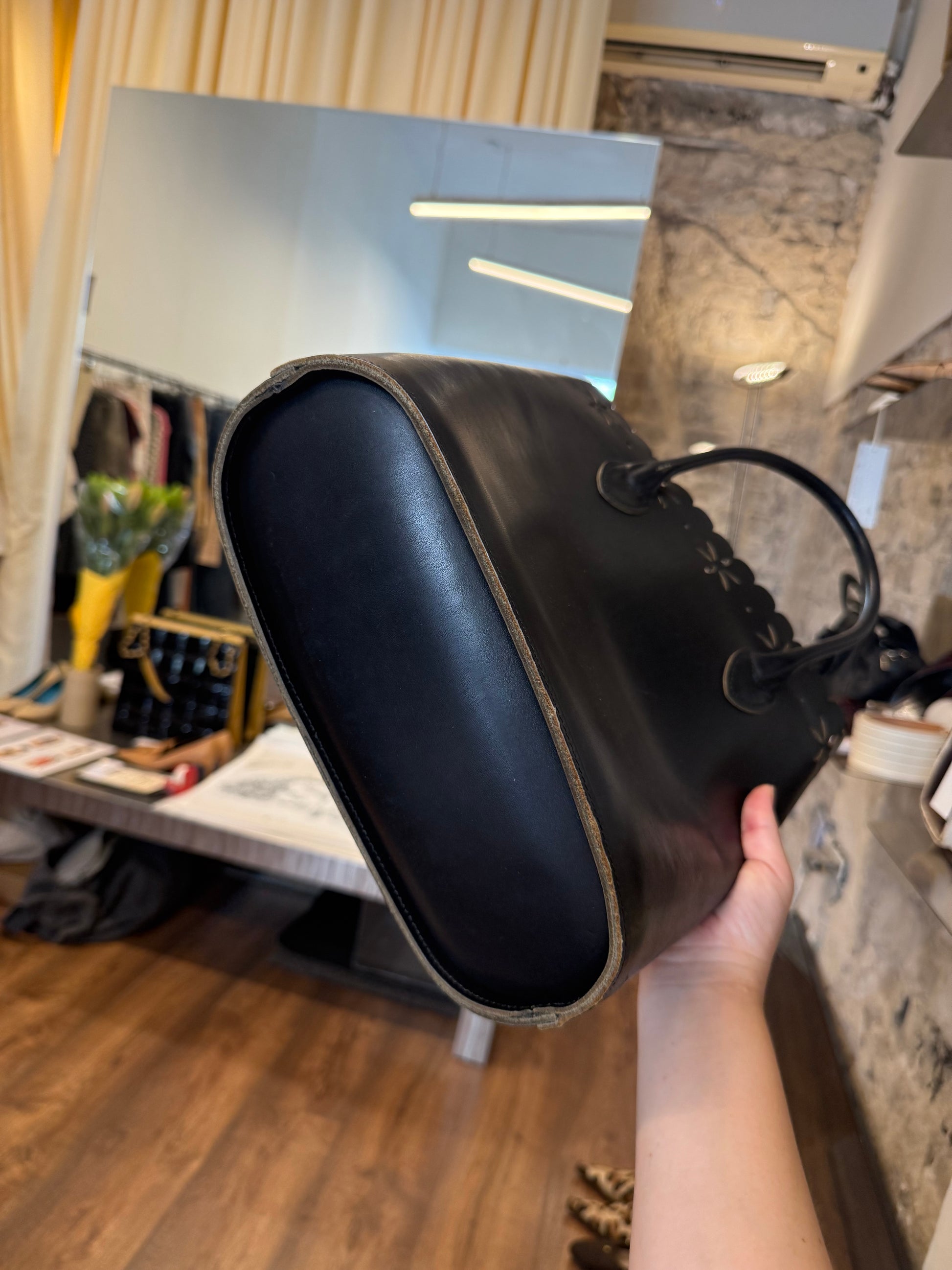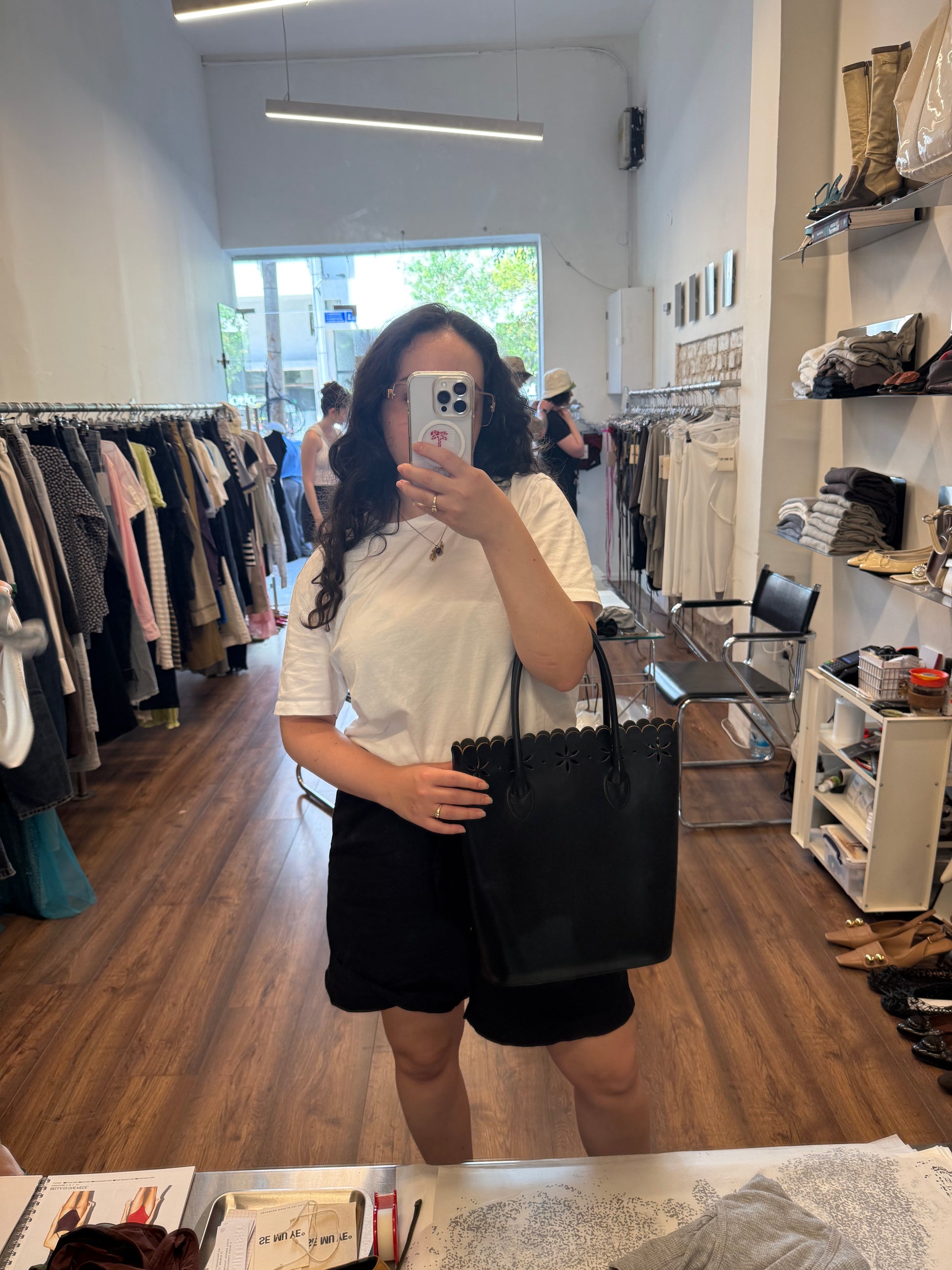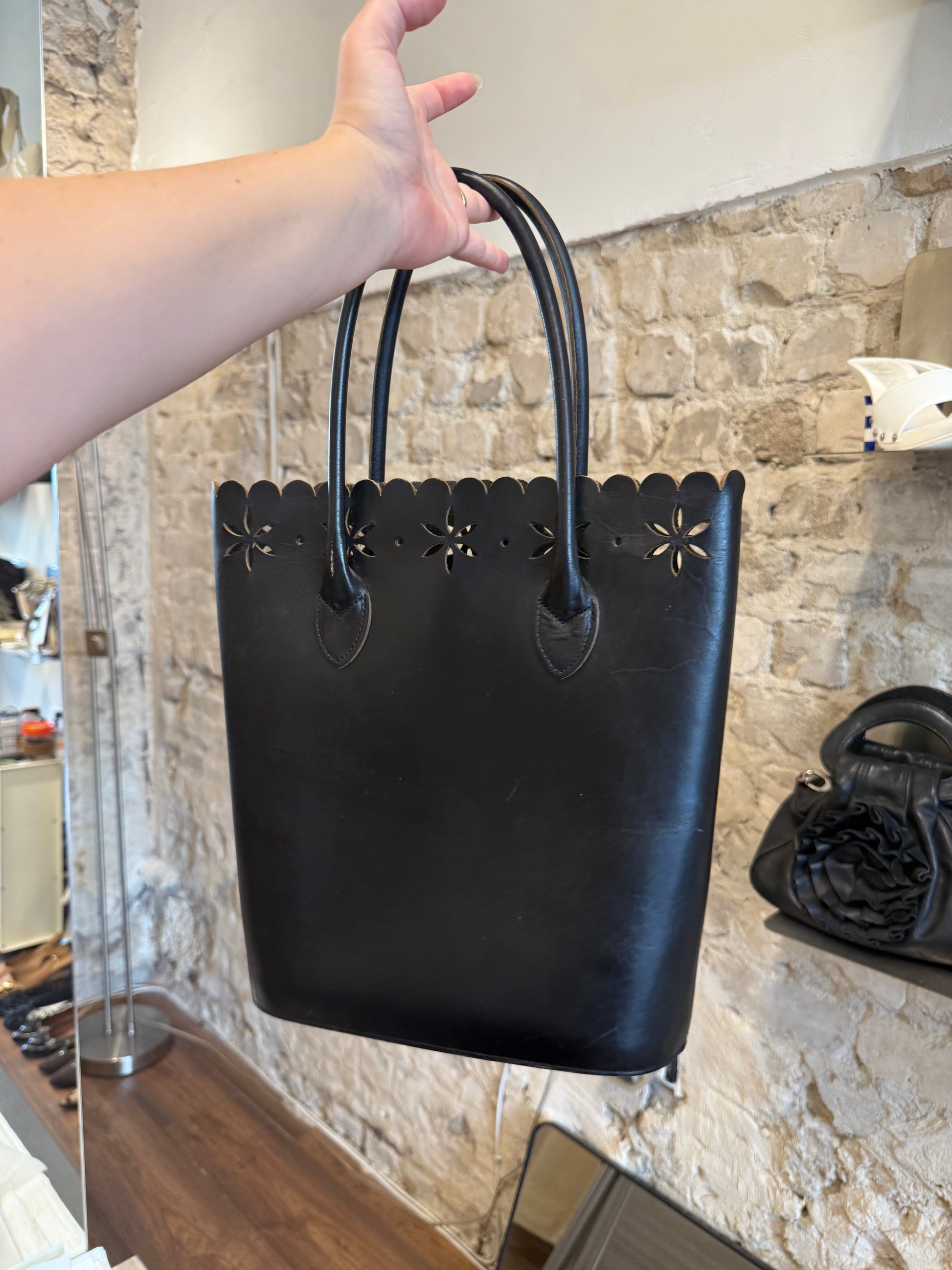 Black leather tote with scalloped edge and floral cutouts. Open interior with side pocket.