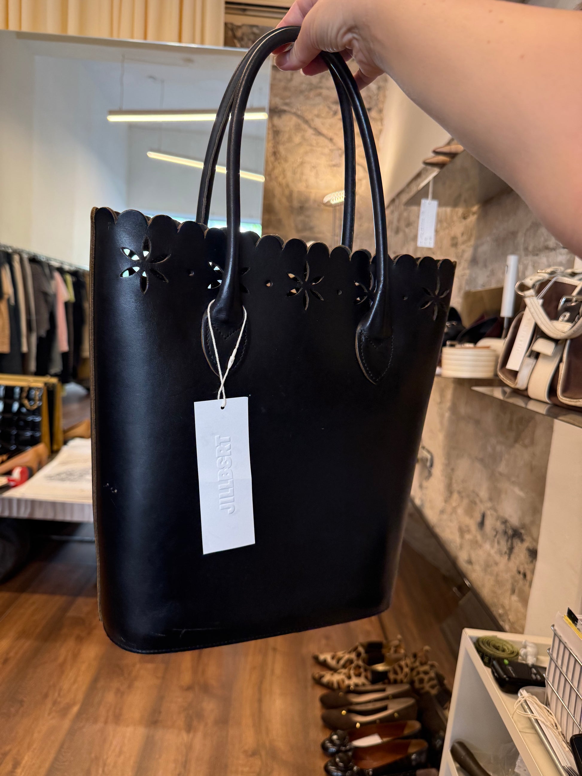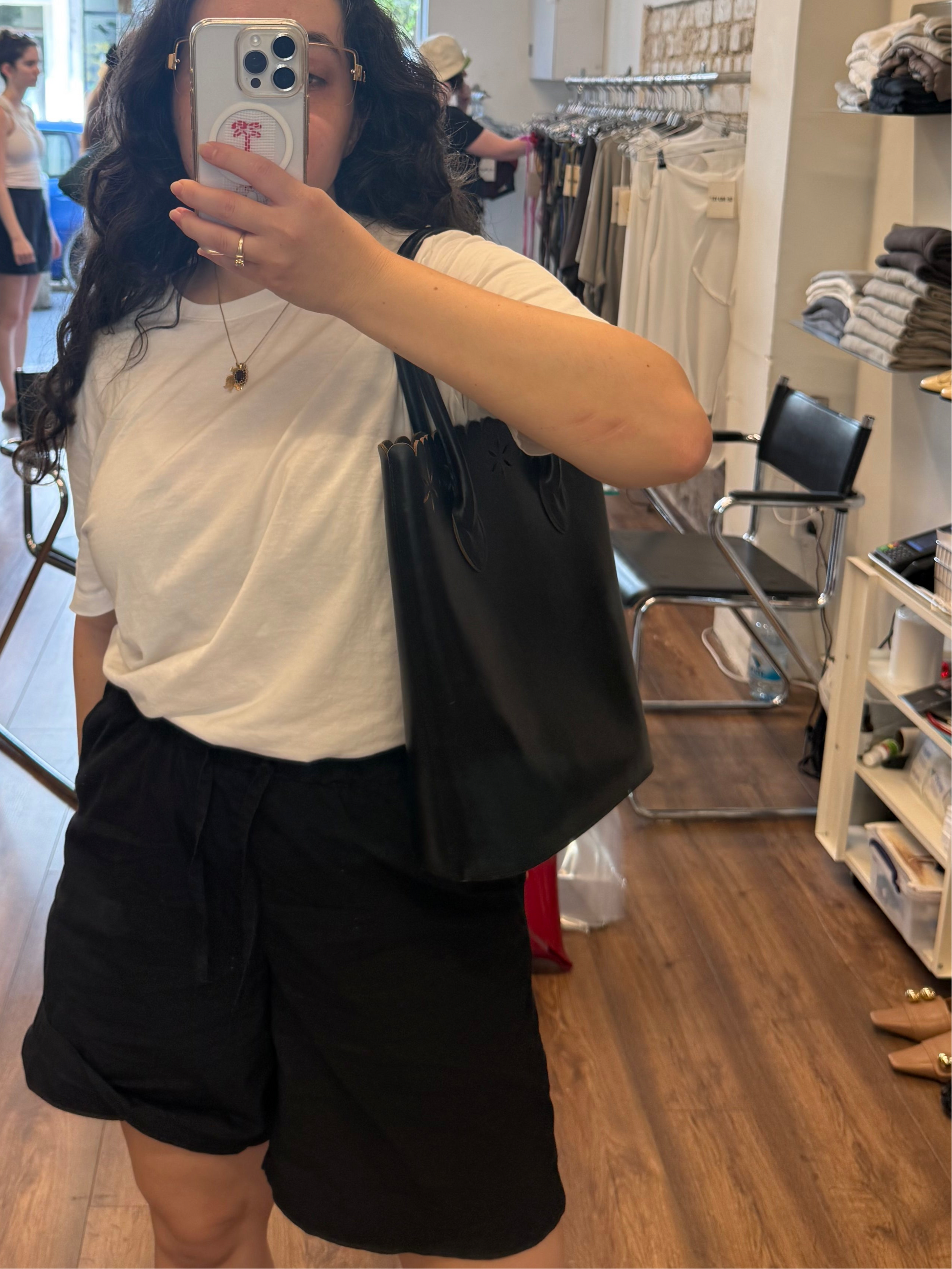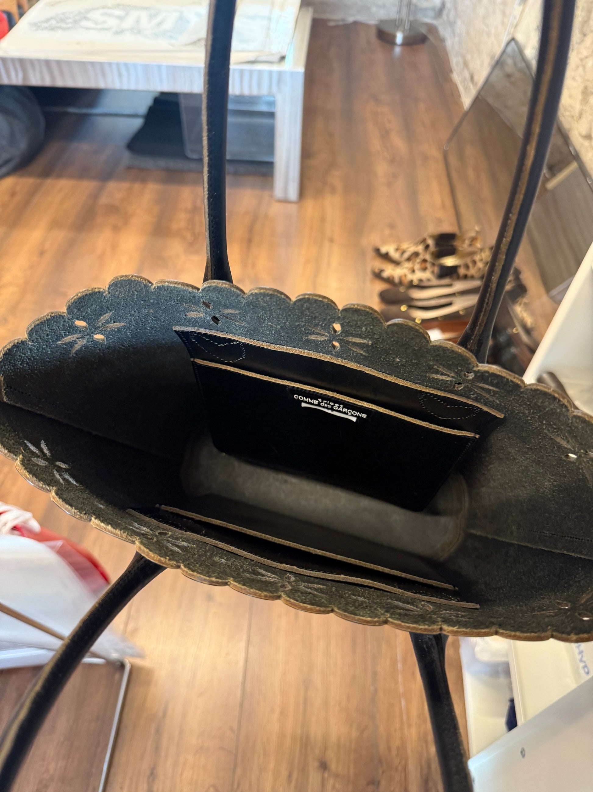 Black leather tote with scalloped edge and floral cutouts. Open interior with side pocket.