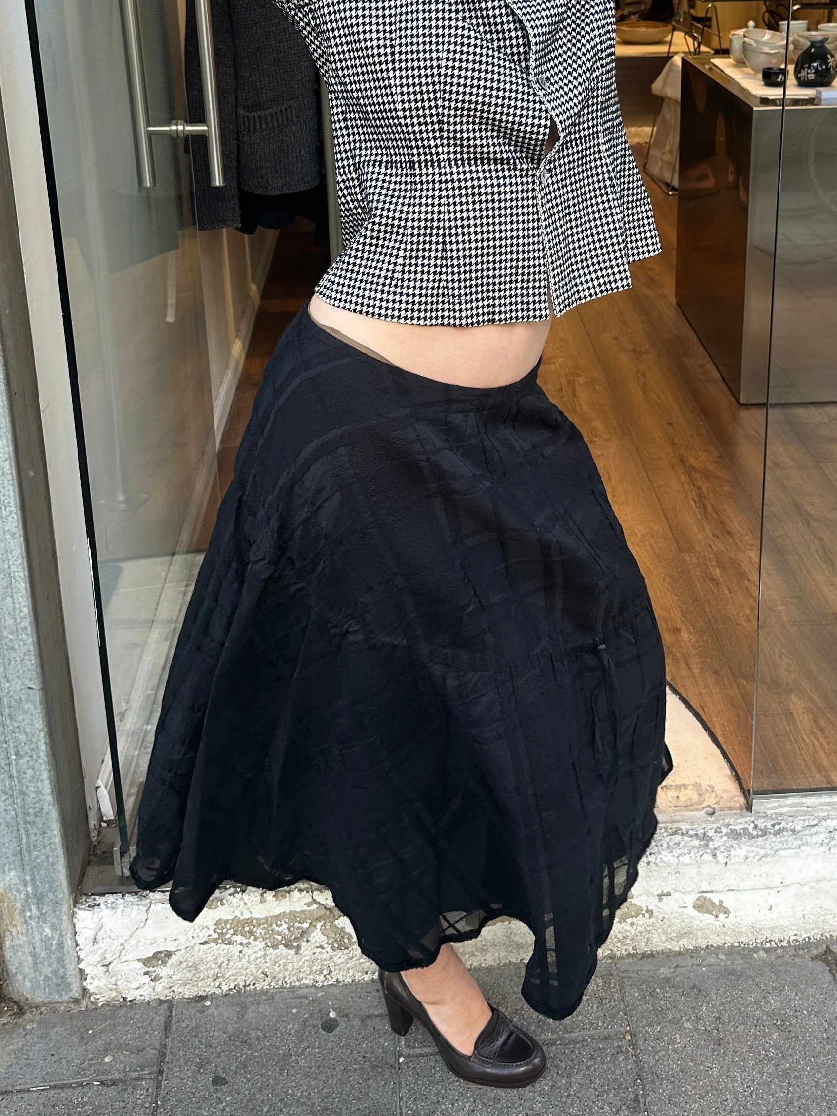 black embossed long skirt with two drawstrings to create an asymmetrical effect