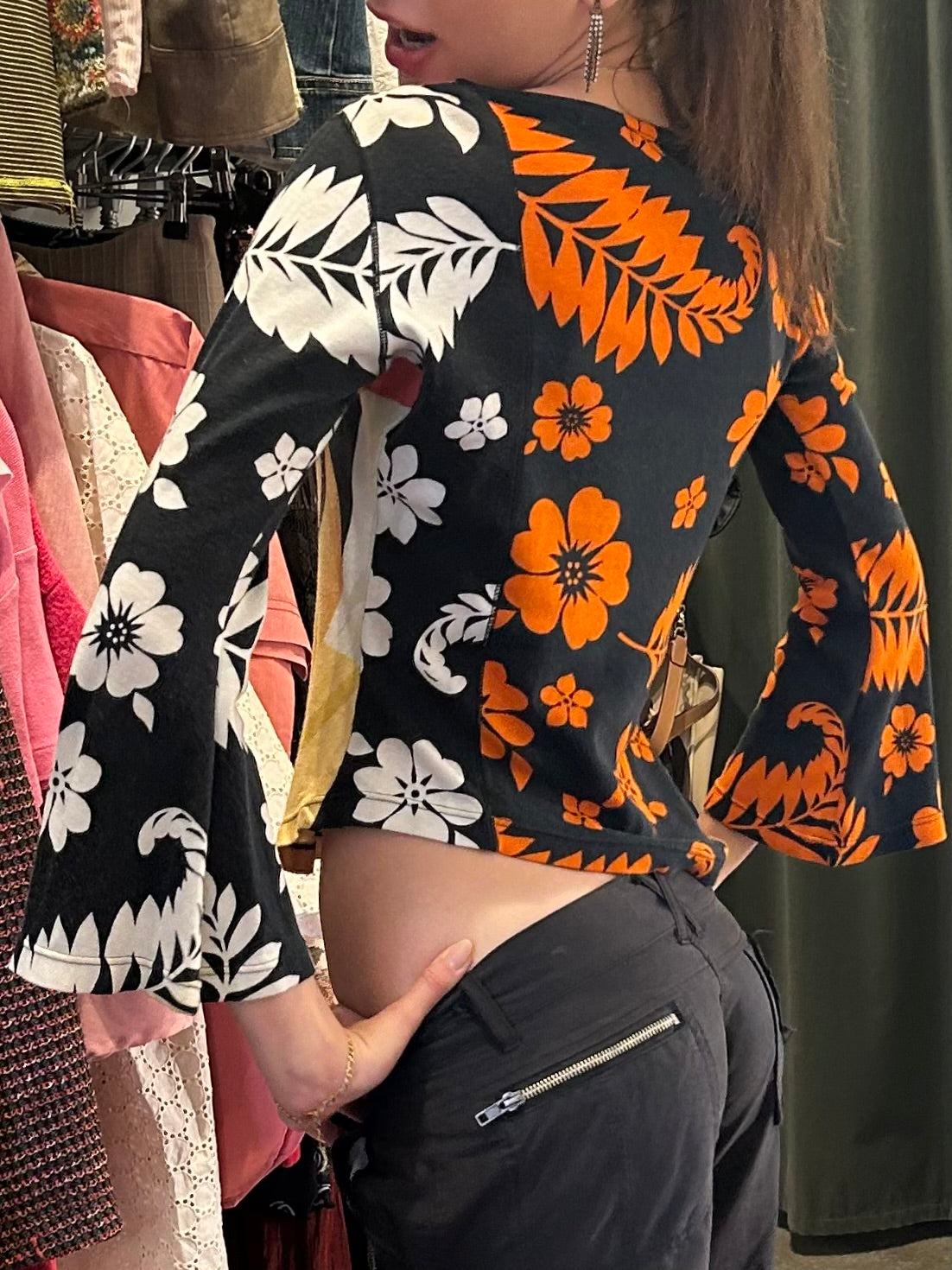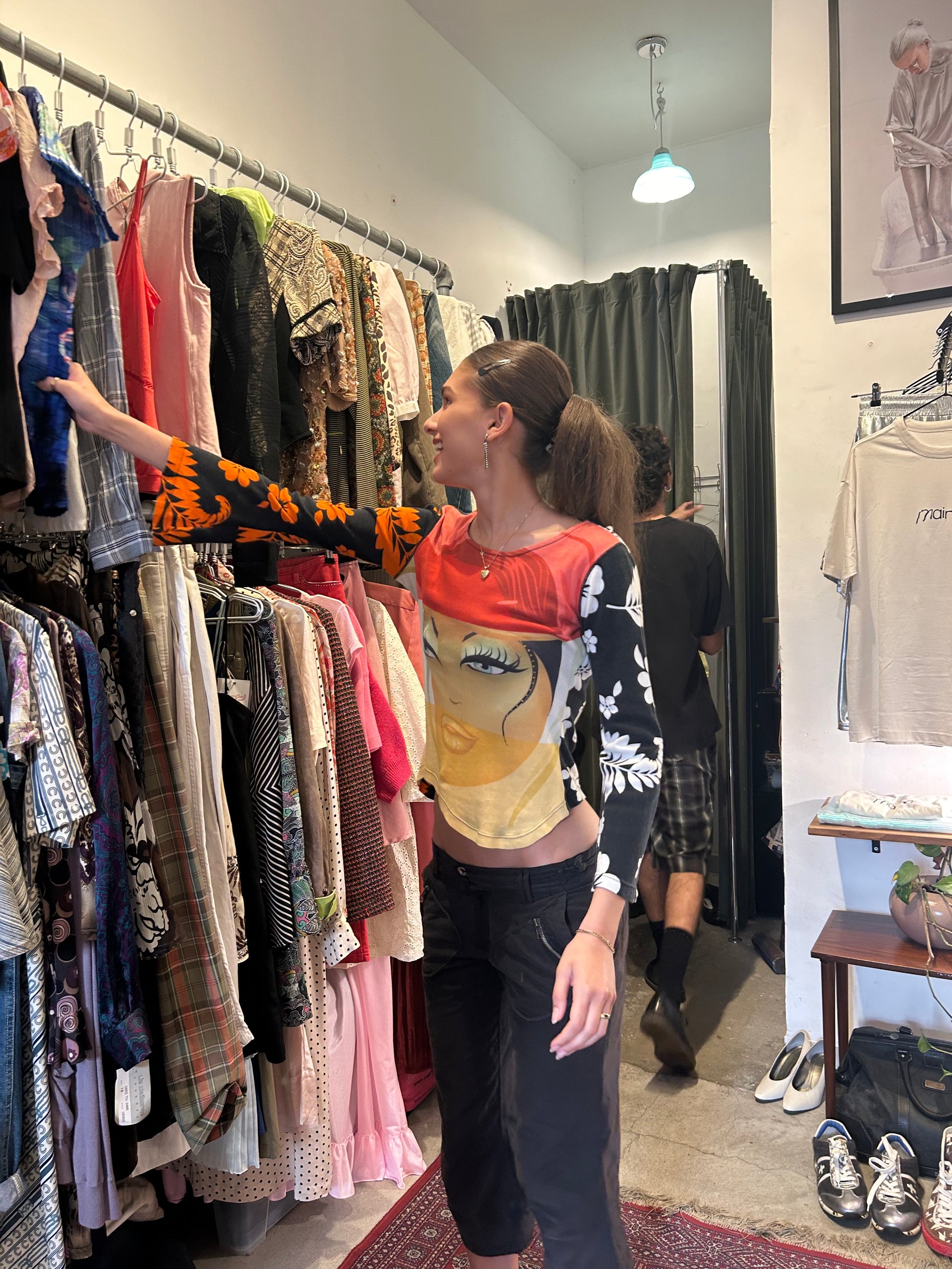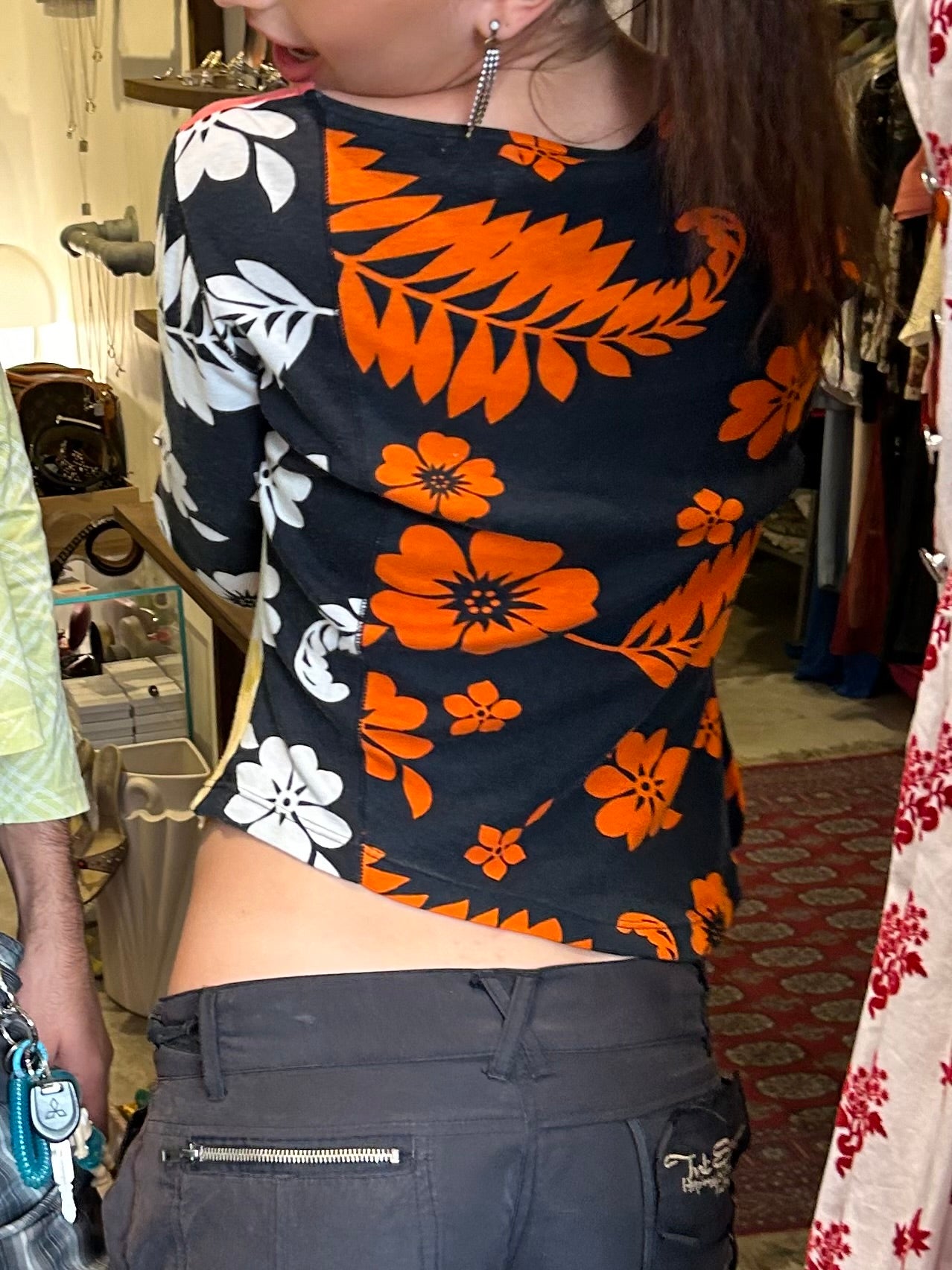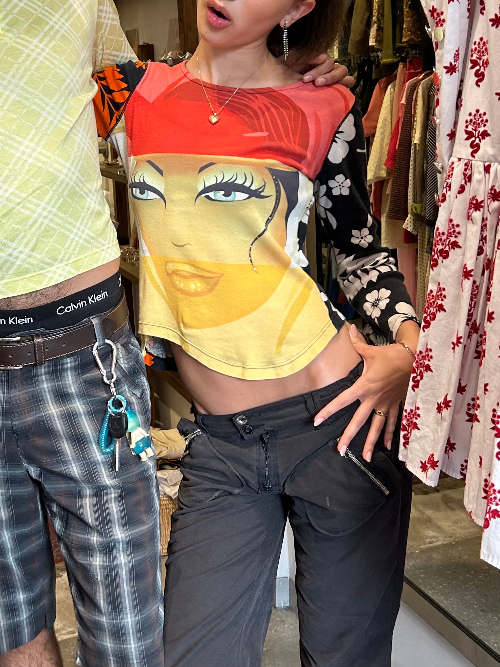 This striking top features a bold and eclectic design, combining vibrant colors, floral prints, and a graphic face motif