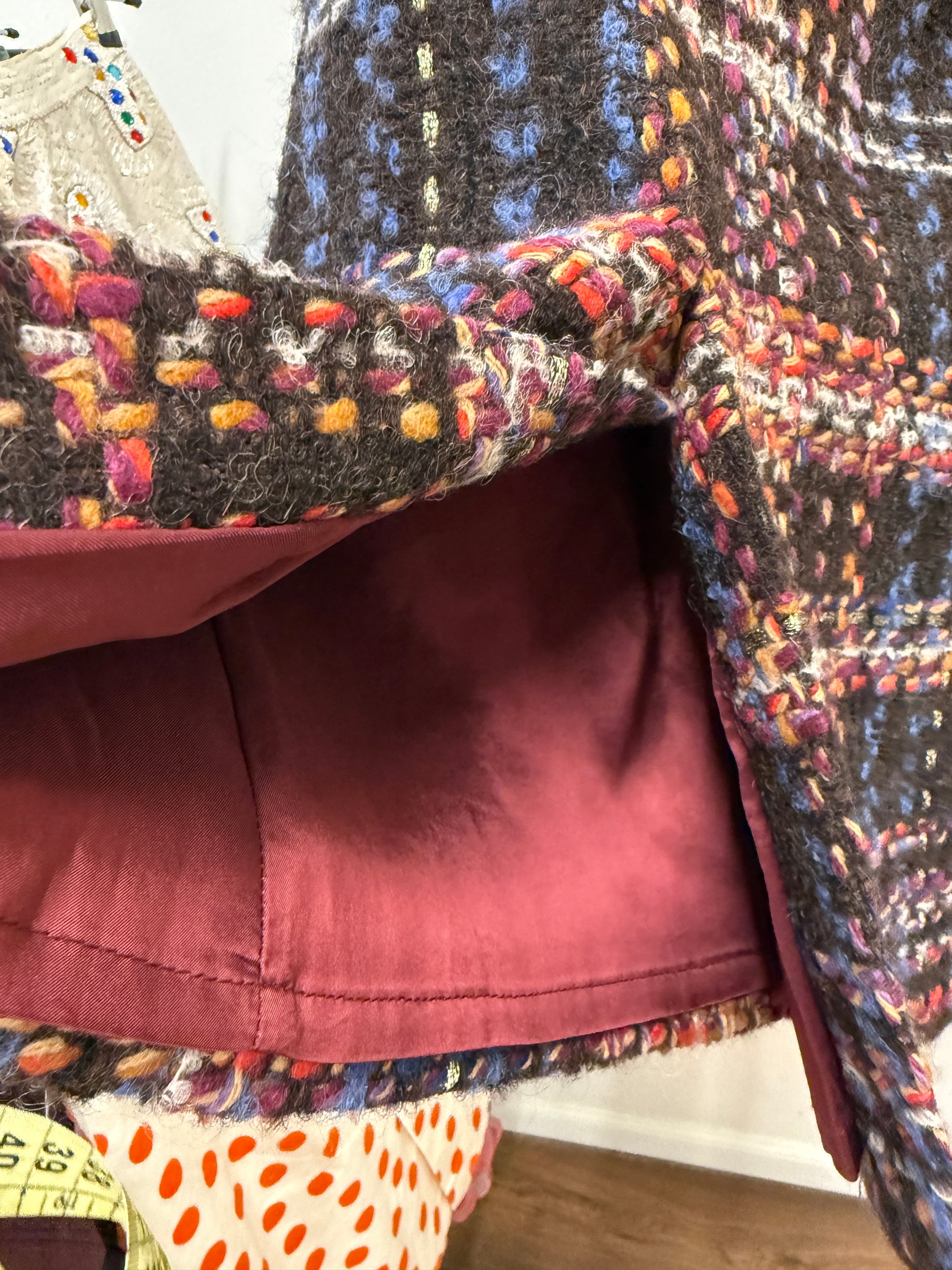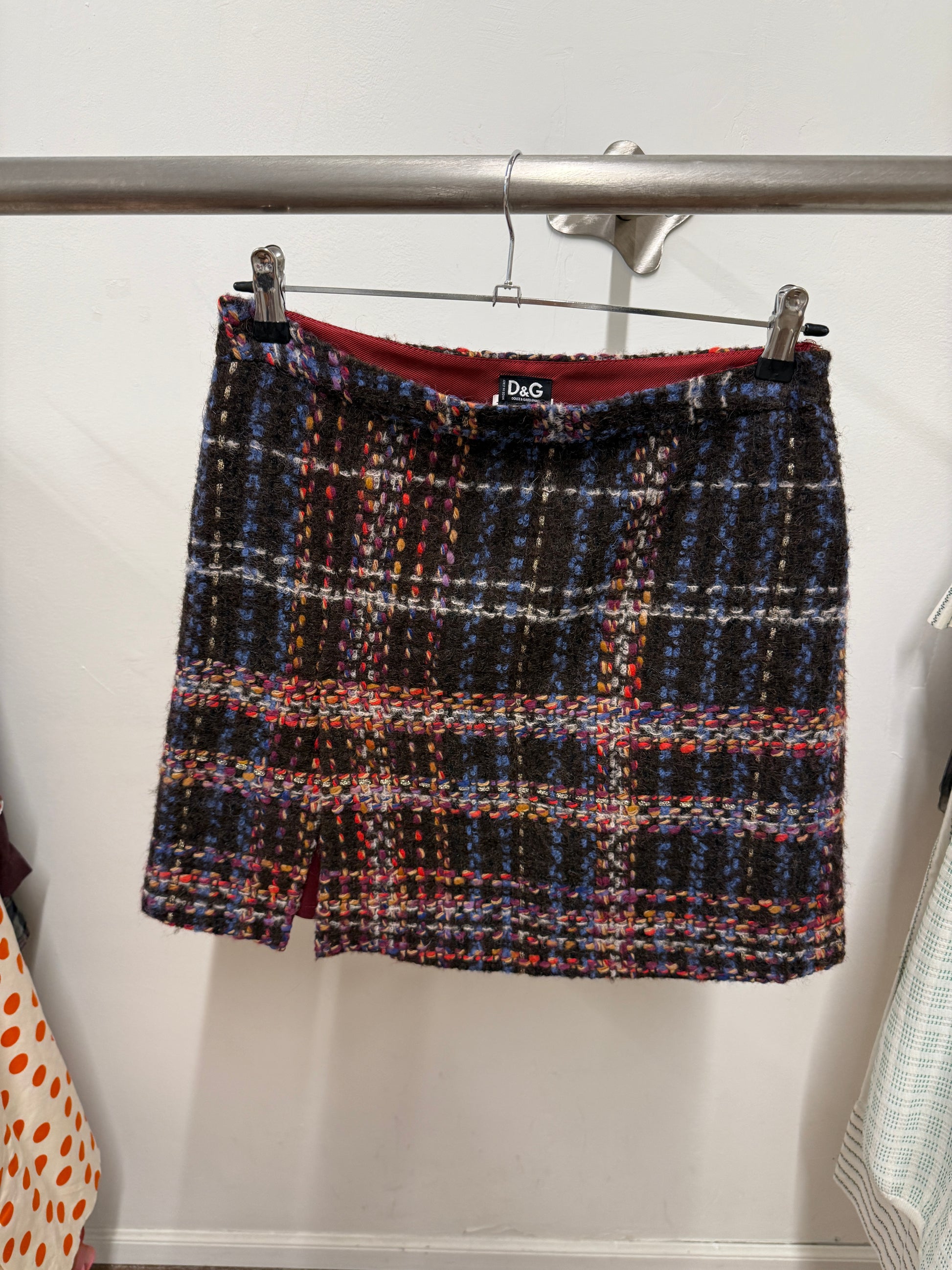 Early D&G diffusion line mini skirt in rich multicolour tweed. Heavy winter wool blend with mohair and alpaca, textured and soft with a classic plaid pattern and subtle colour accents throughout. Fully lined in burgundy viscose with a small front slit for ease of movement. Italian-made archival piece from the late 90s–early 2000s era.