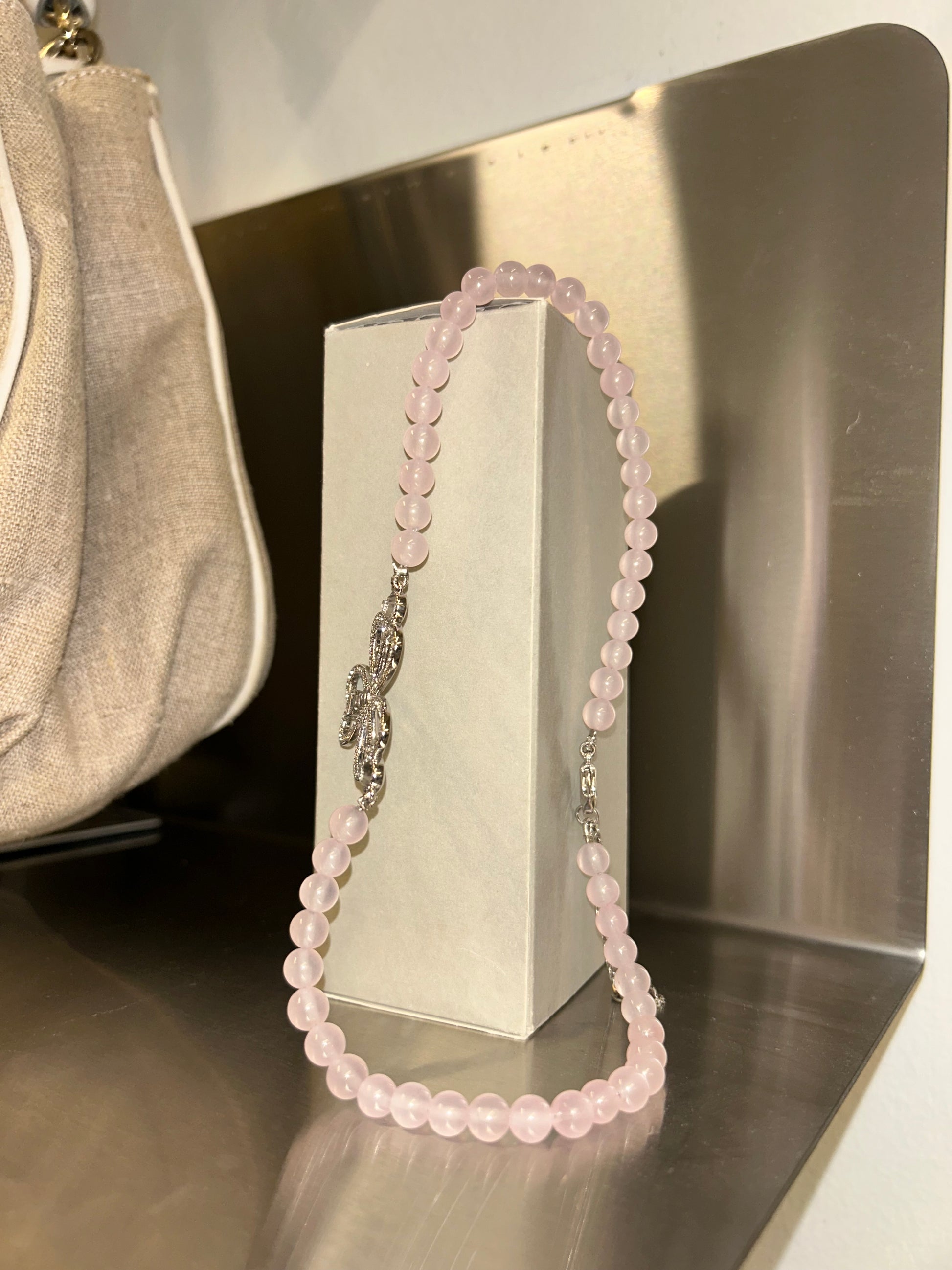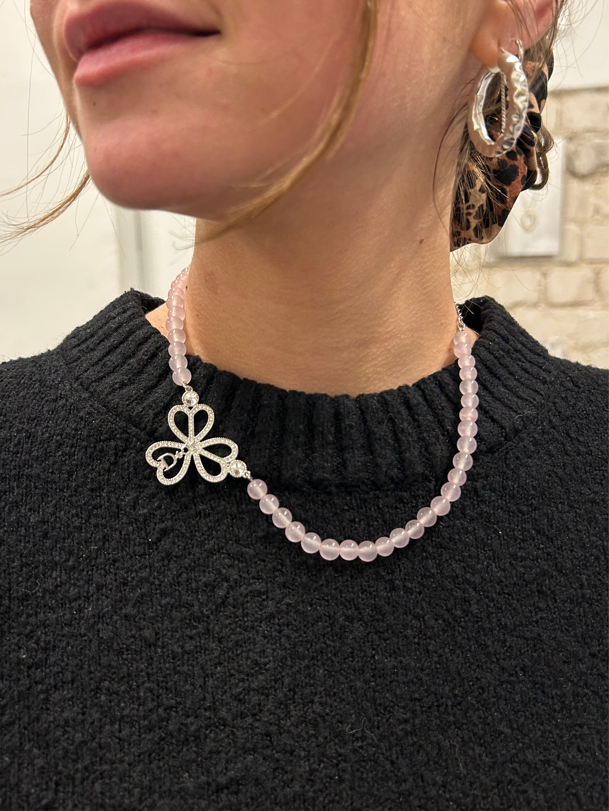 A gentle silver Dior necklace with a rose quartz beads
