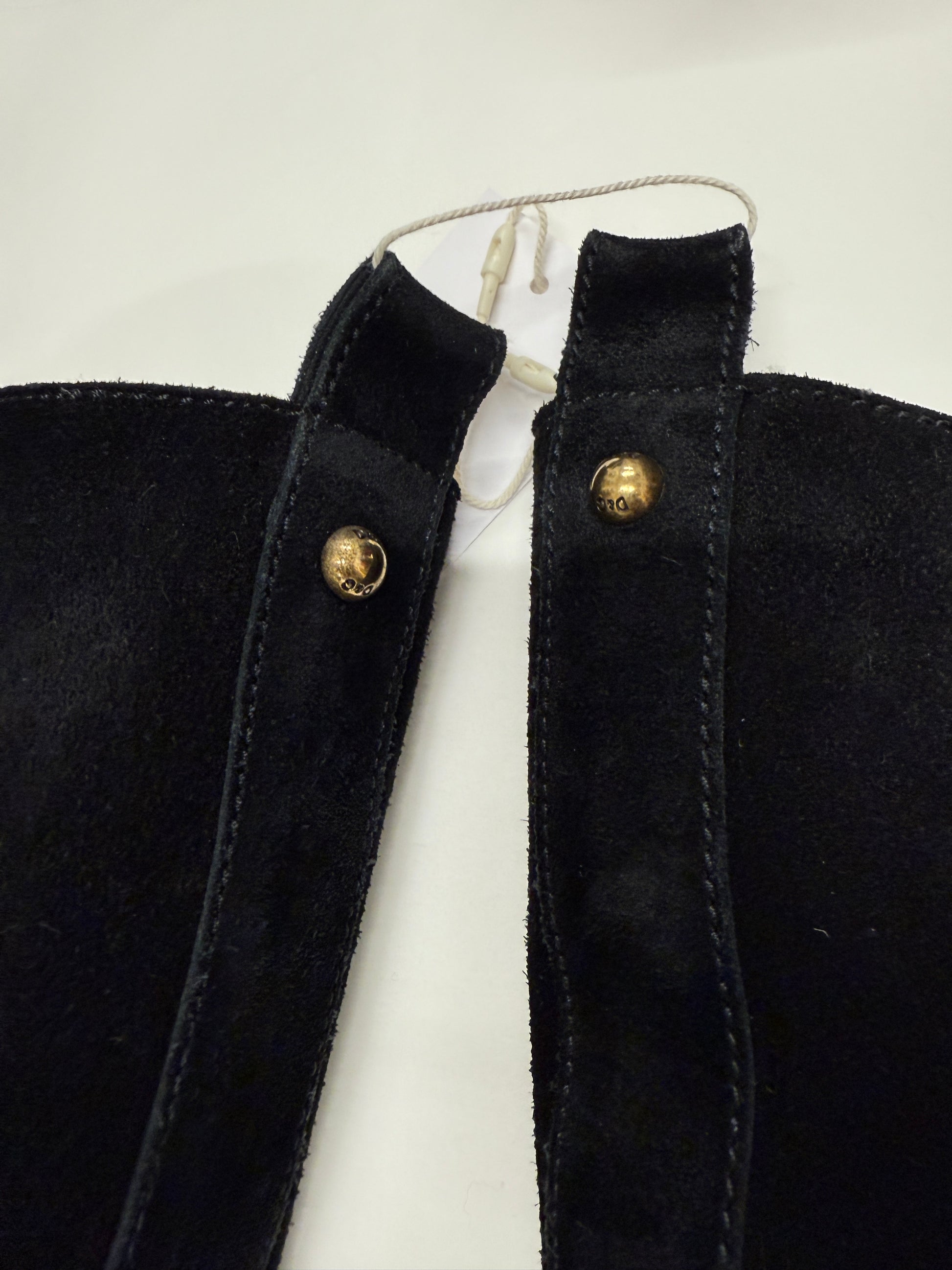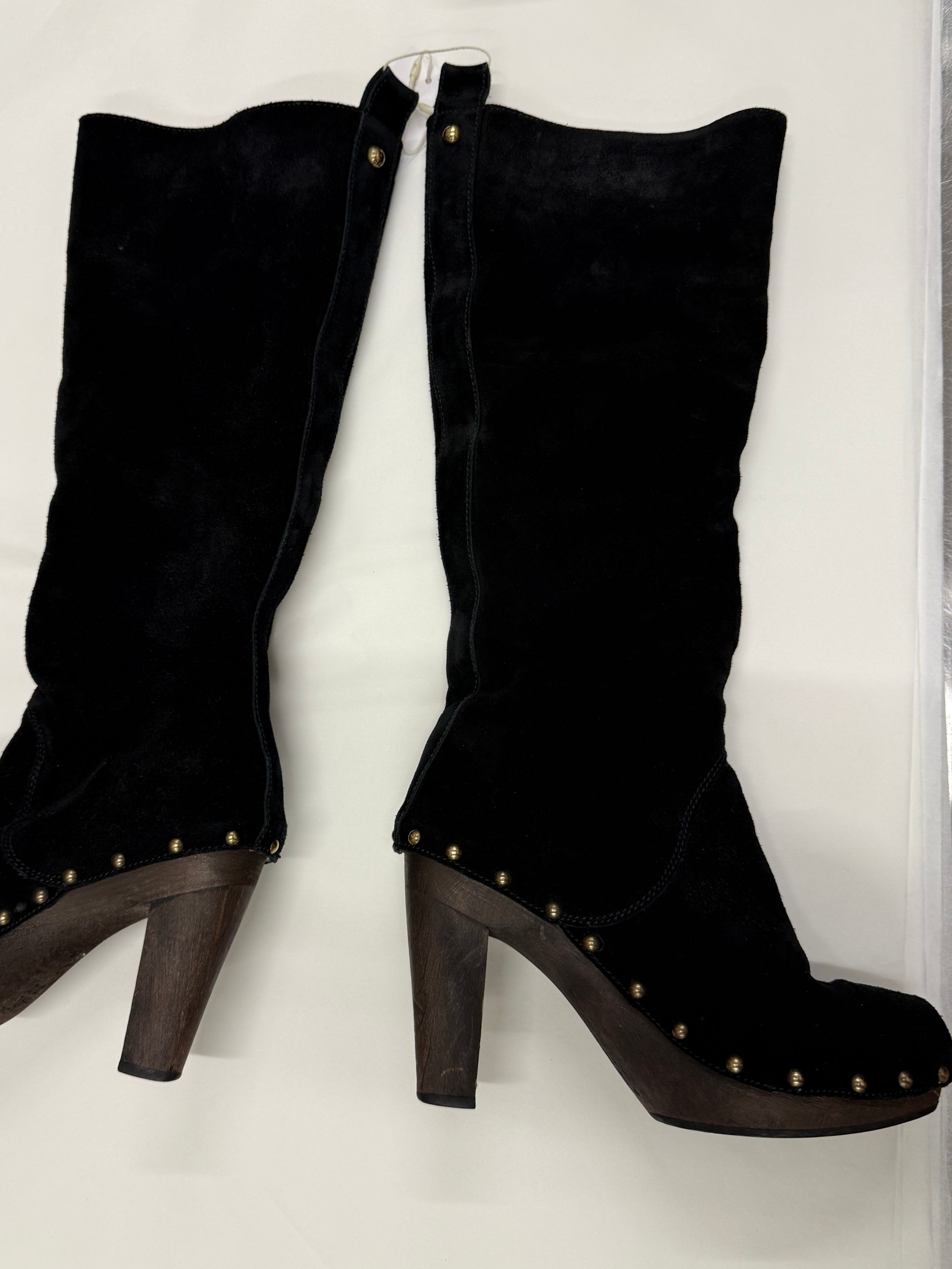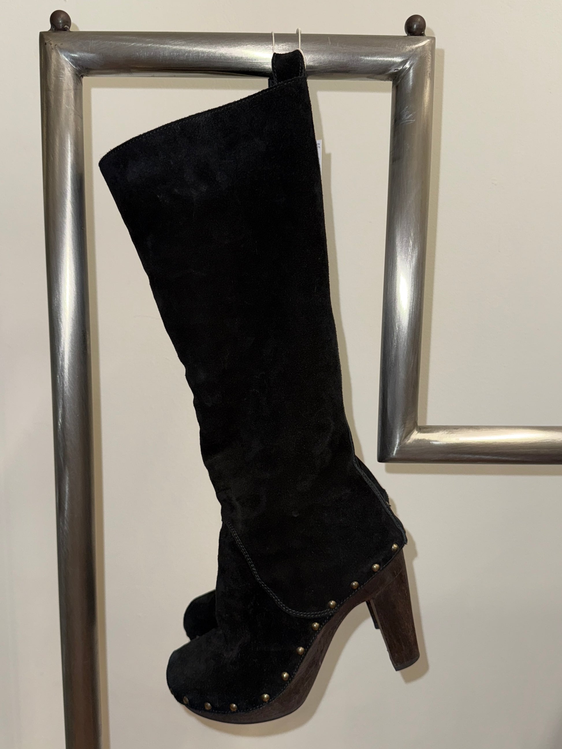 Black suede leather with solid wooden heel and platform, brass stud detailing, fully lined interior.