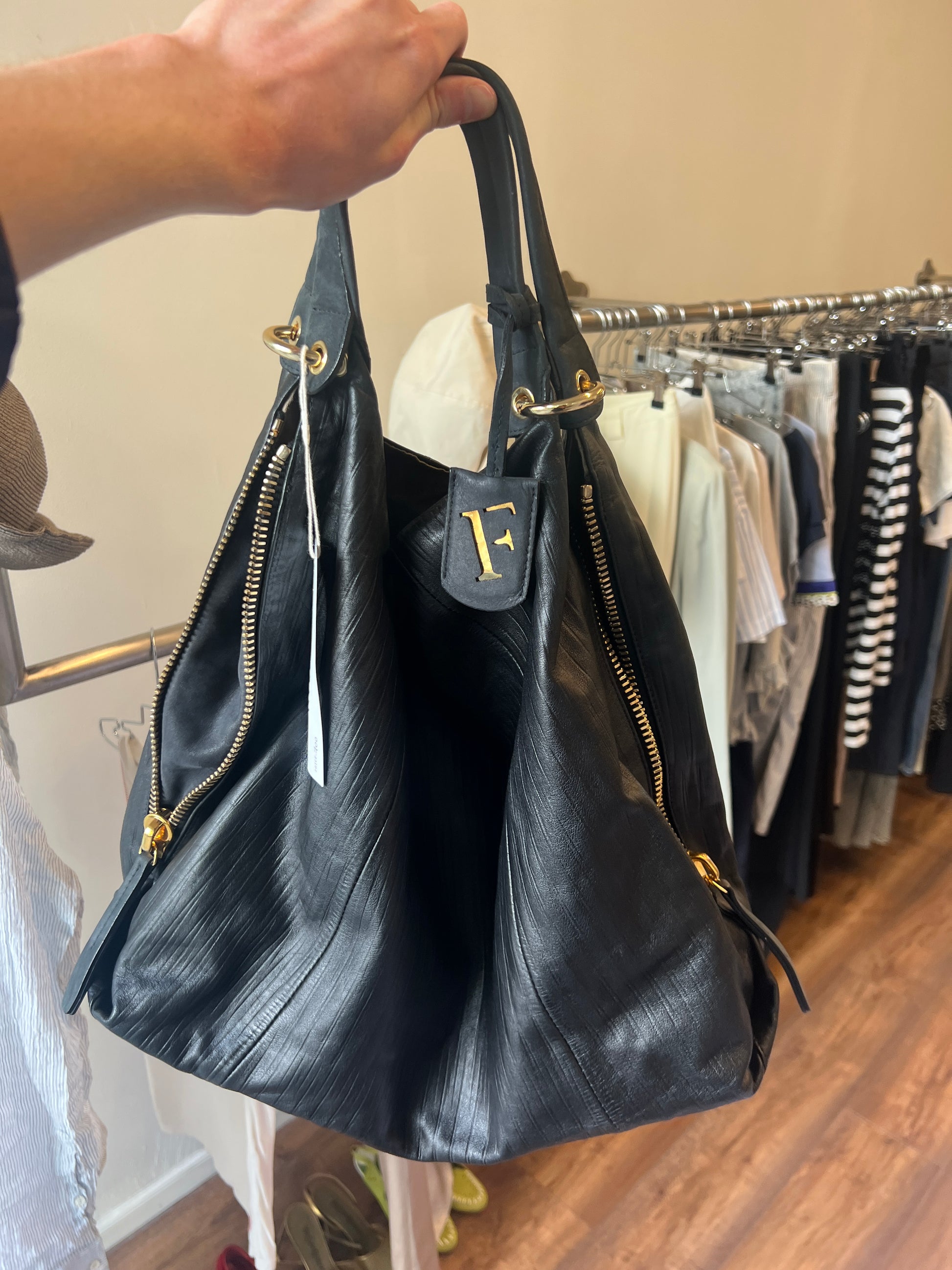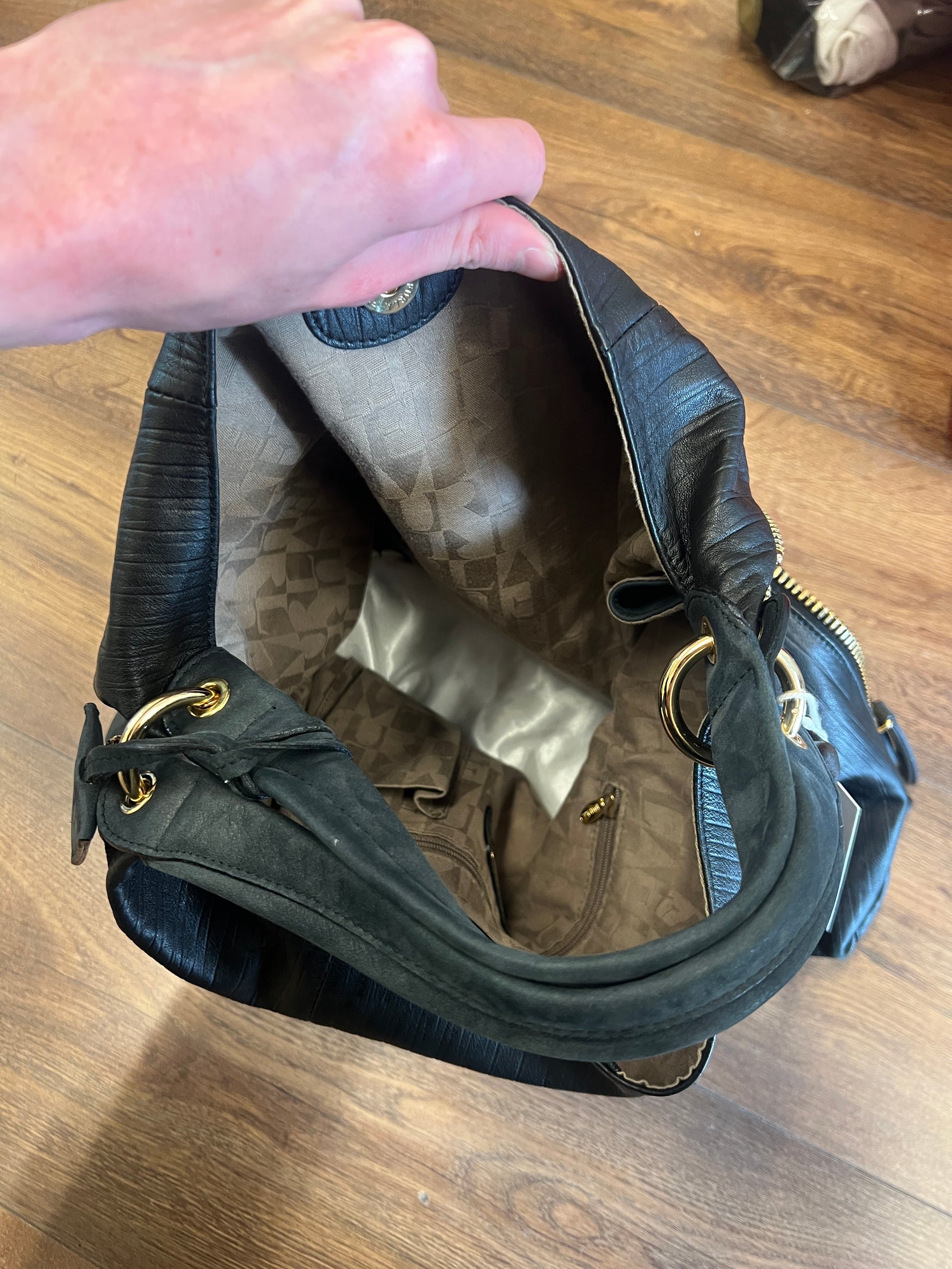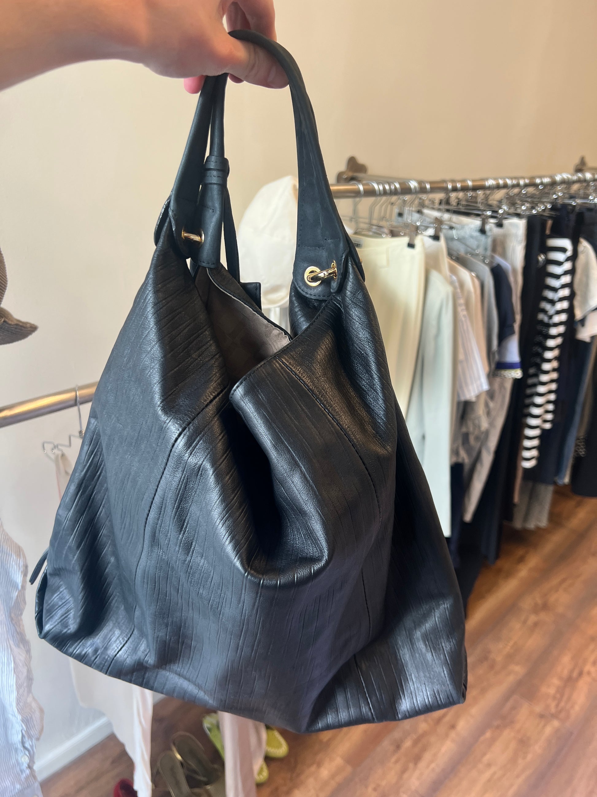 big hobo leather tote bag with dark grey suede handels and gold hardware