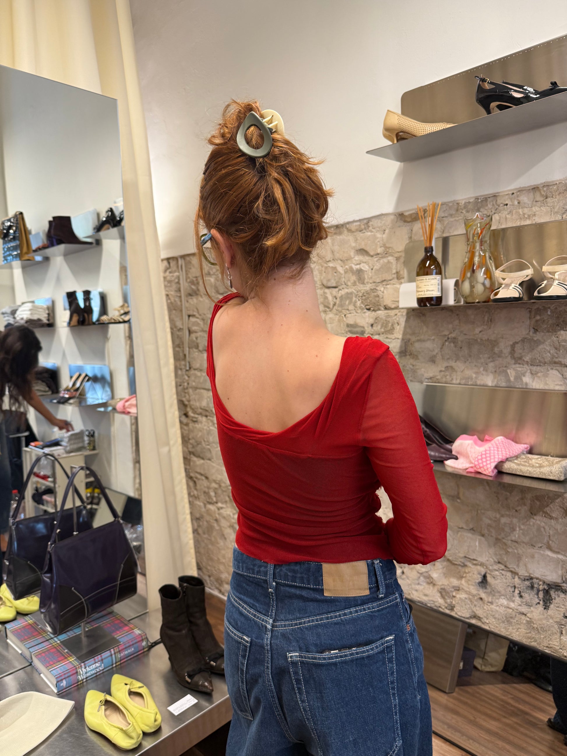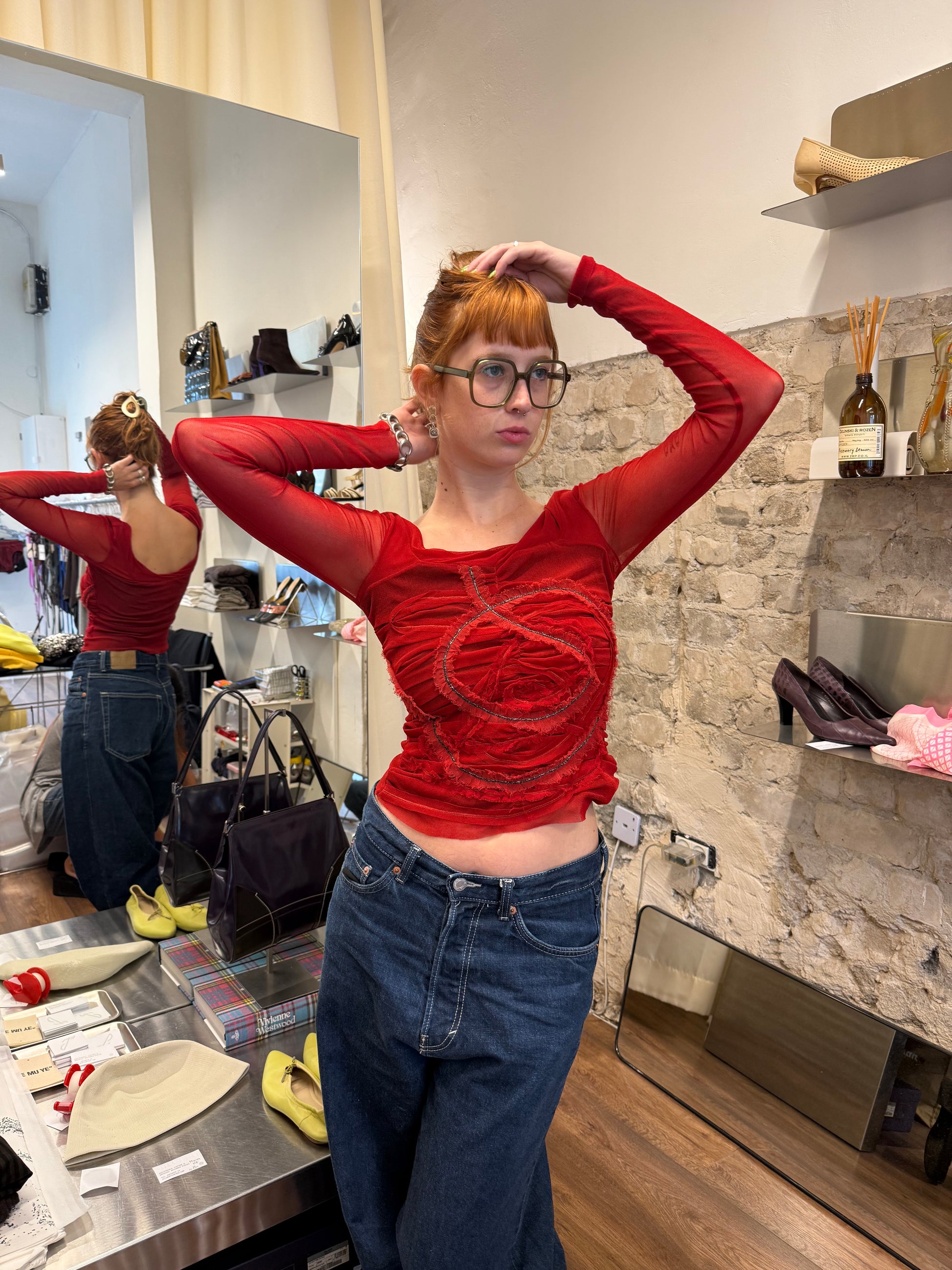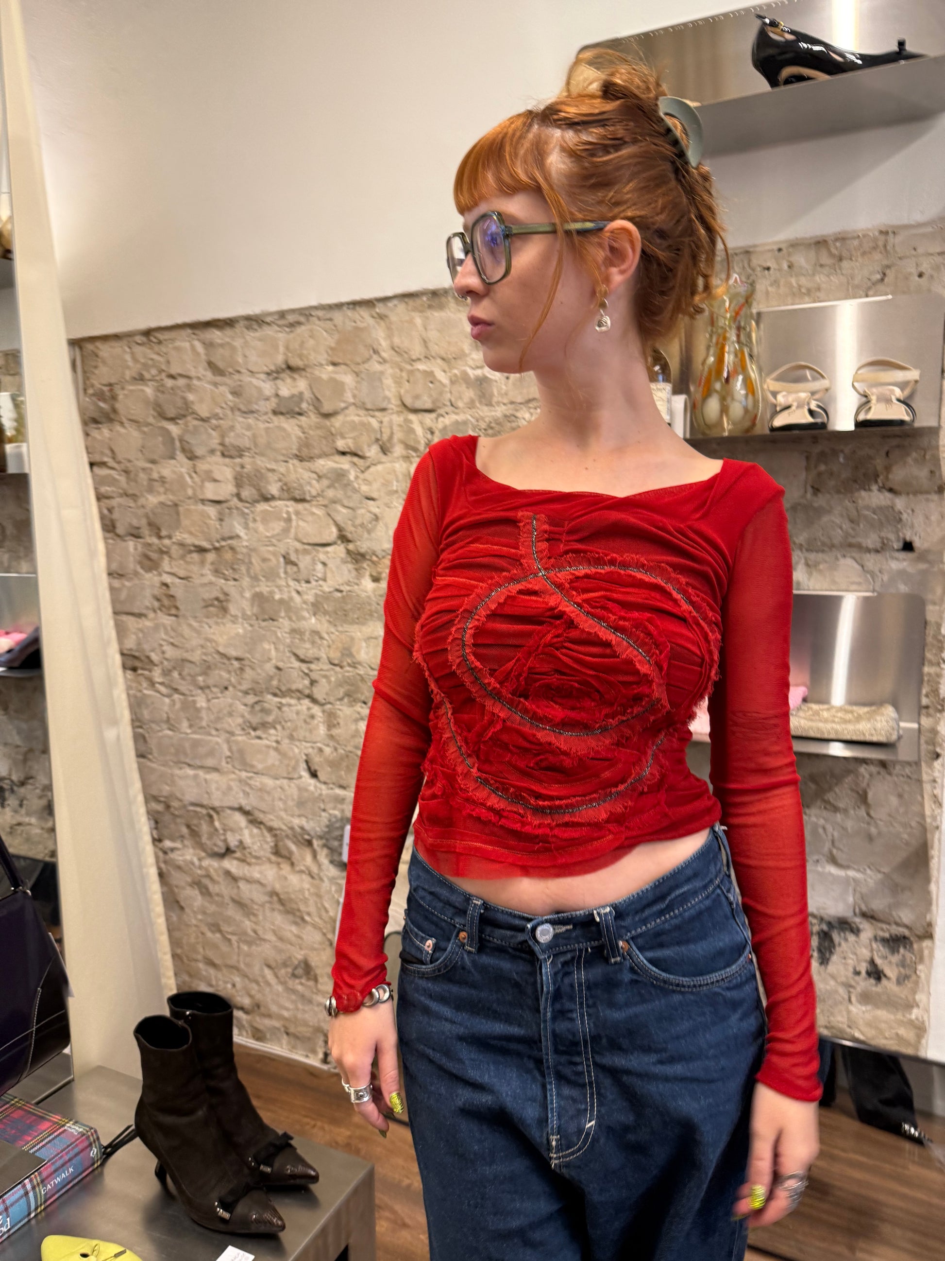 Signature sheer mesh top featuring intricate circular ruching and a sculpted neckline.
