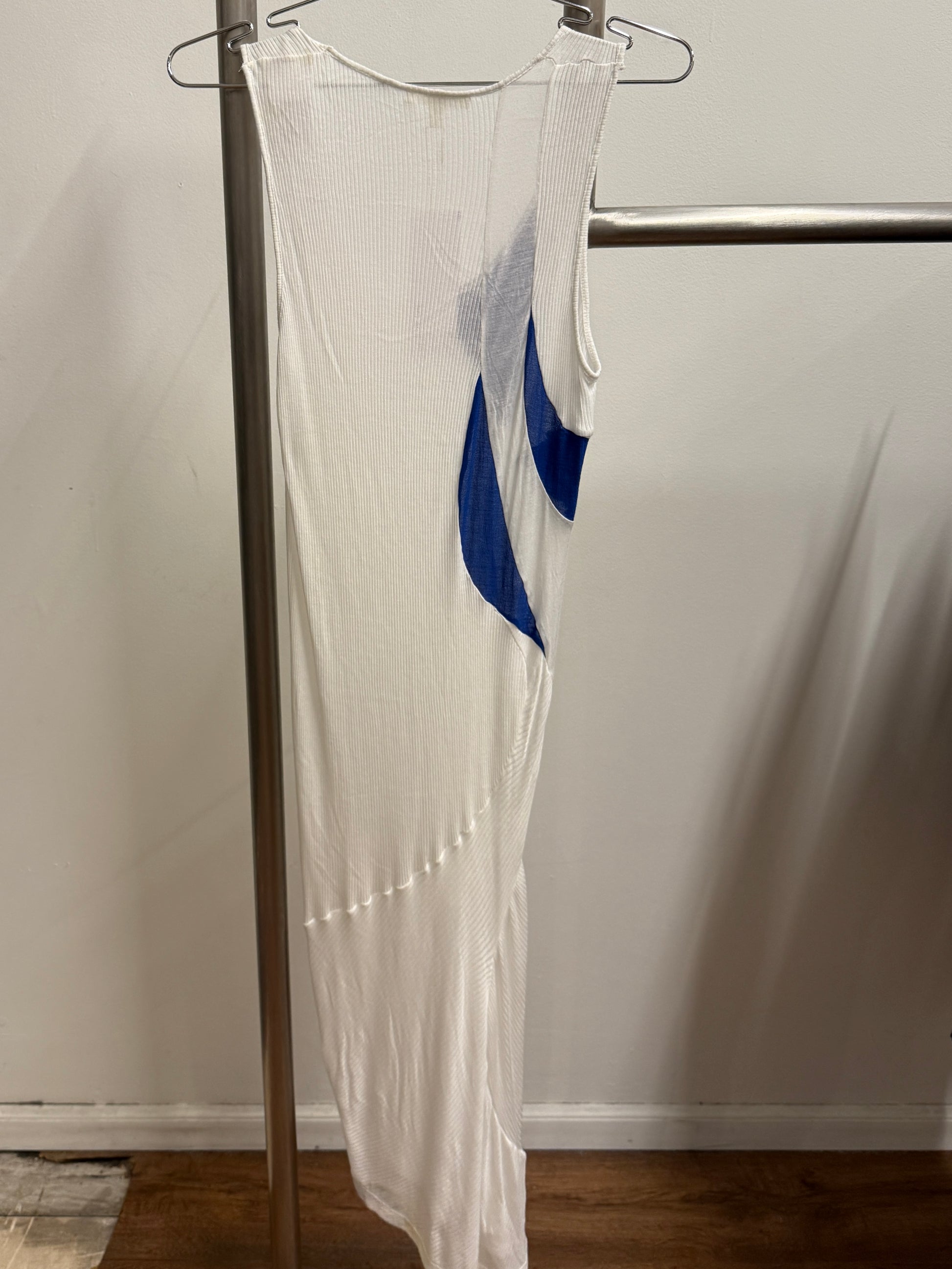 Ultra-soft ribbed semi-sheer knit with asymmetric panel construction and blue contrast detailing, fluid drape with a second-skin feel.