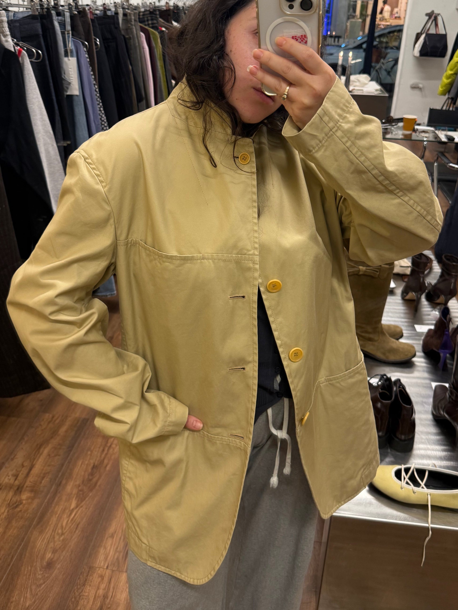 Light khaki cotton jacket with a sculptural stand collar, asymmetric button stance and large front pockets.