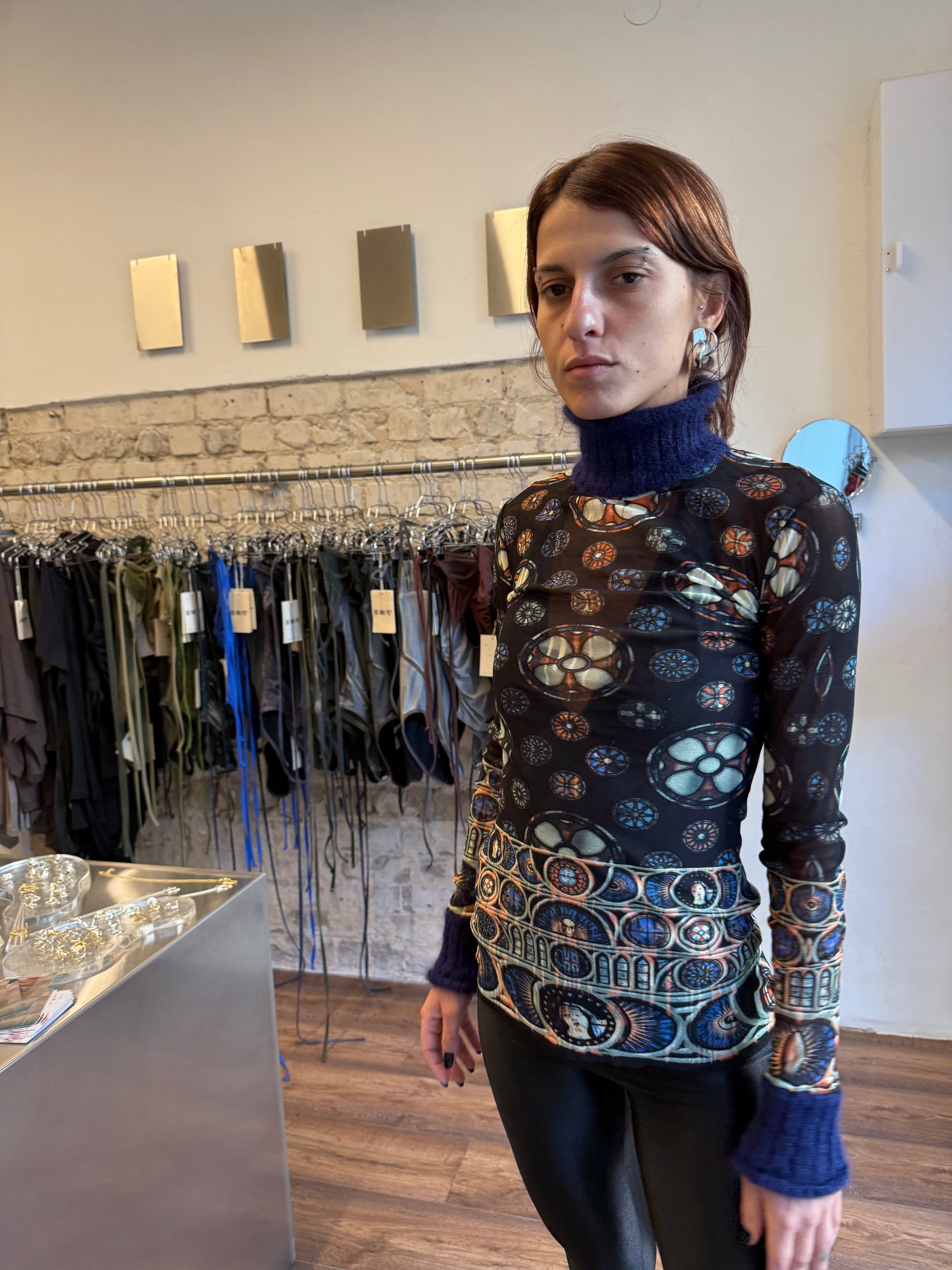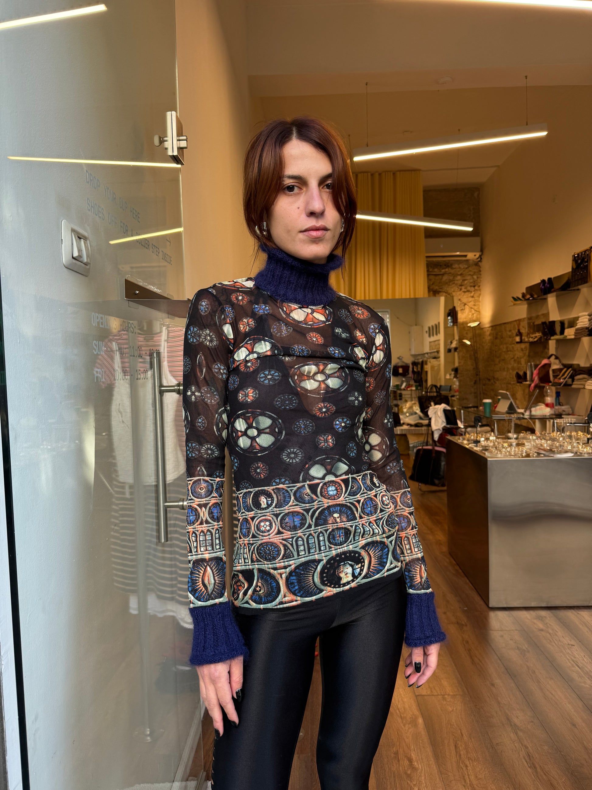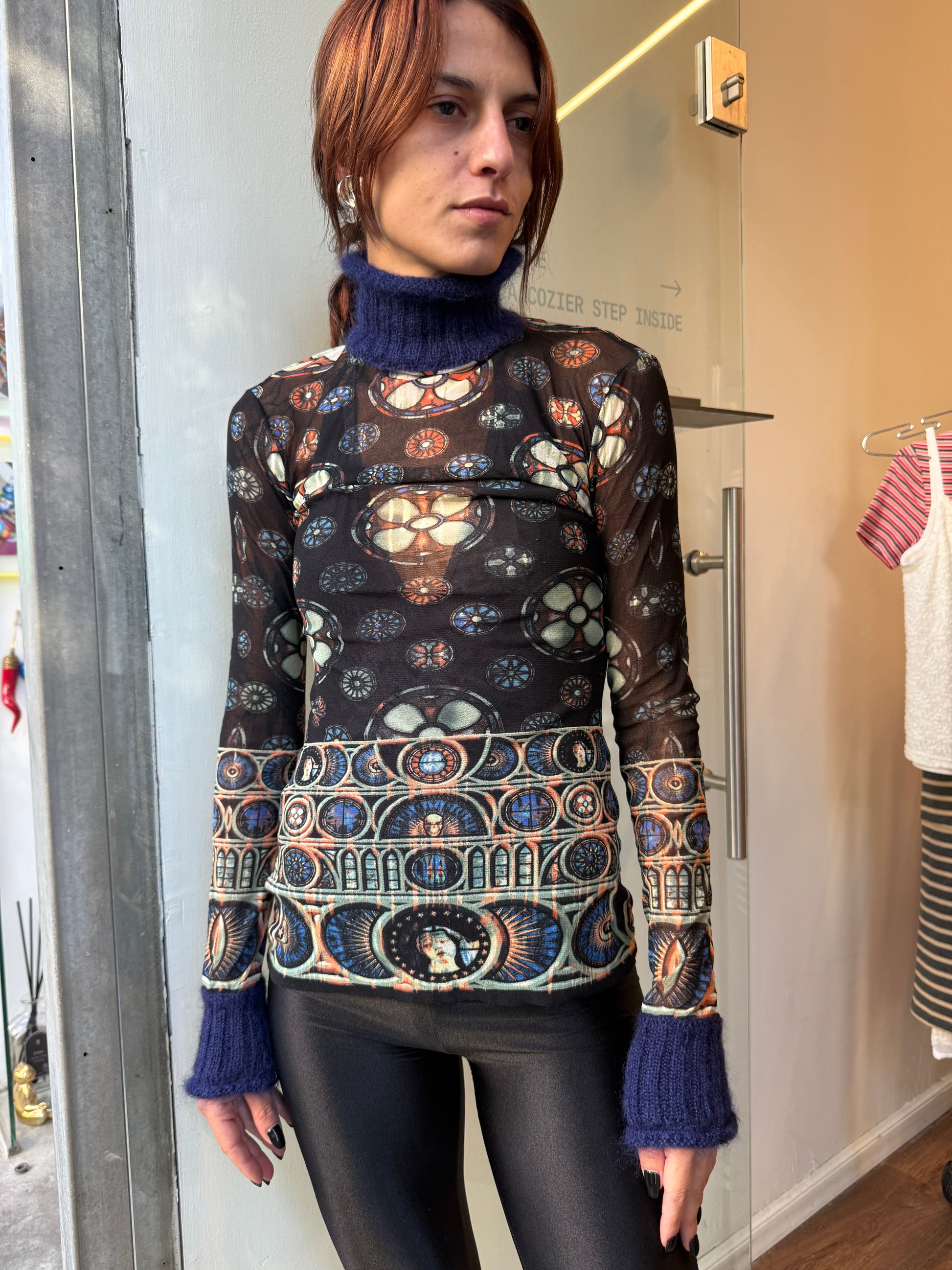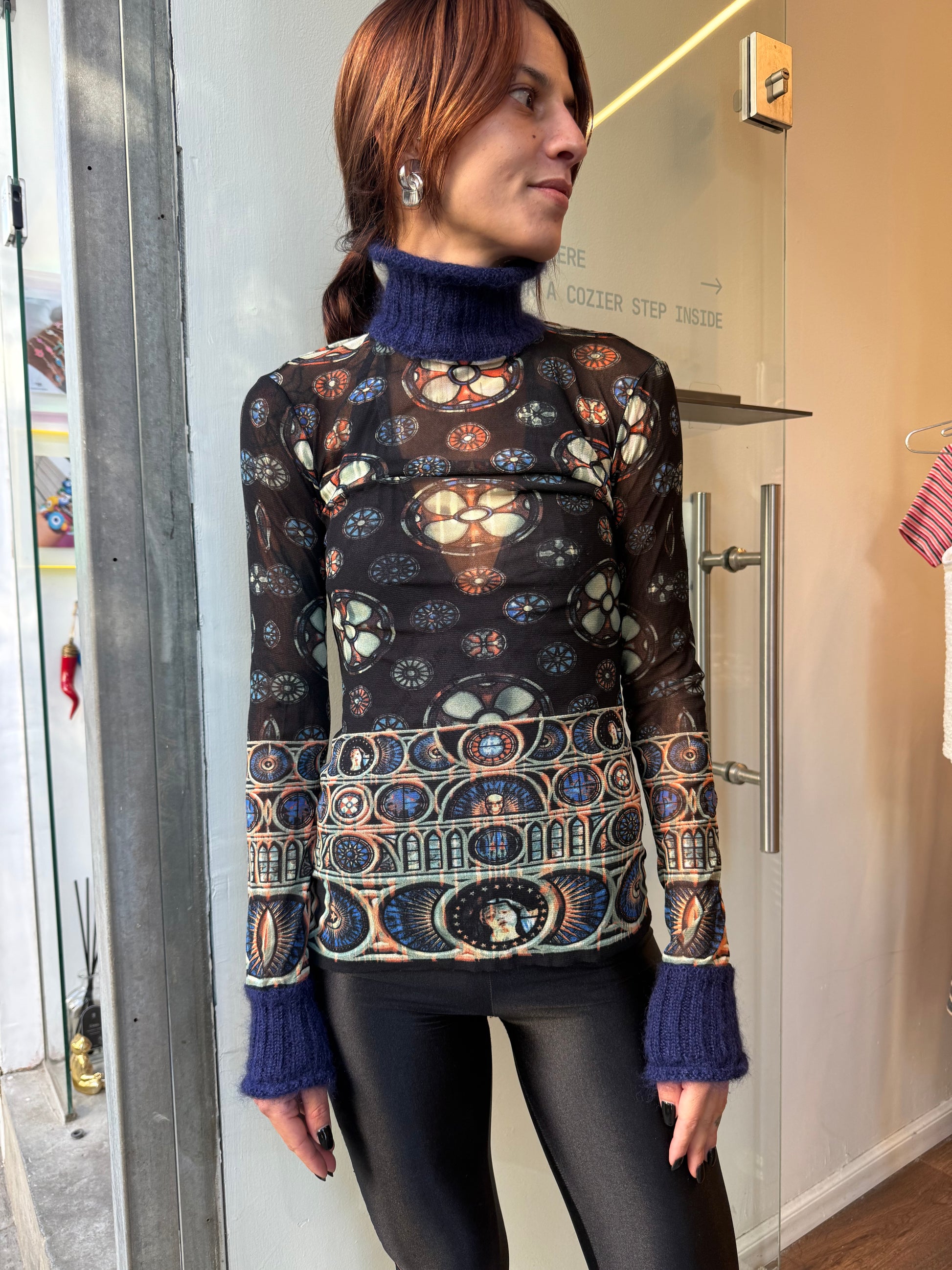 Sheer printed mesh long-sleeve top featuring gothic stained-glass motif and semi-high collar with fuzzy mohair cuffs and neckline.
