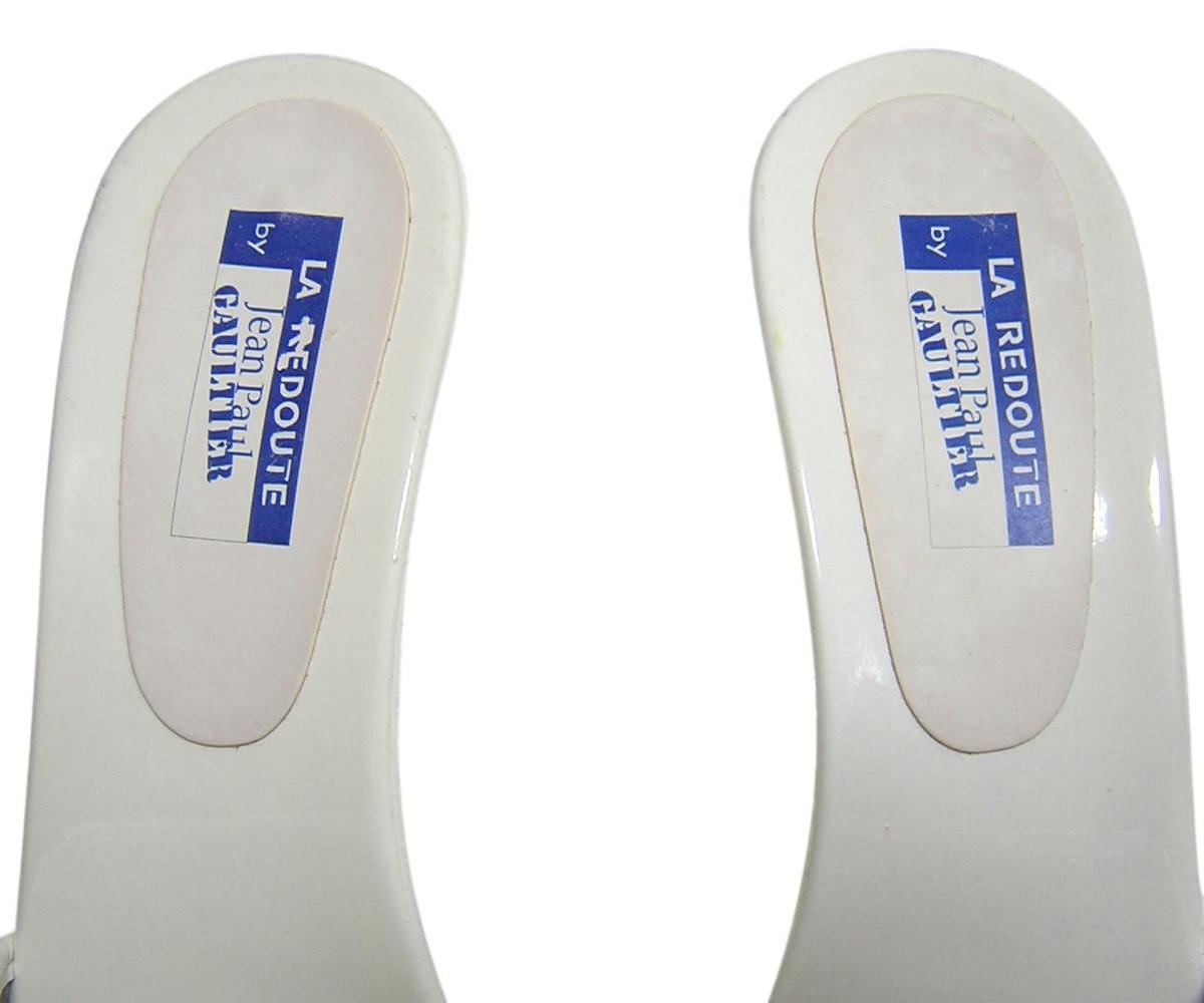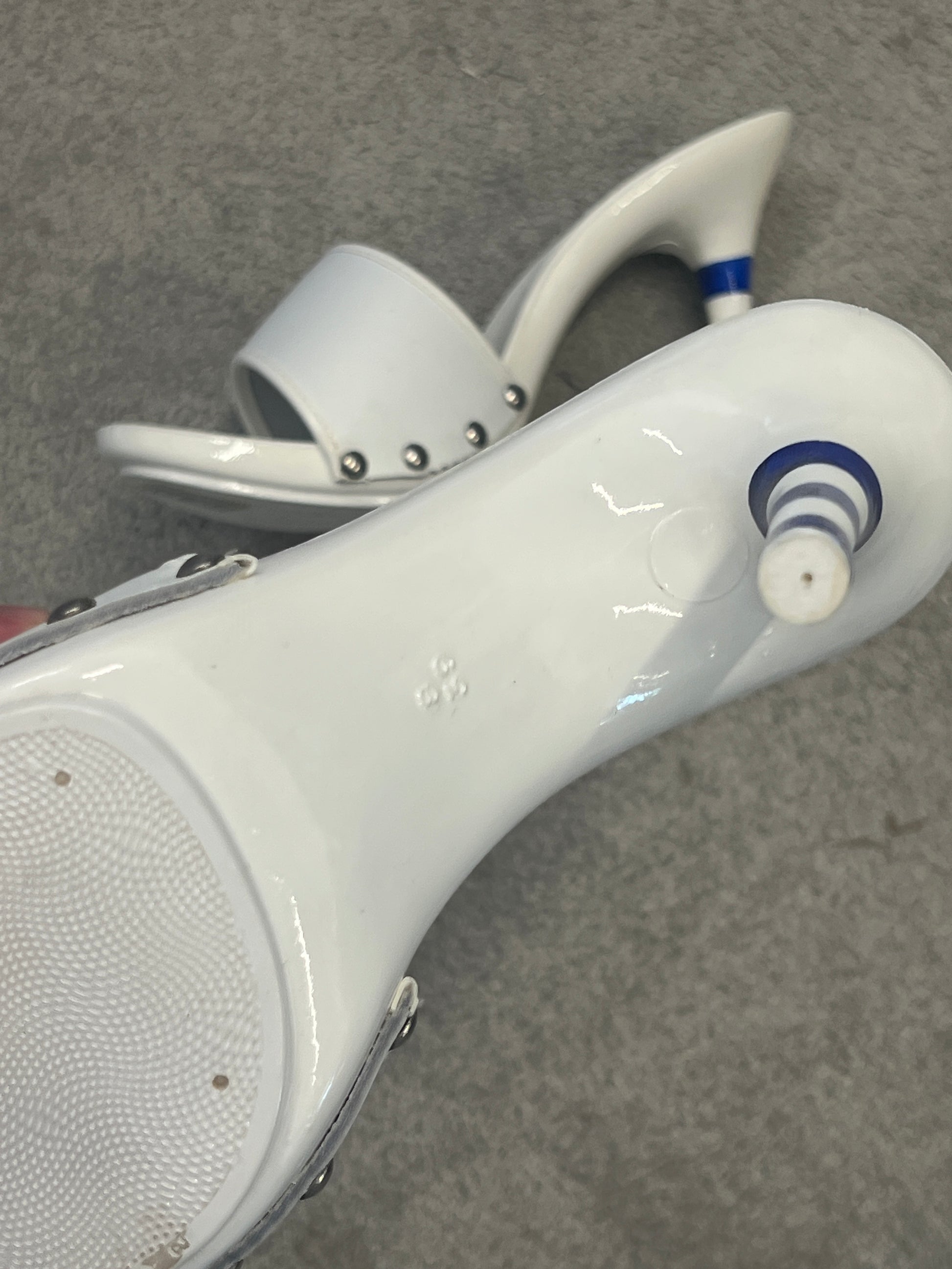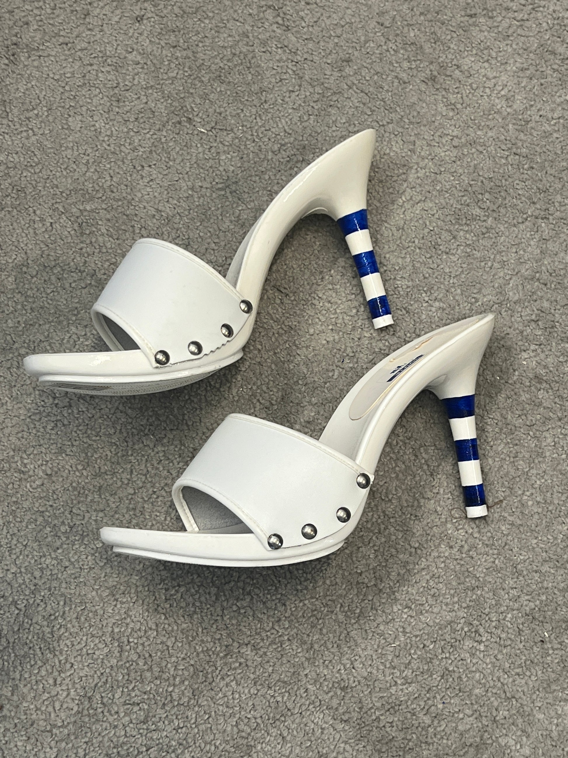 white sandal heels with stud details on the sides and blue stripes painted on the heels