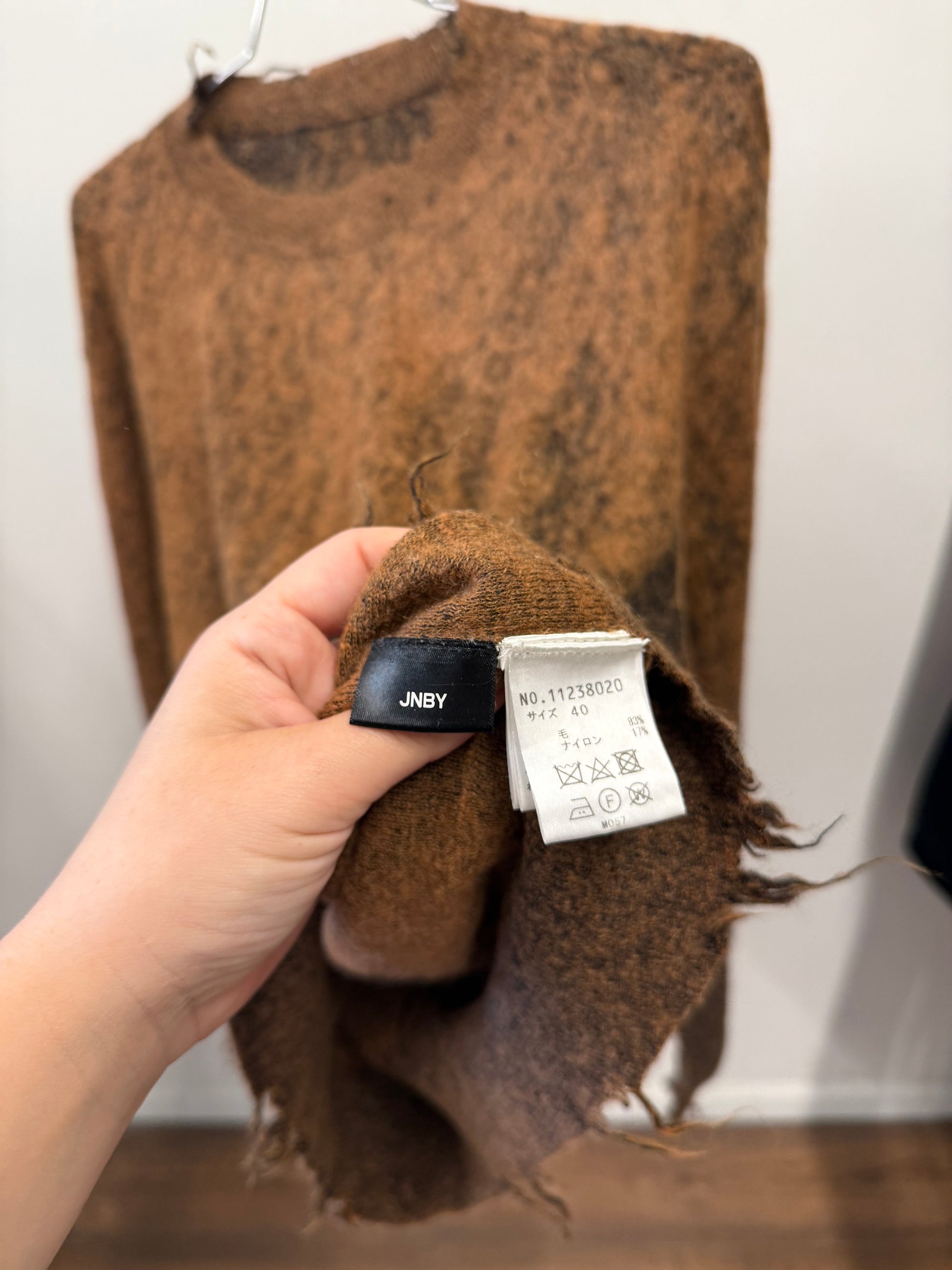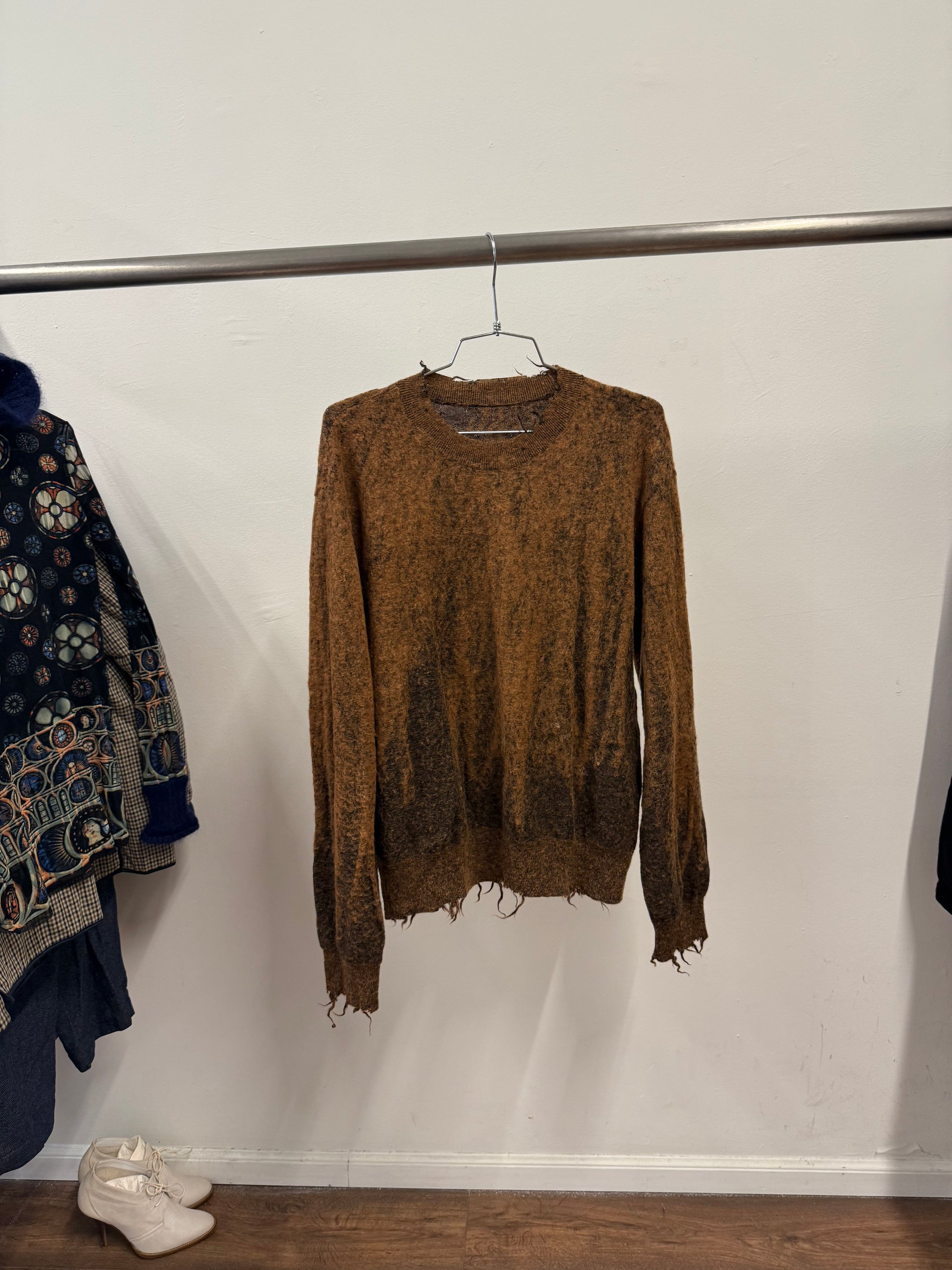 Soft brown wool-blend knit with a deconstructed finish, raw edges and subtle ombré fading.