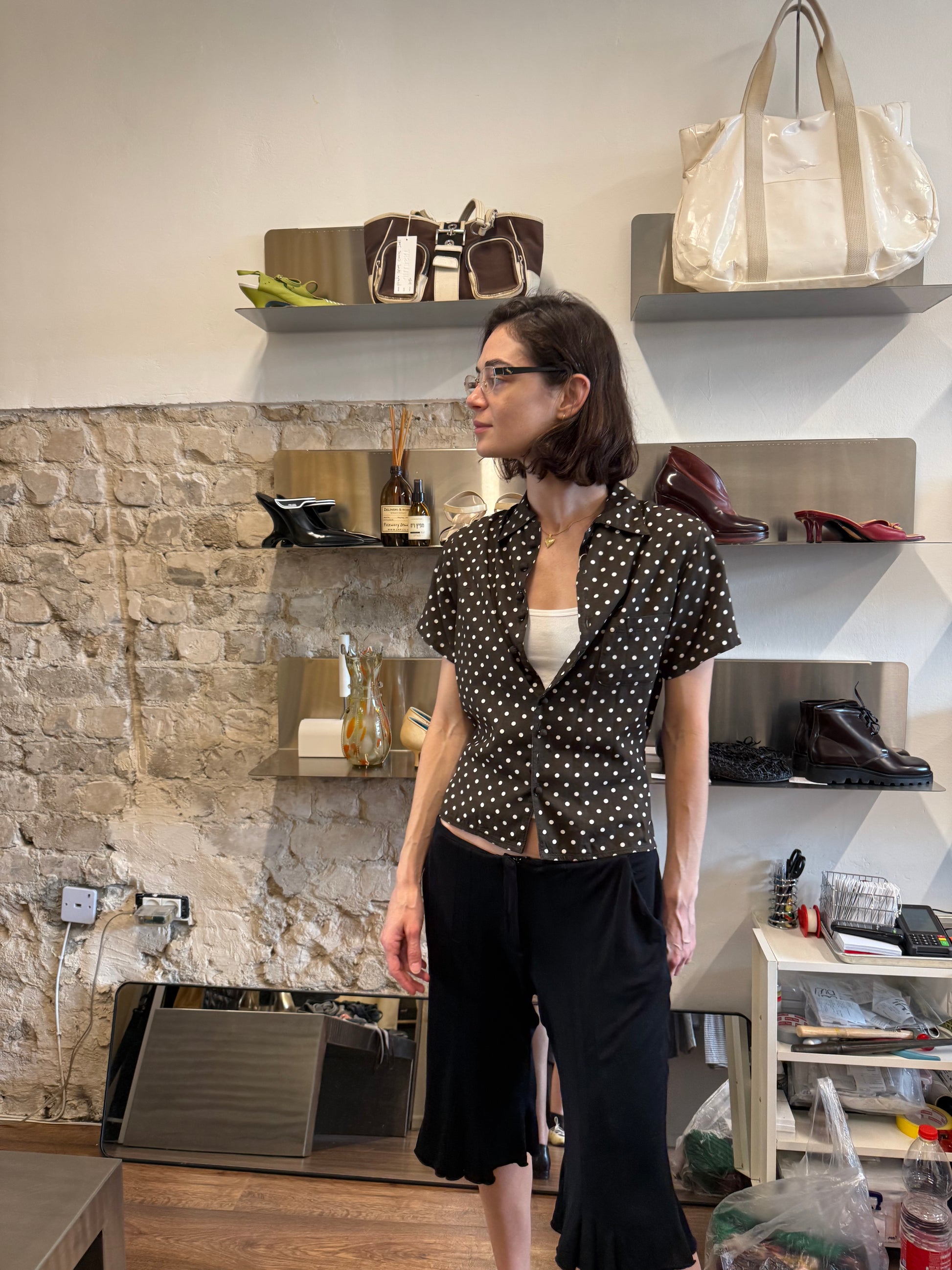 Brown short-sleeve cotton shirt with white polka dots, fabric-covered buttons, and front pocket. Adjustable waist tie at the back for a fitted or relaxed silhouette.