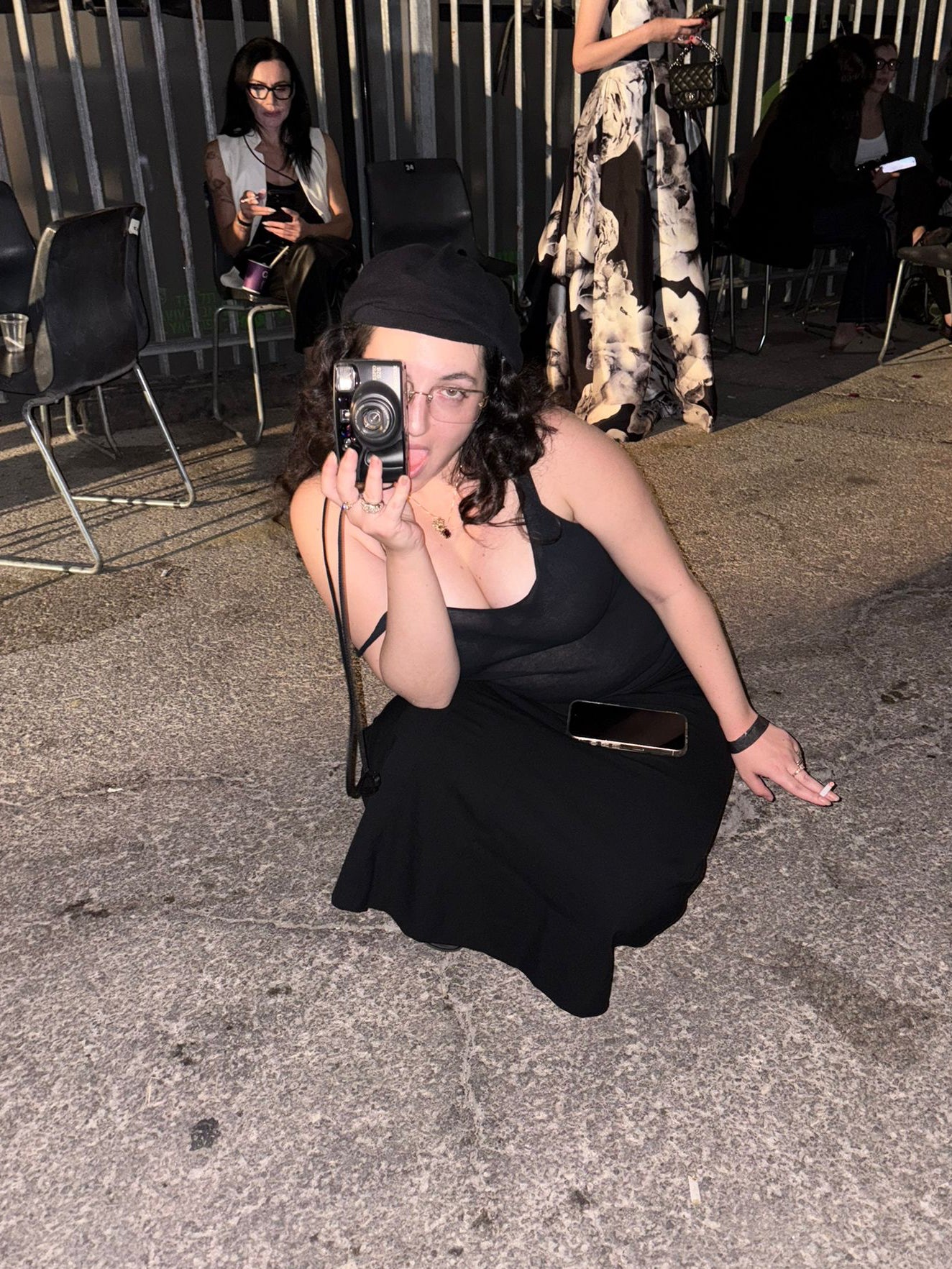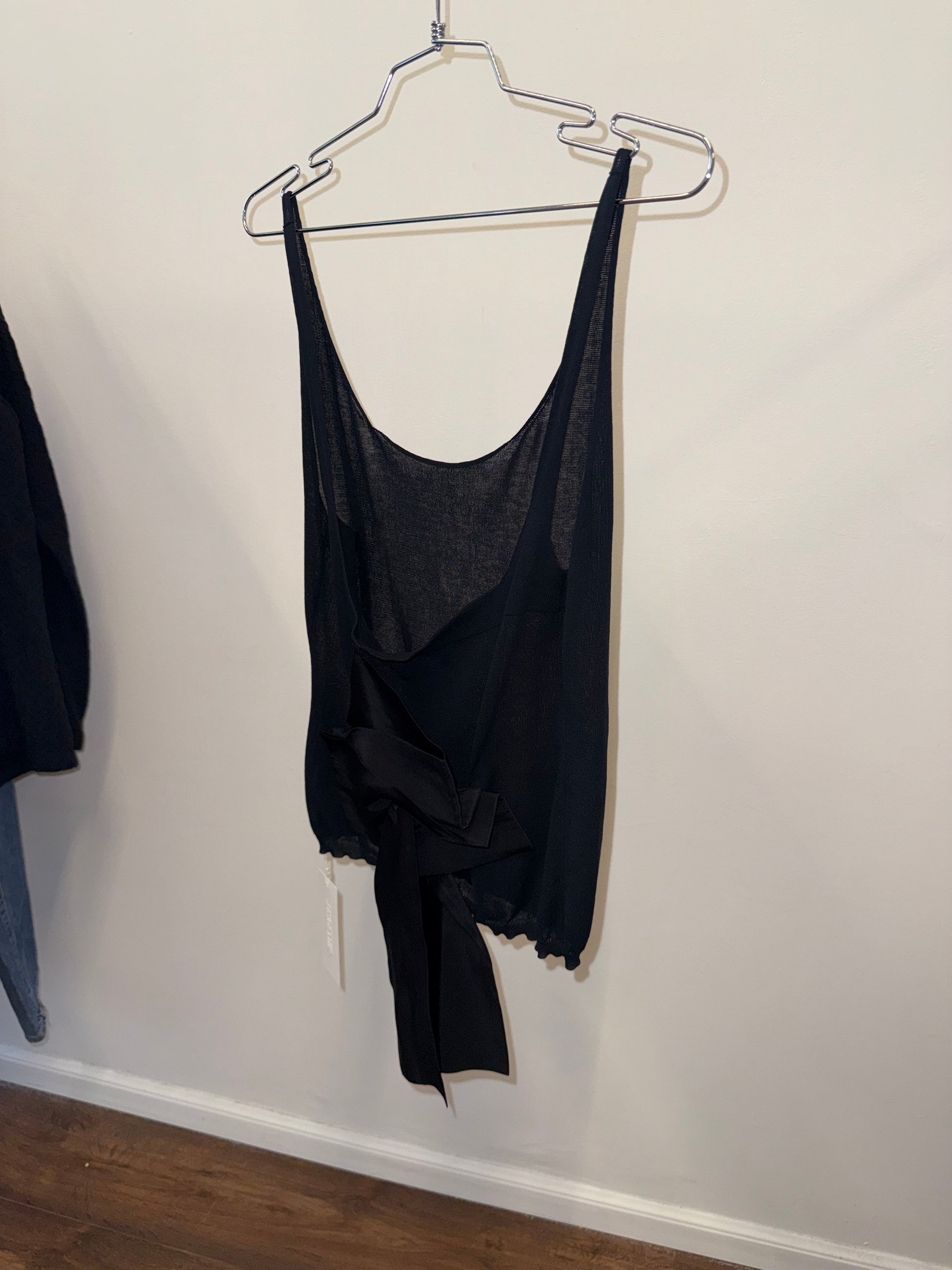 Ultra-sheer black knit tank with dramatic silk organza bow detail front. Stretch hem for shape.