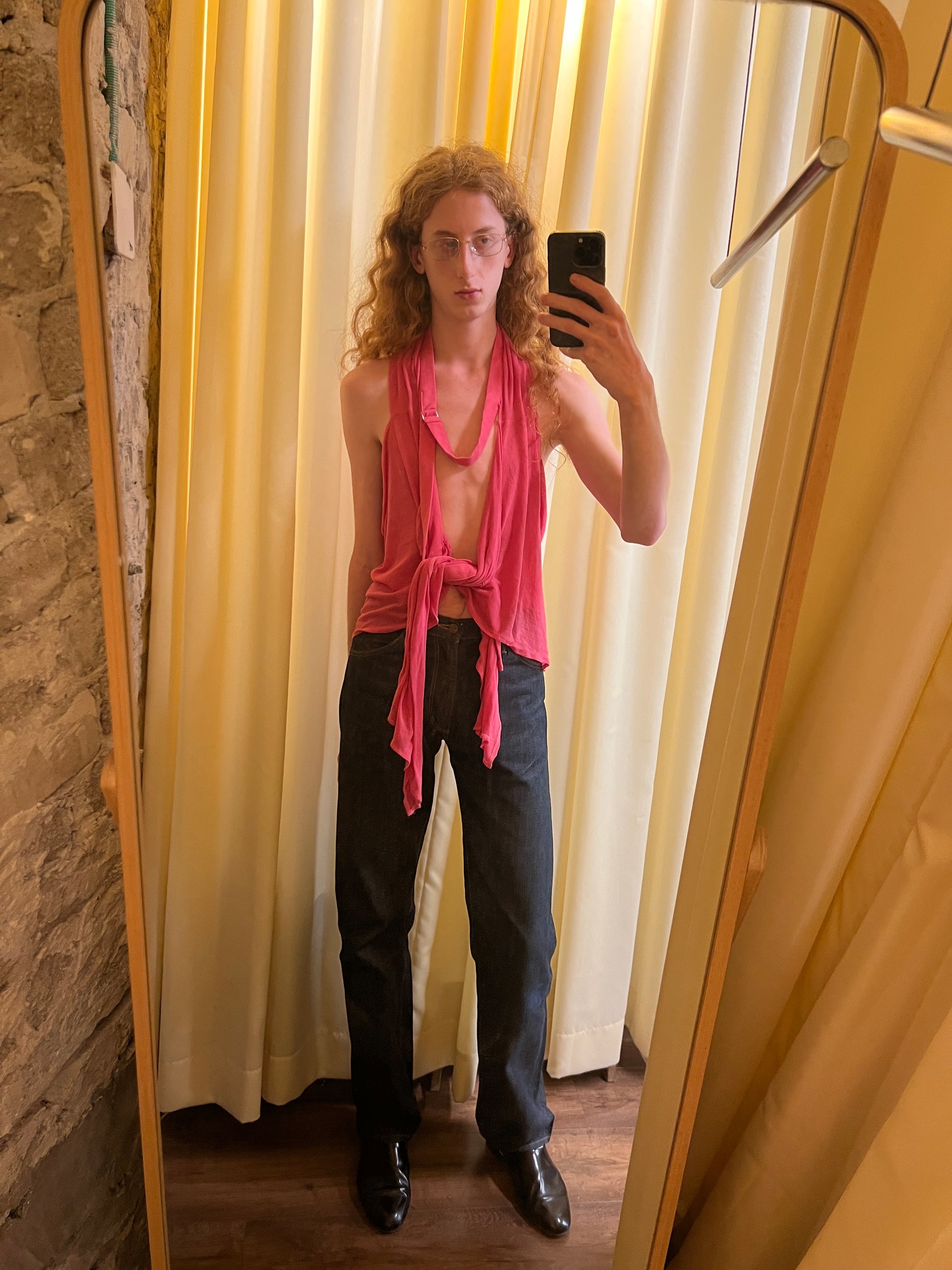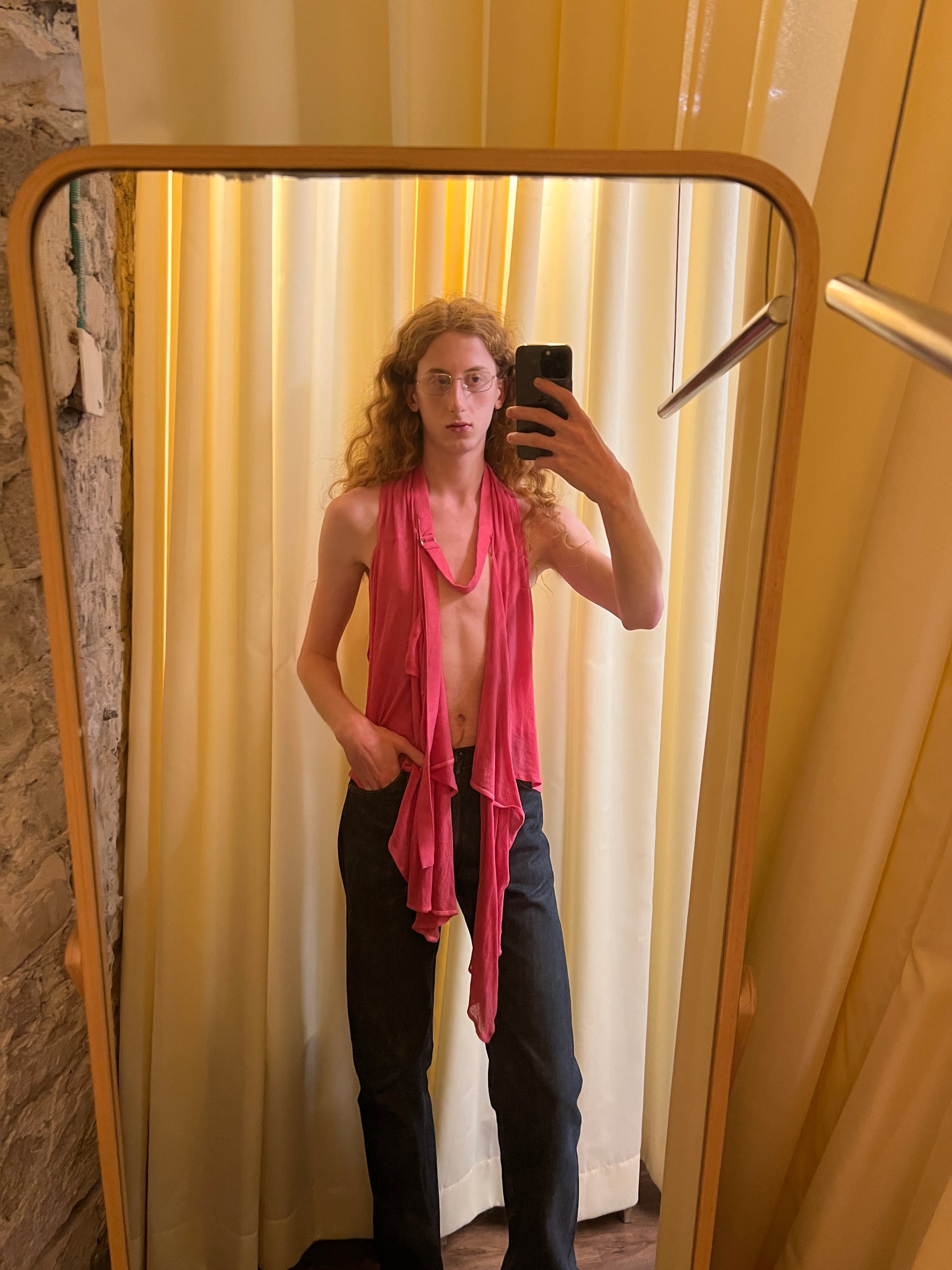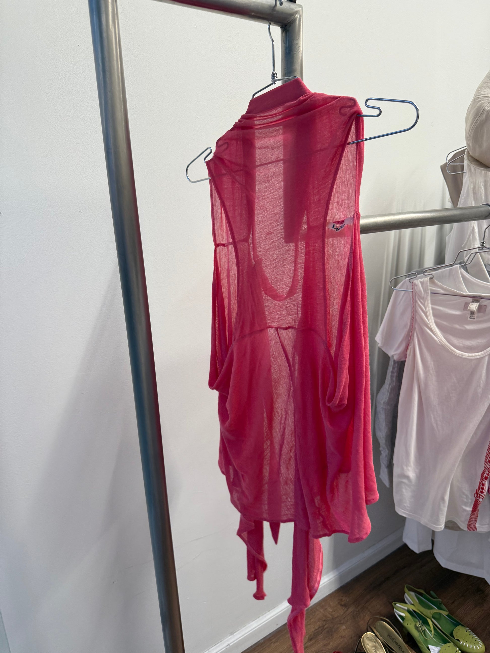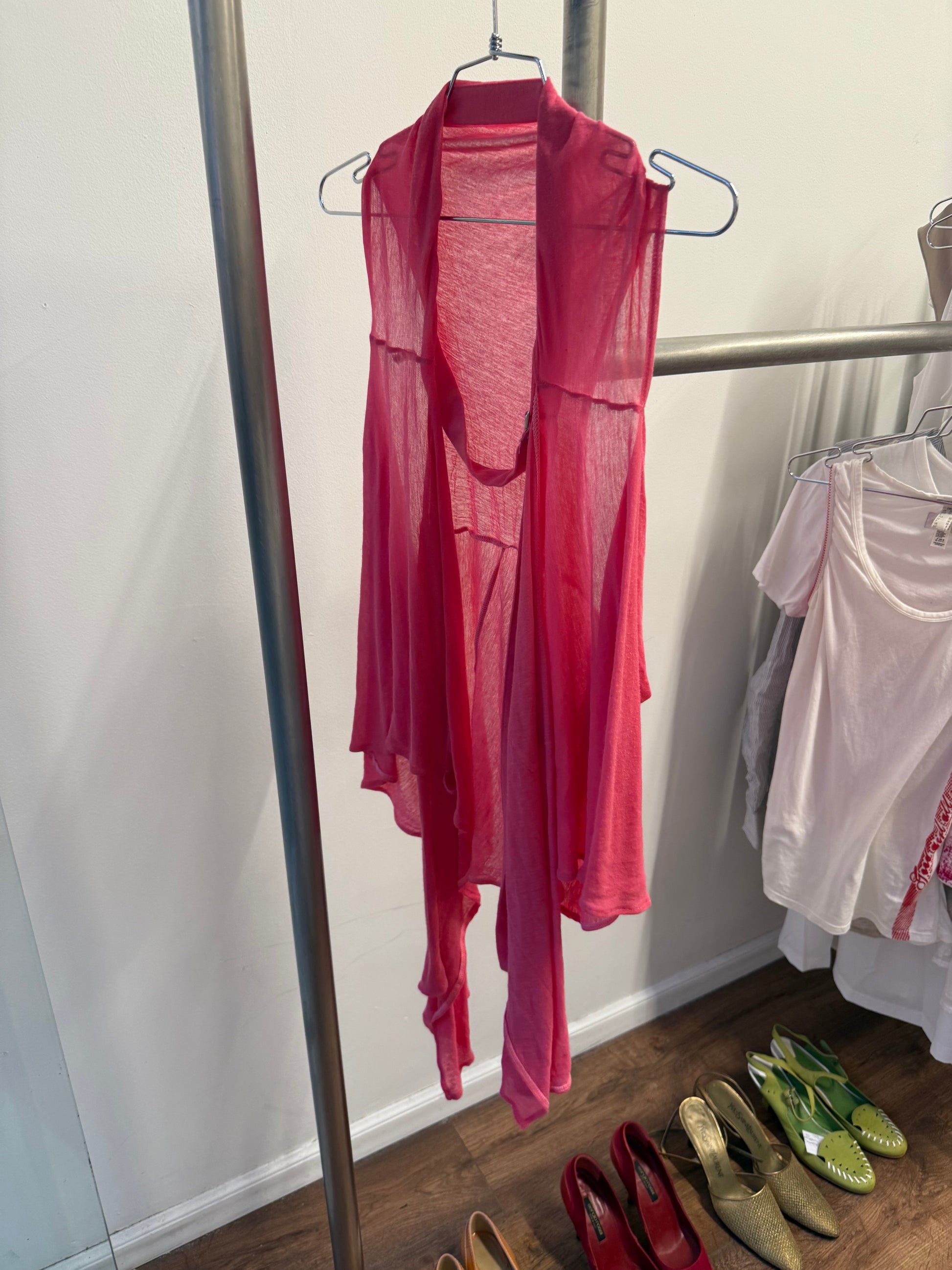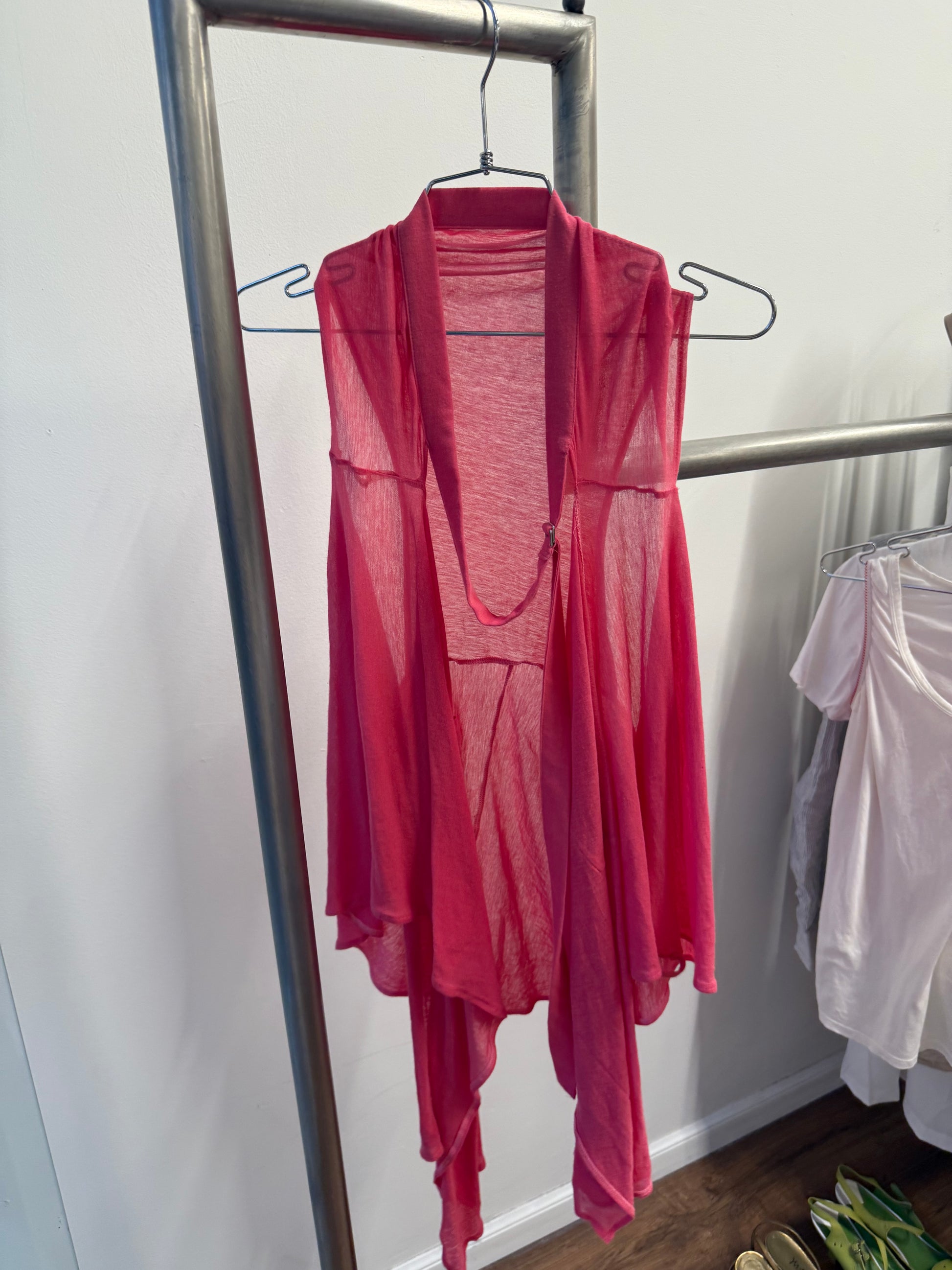 a unique deformed design of a vest that can be worn multiple ways featuring a belted part at the neck, two pockets on each side, and belt loops to hook ends into them (as shown in picture)