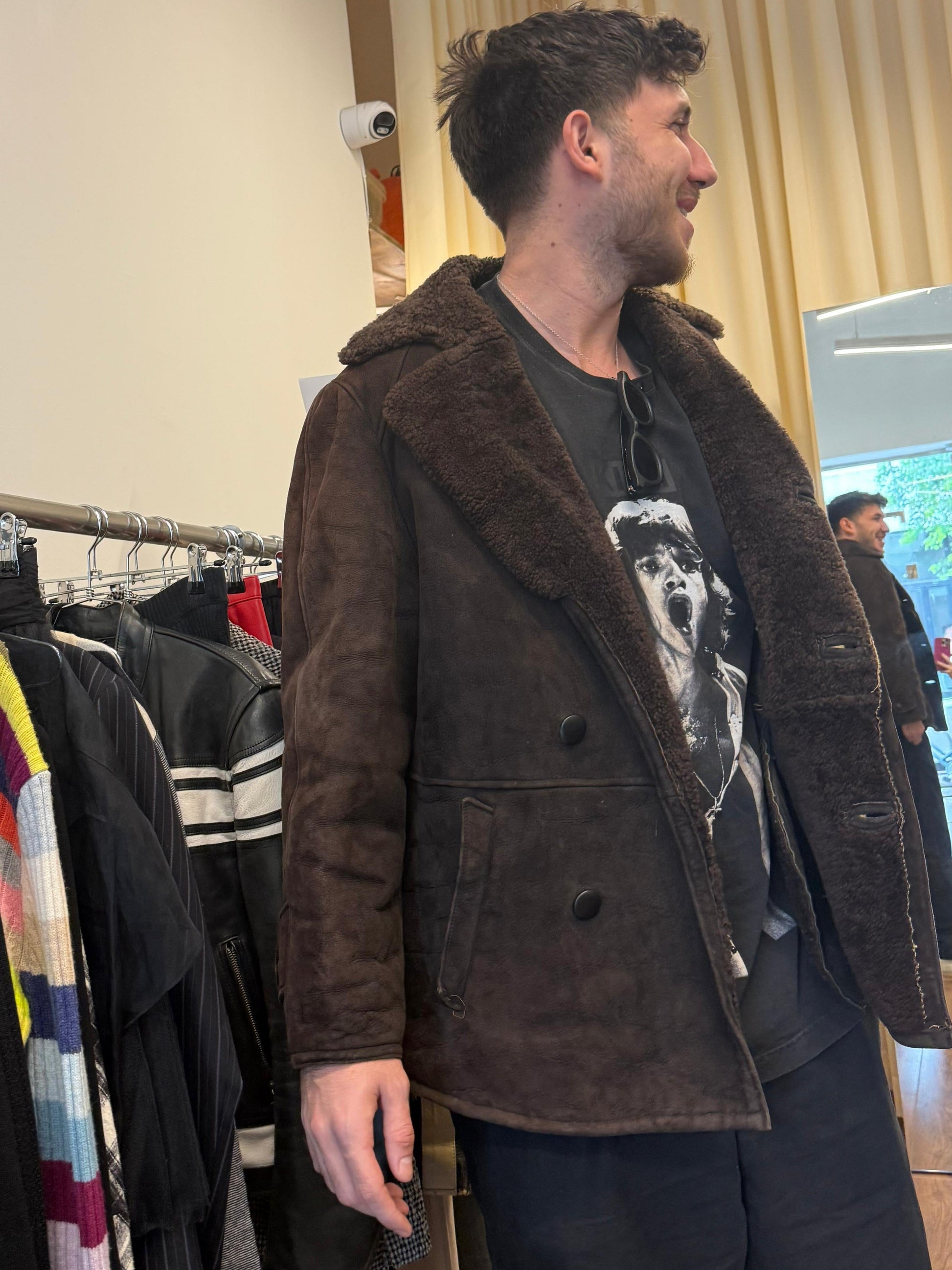 Heavyweight brown shearling coat with a classic aviator silhouette, oversized shearling collar, double-breasted front with matte buttons, curved panel construction and turned cuffs. Rich, worn-in suede exterior with full shearling lining for serious warmth and structure.