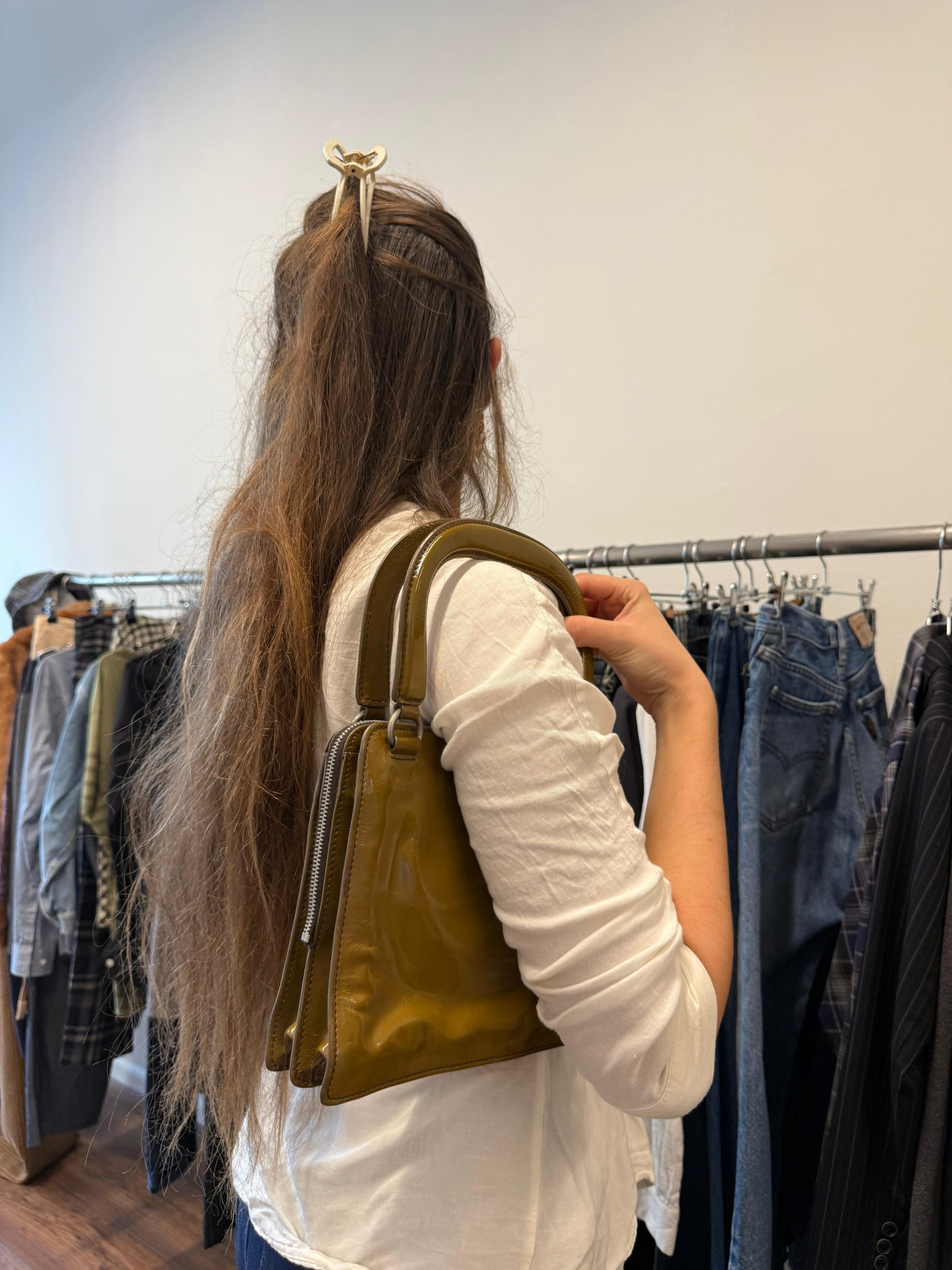 Soft olive-green glossy leather with structured top handle and silver-tone hardware.
