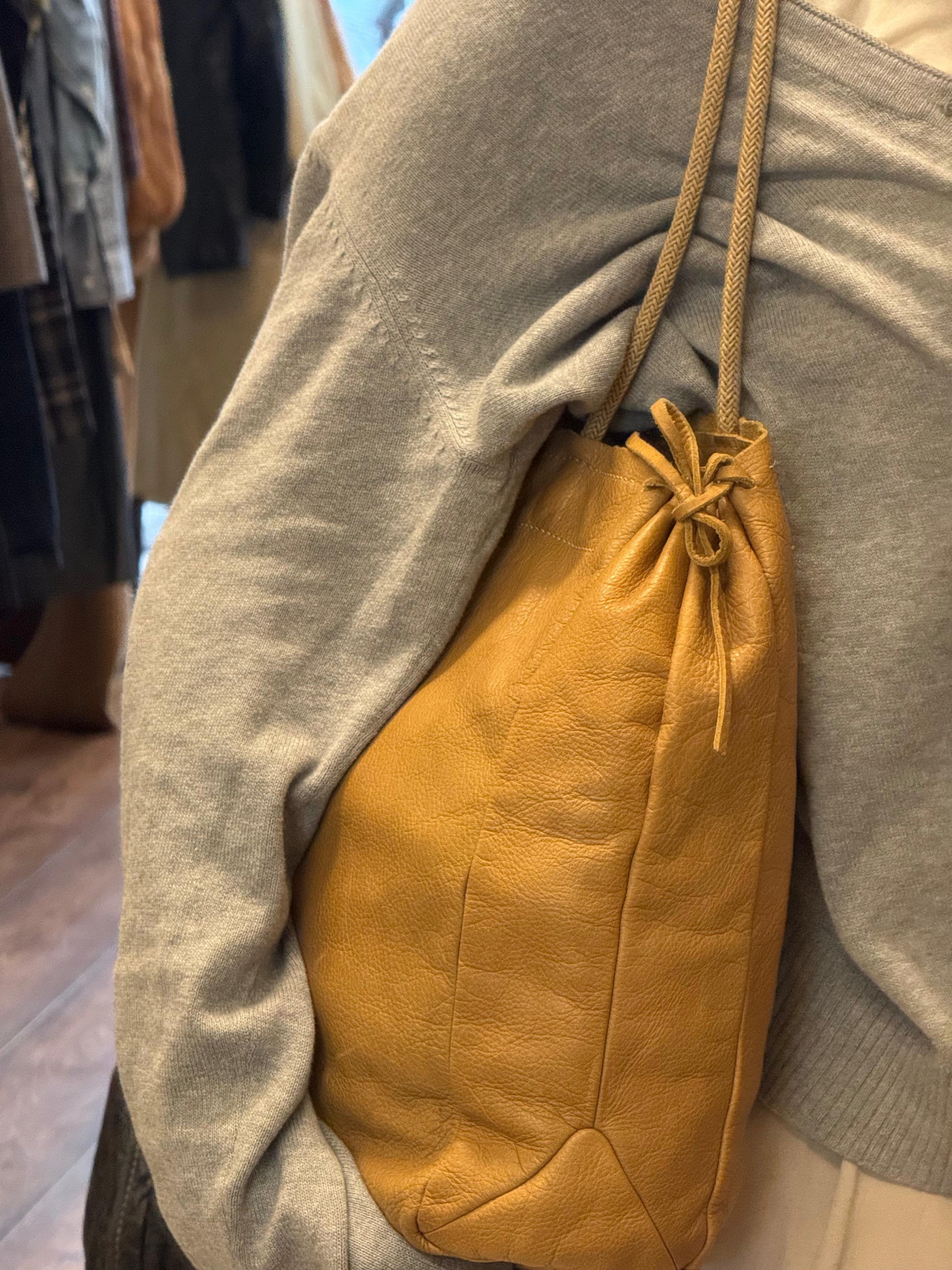 Relaxed pouch silhouette with leather drawstring closure, subtle embossed logo, woven fabric shoulder straps and a suede interior.
