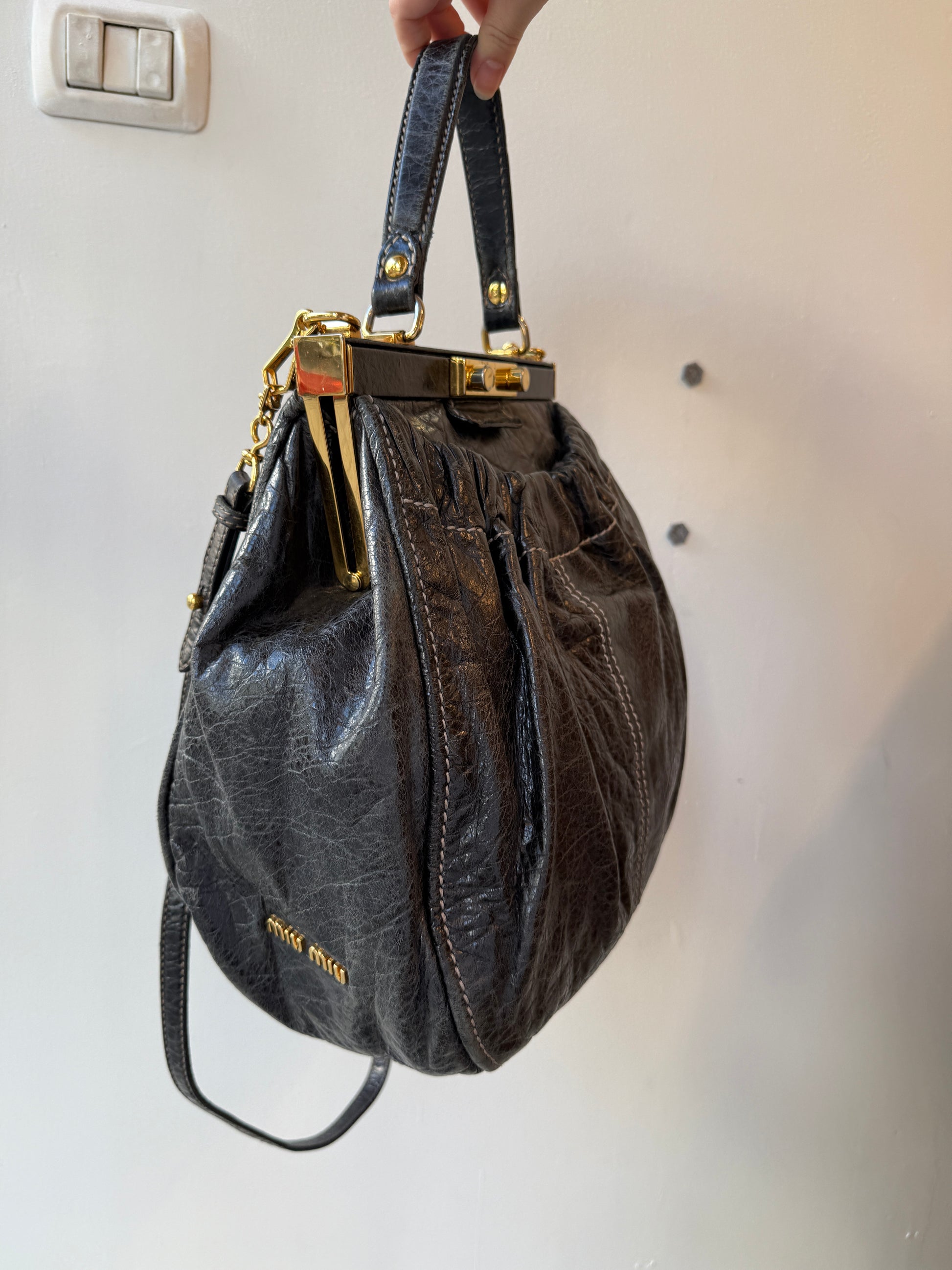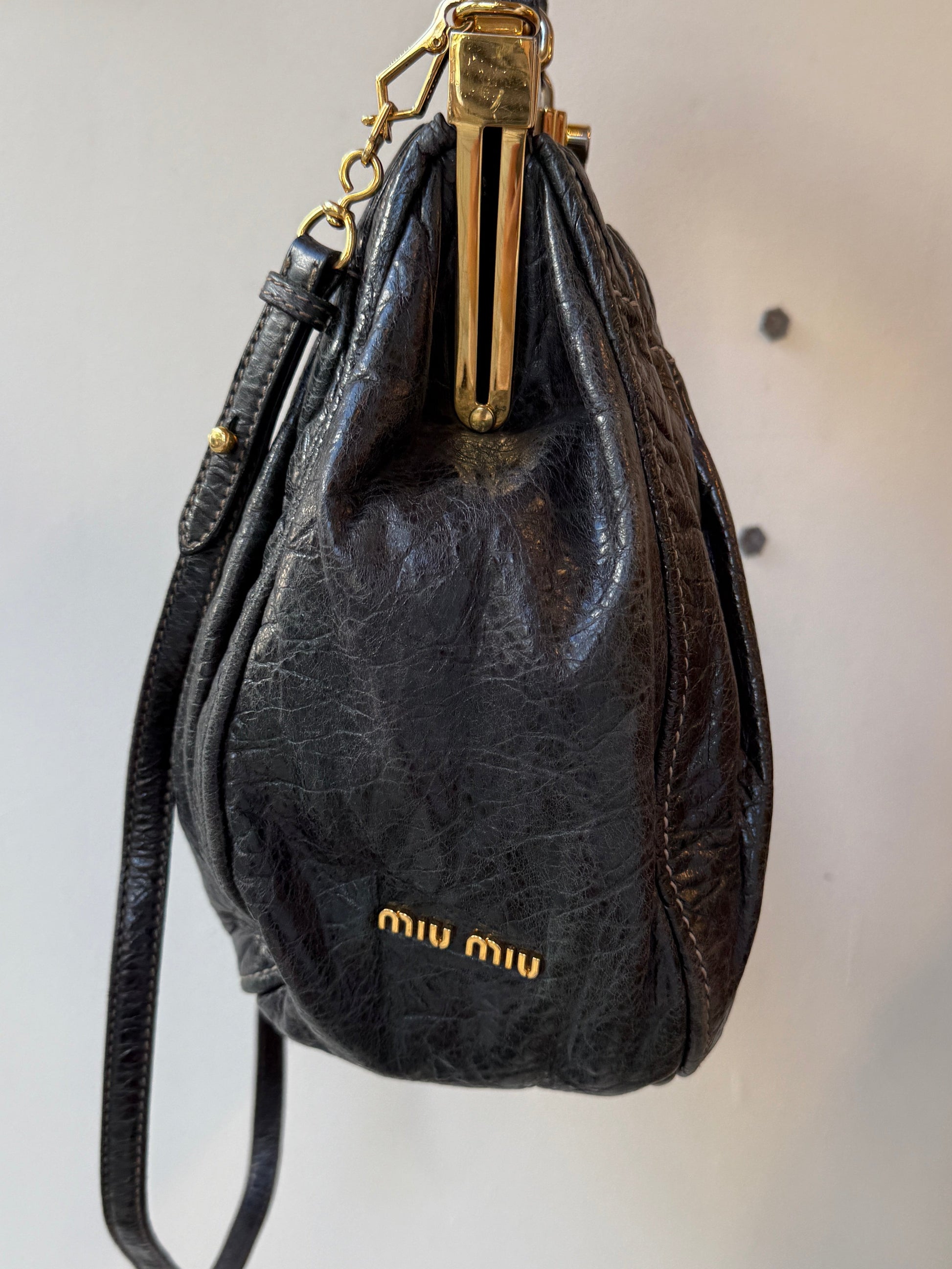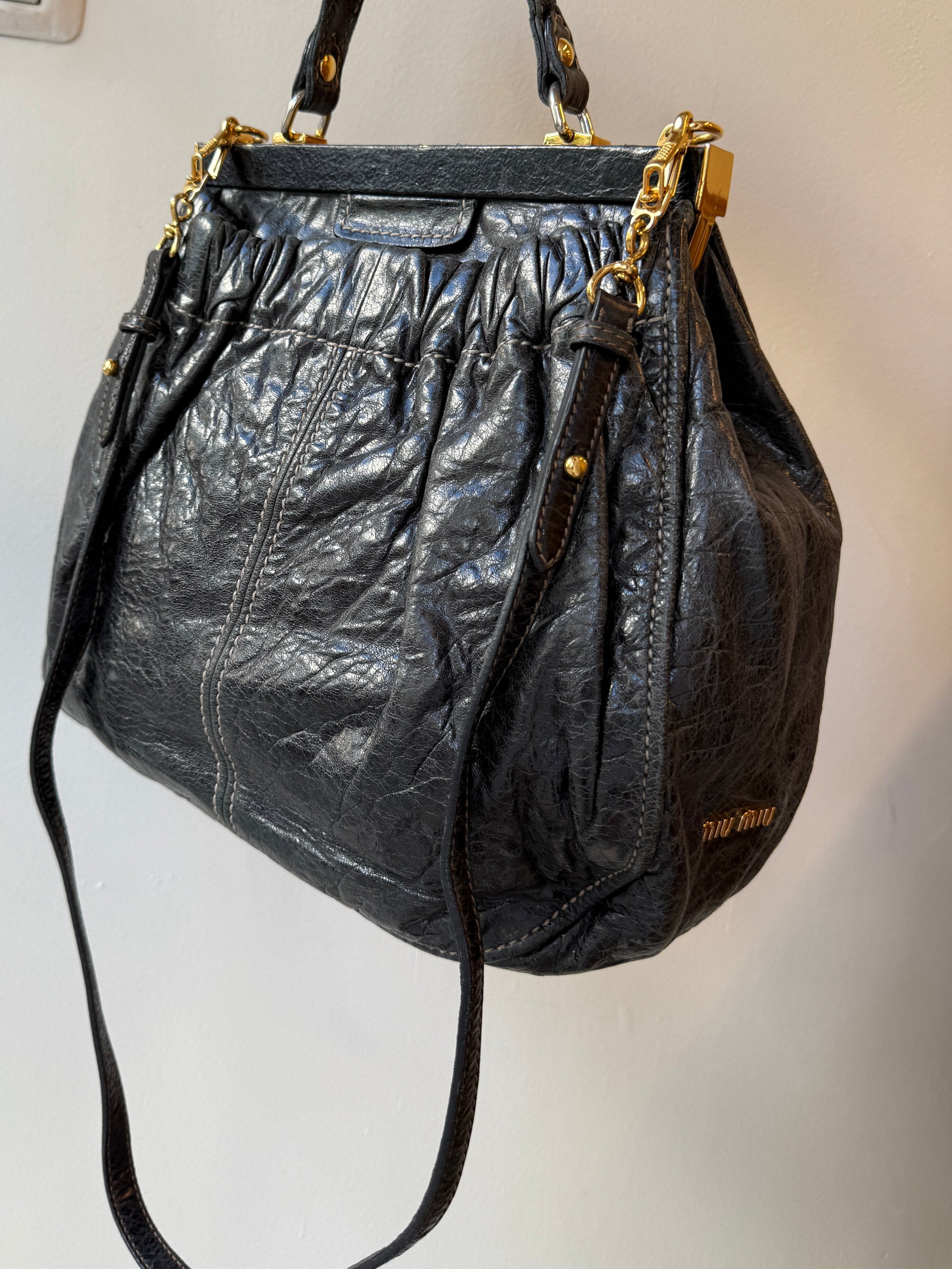 Featuring soft black leather with a structured frame closure, gold-tone hardware, top handle and a removable long shoulder strap. Includes original small key charm. Interior lined with fabric and one zip pocket.