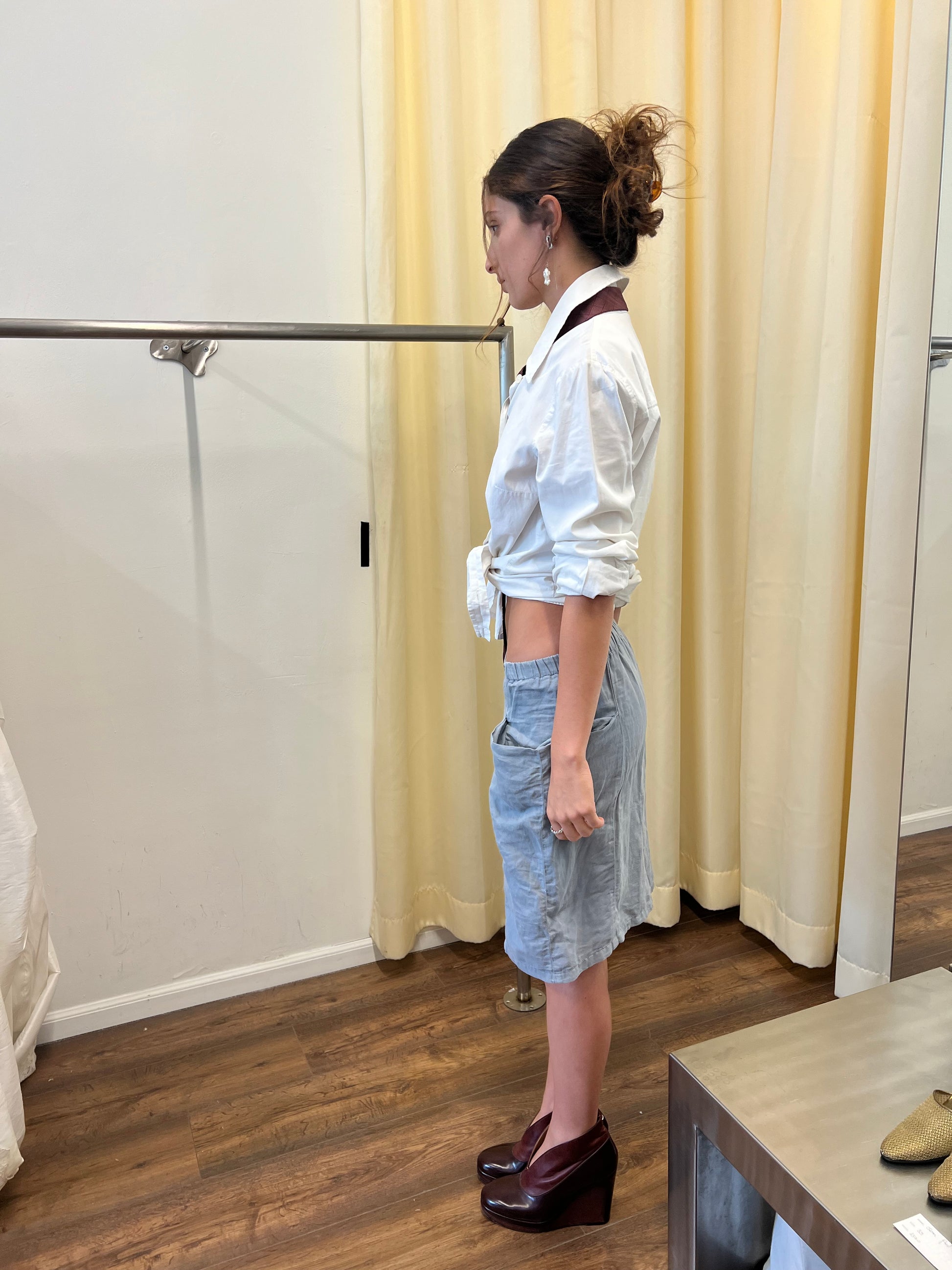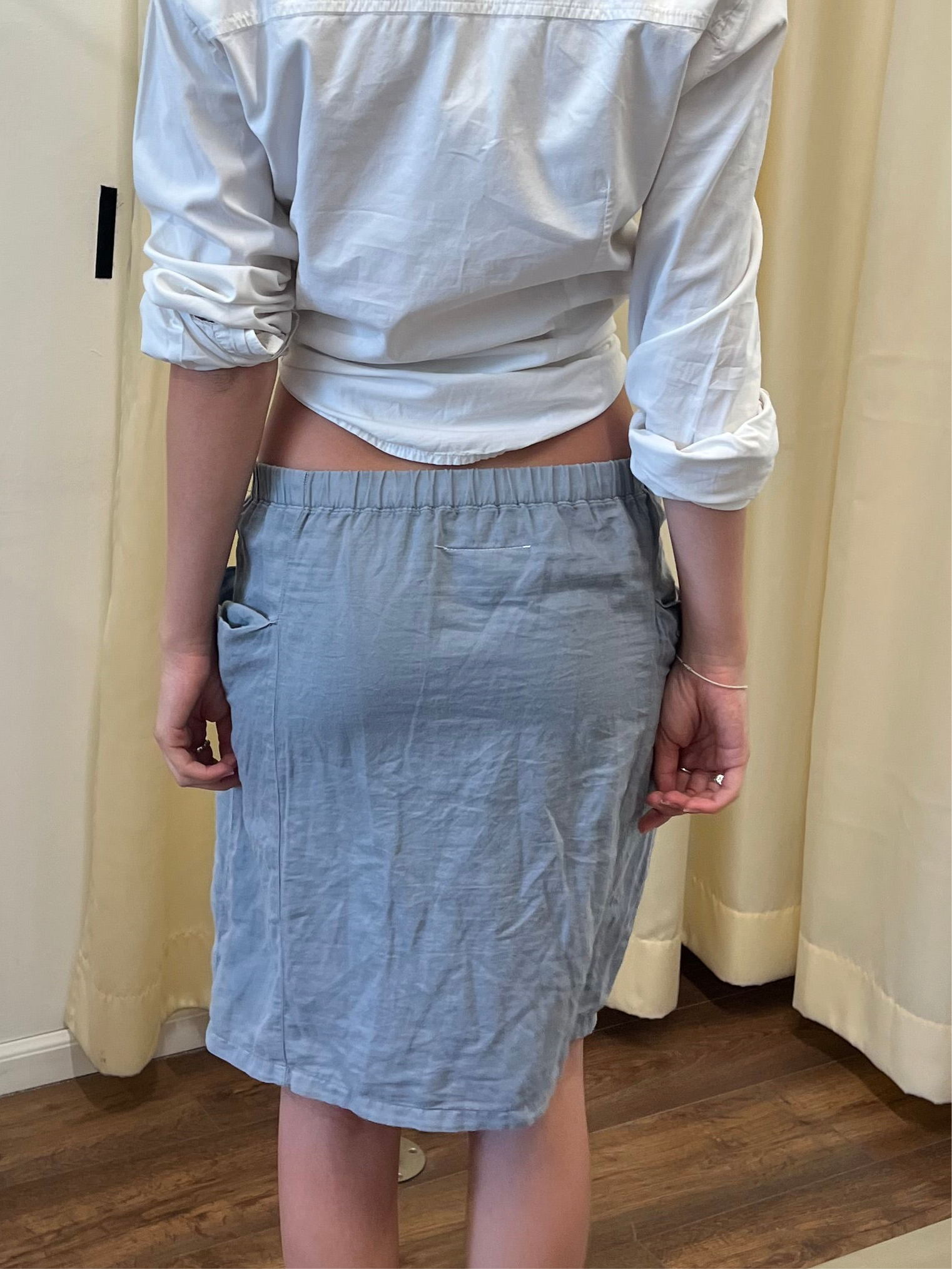 grey mid length skirt with a waistband that could also be worn as a strapless top