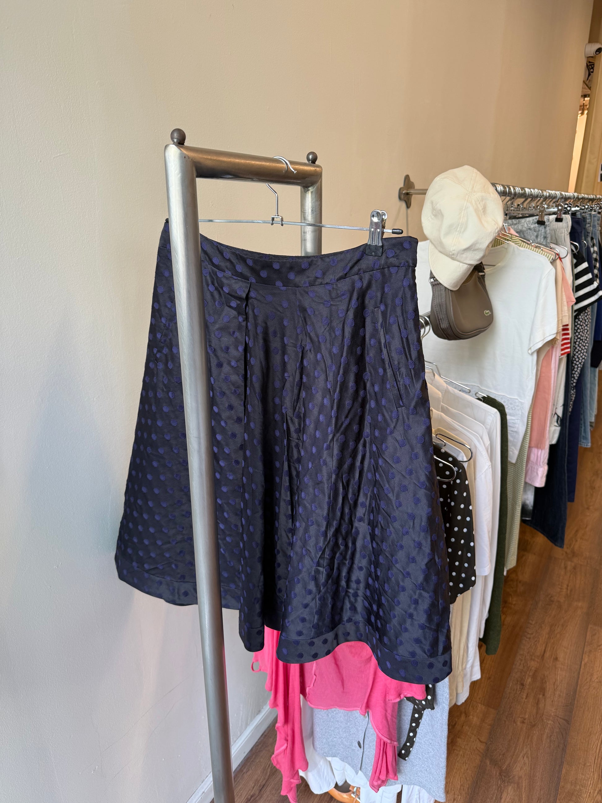 Featuring fluid black fabric with subtle tonal polka dots, cut in a mid-length silhouette with soft pleats for natural movement.