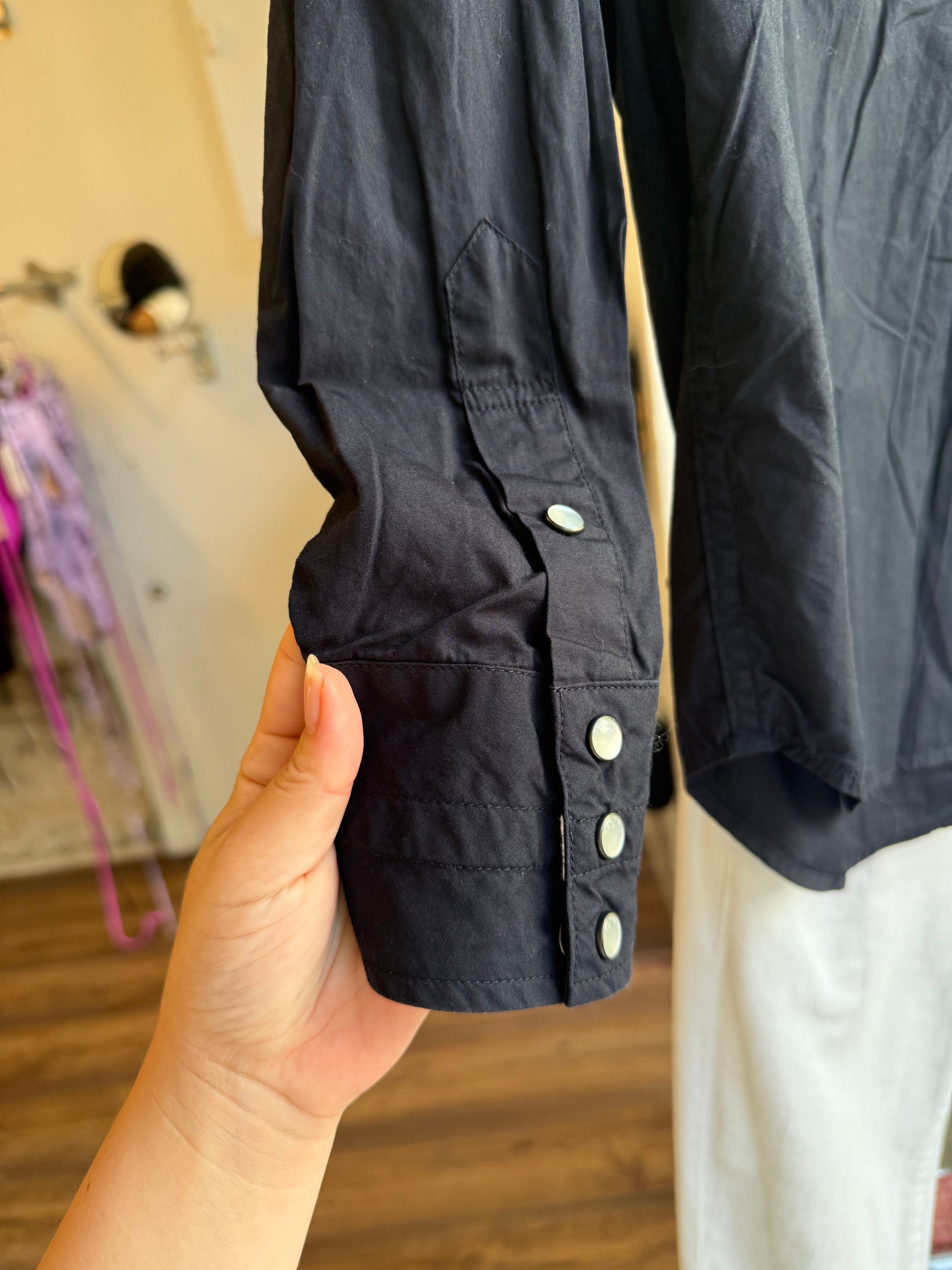 Crisp black cotton shirt with hidden music score trim inside the cuffs – a subtle nod to Takahiro Miyashita’s rock-inspired universe. Featuring silver-tone snap buttons and elongated cut.