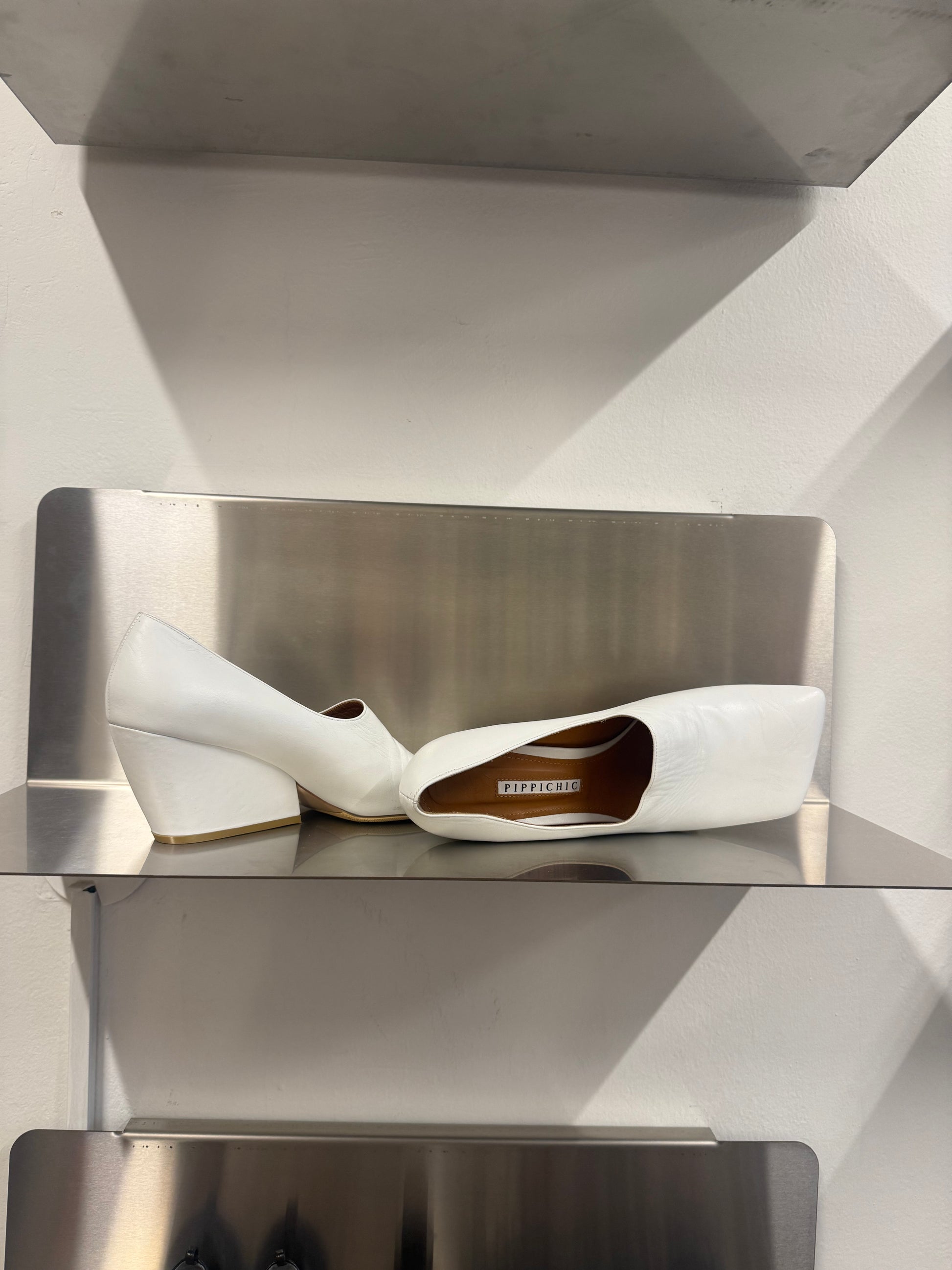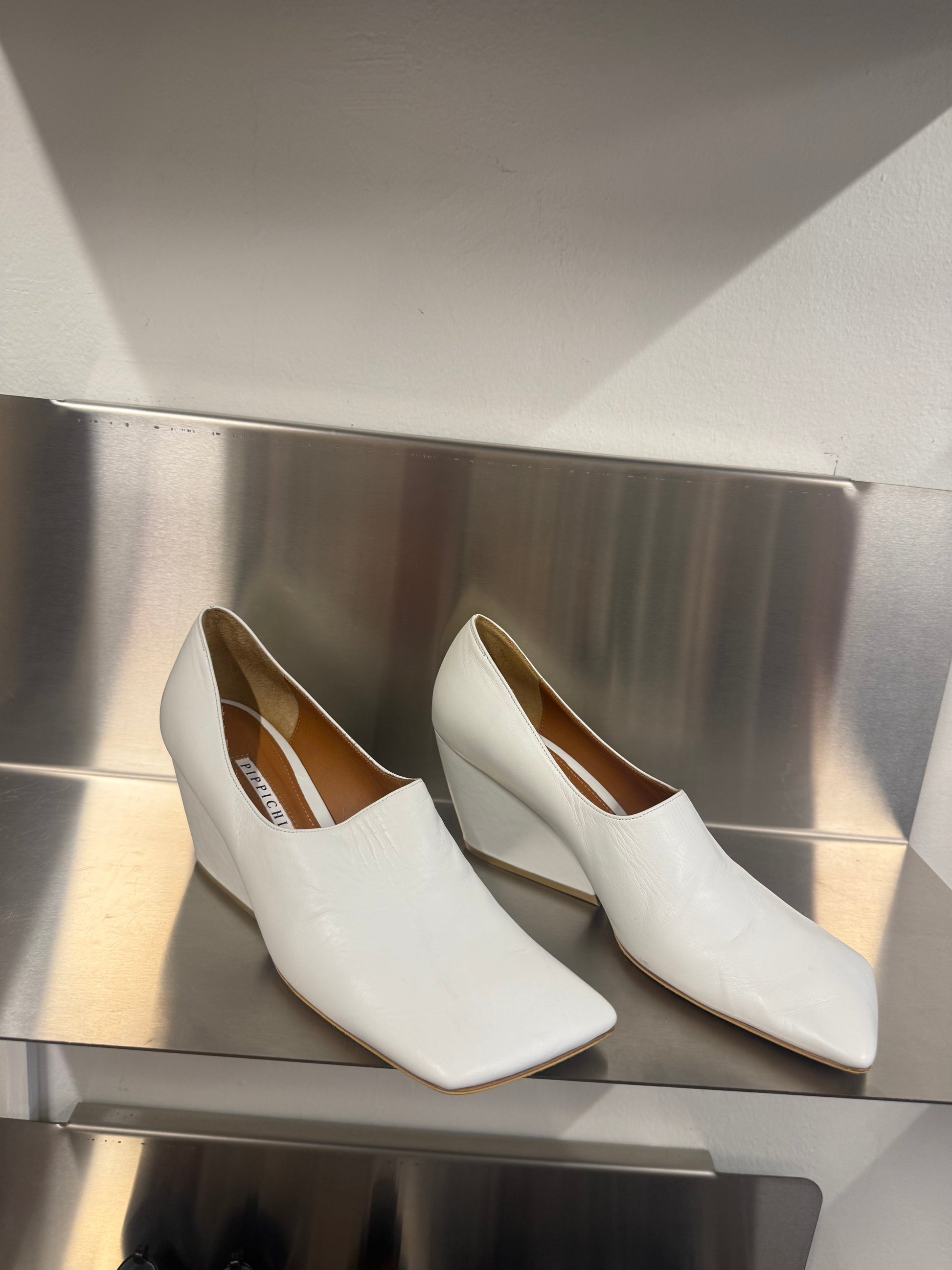 Minimalist square-toe wedges in smooth white leather, architectural block wedge heel.