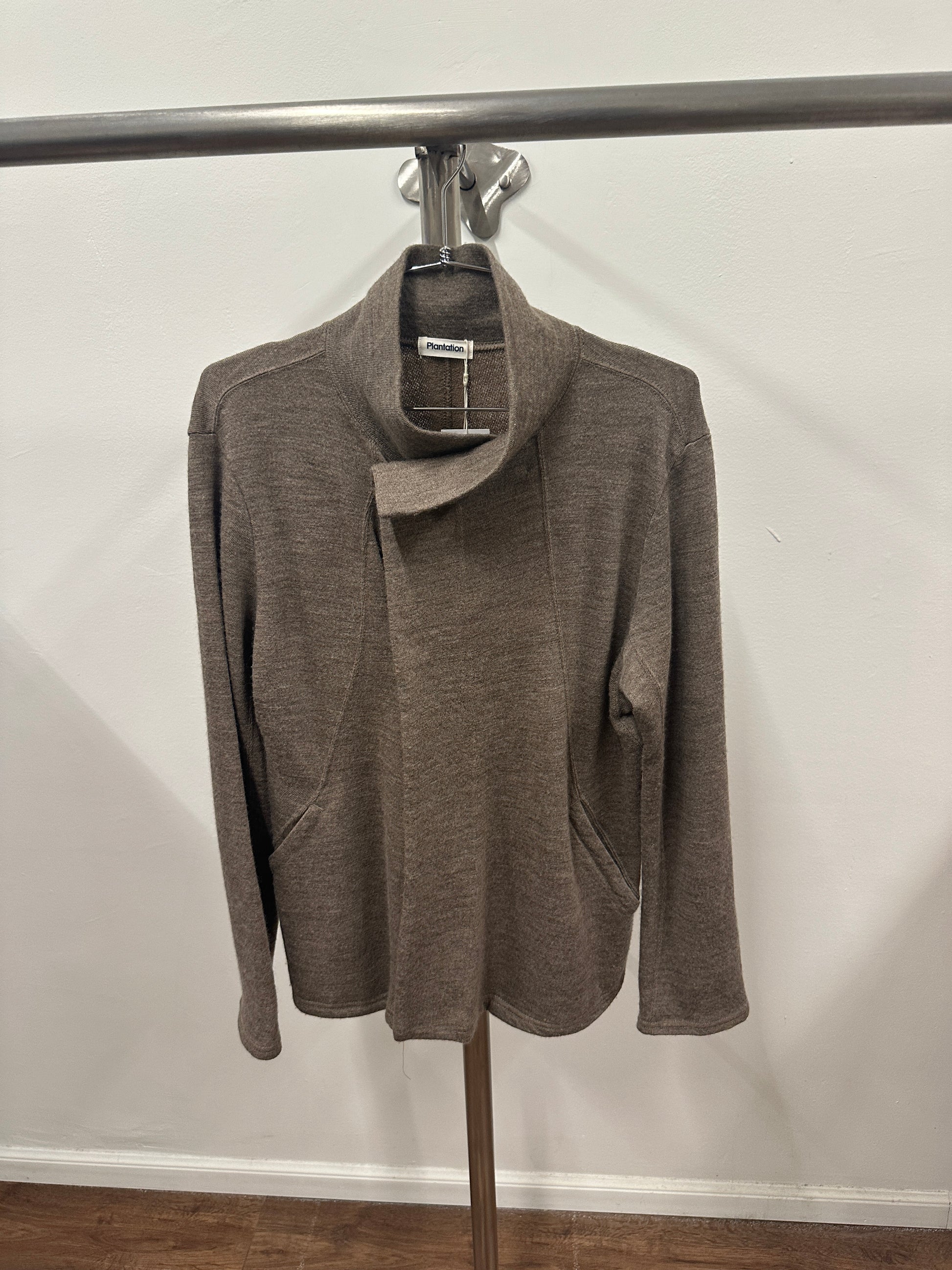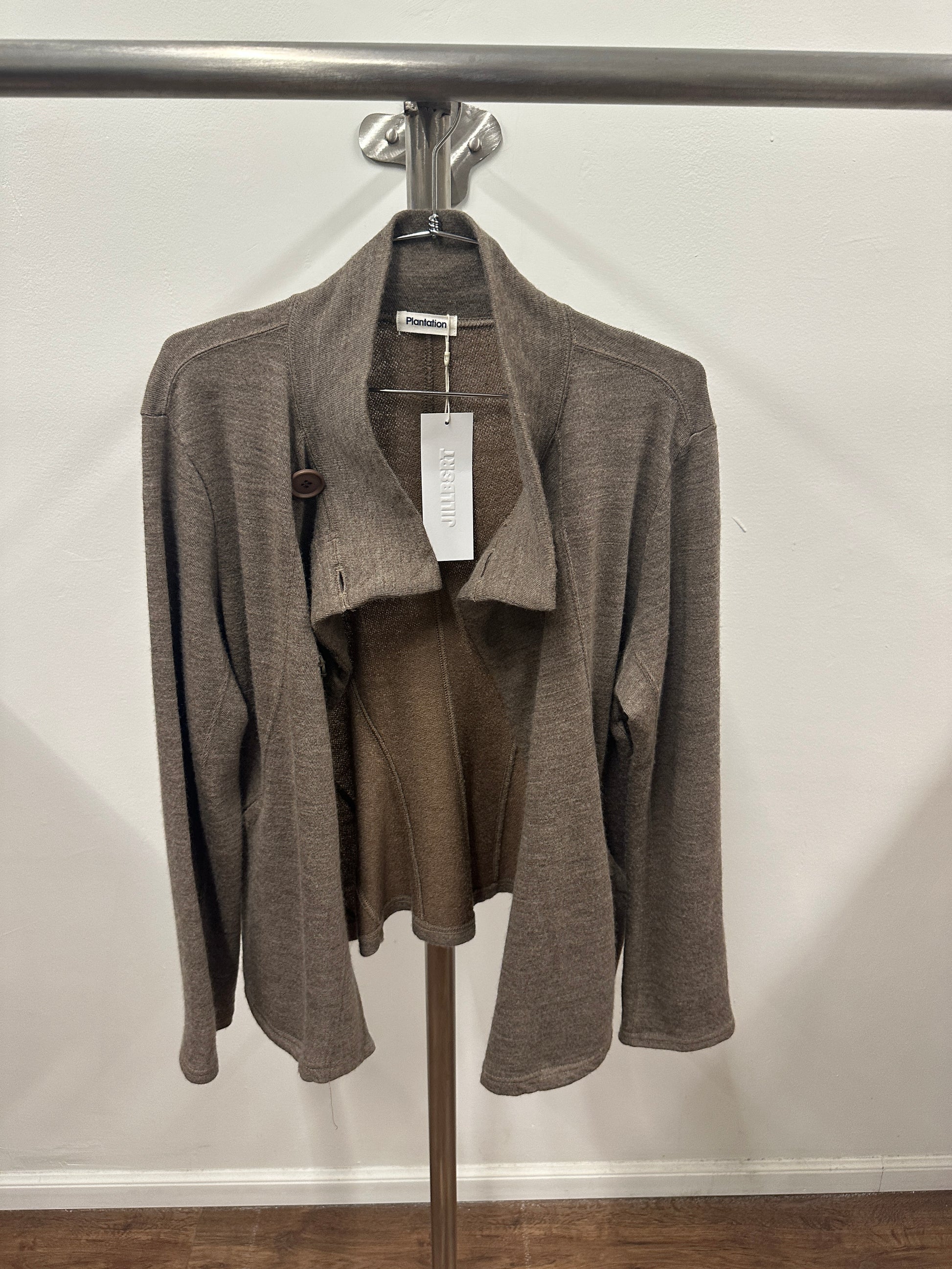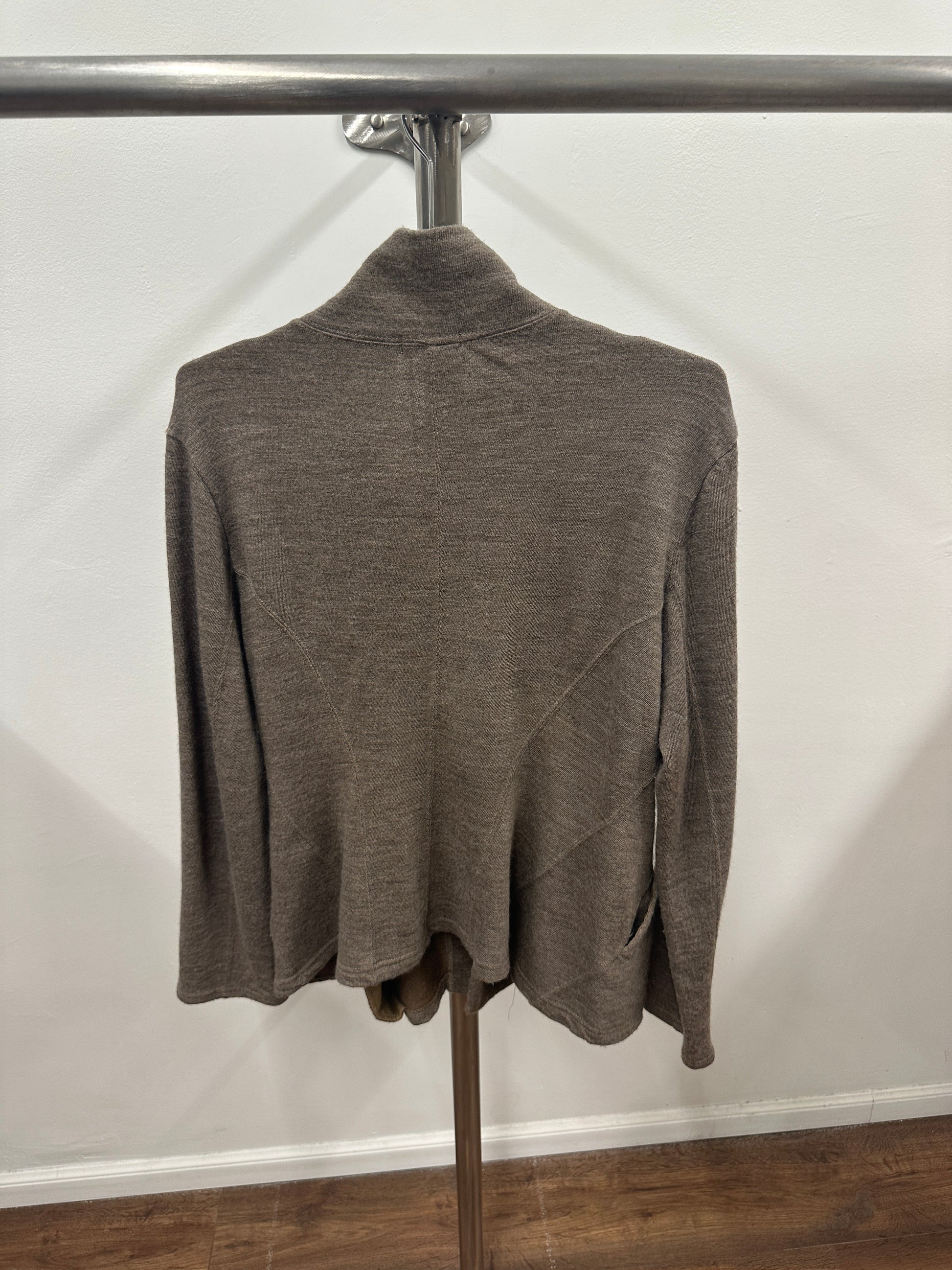 Brown wool sweater jacket with two button closure so that the rest is open for an easy wear