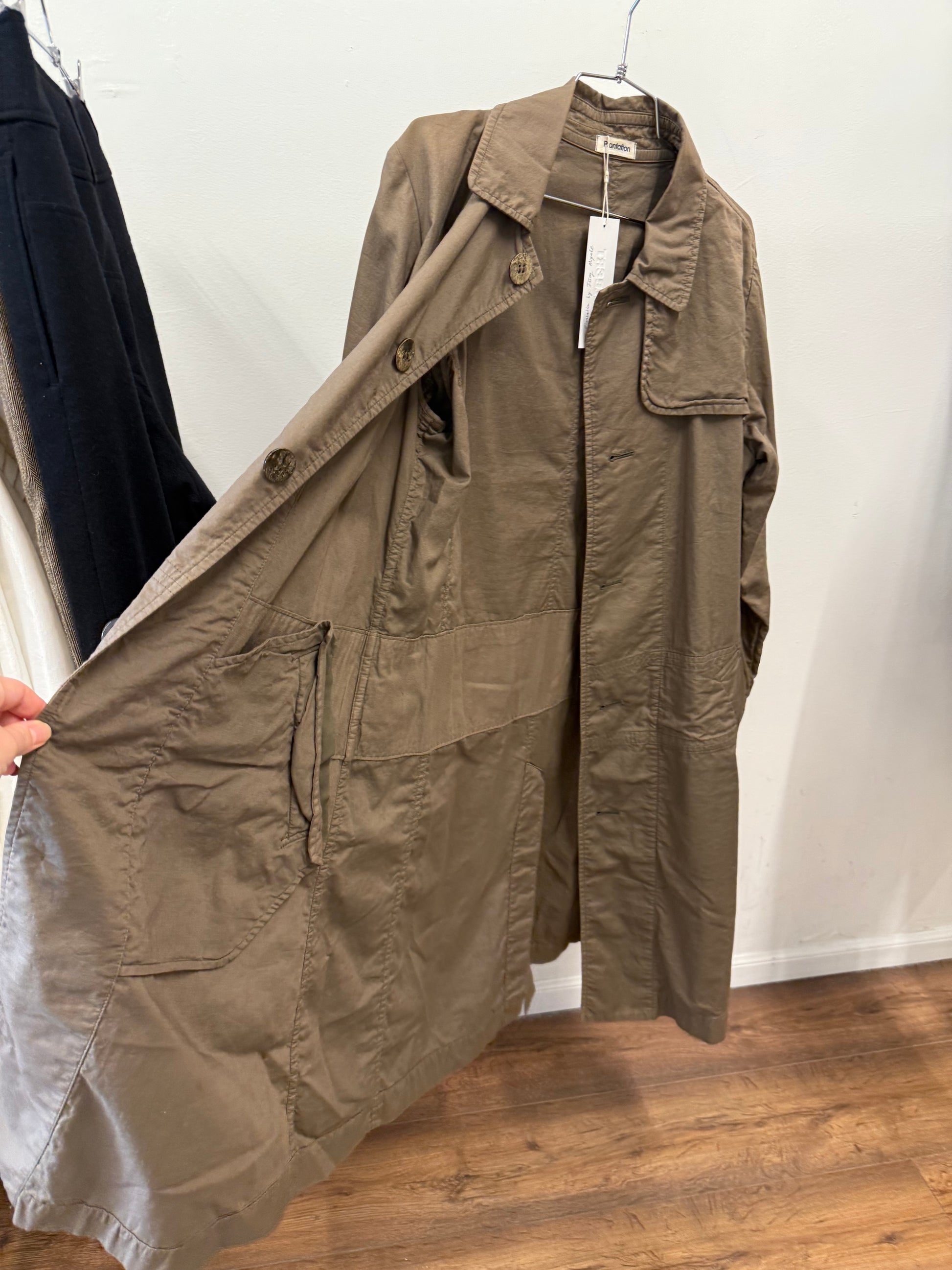 Lightweight khaki cotton with a relaxed, utilitarian cut.