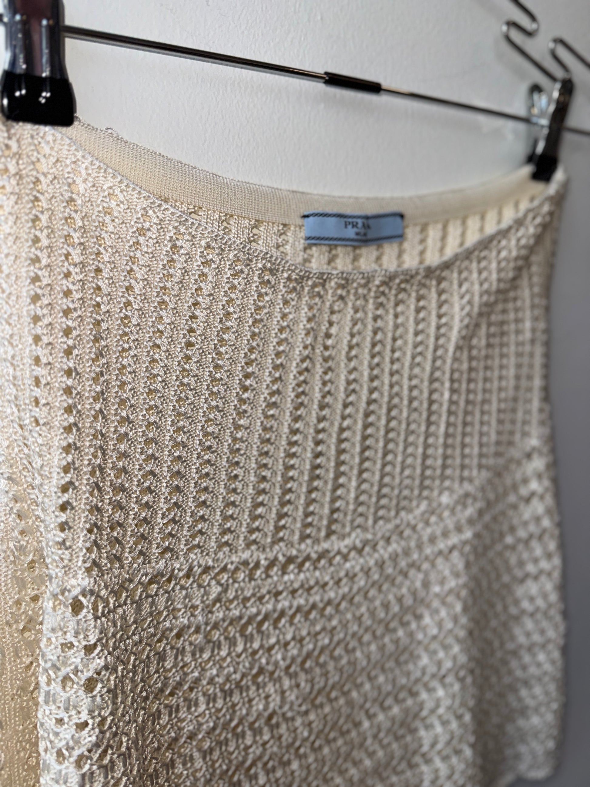 Ivory open-knit construction with a soft stretch waistband, paired with original silk inner slip (86% silk, 14% elastane) for contrast and coverage. Subtle texture shift between upper rib and lower crochet gives it that slightly undone, airy Prada feel.