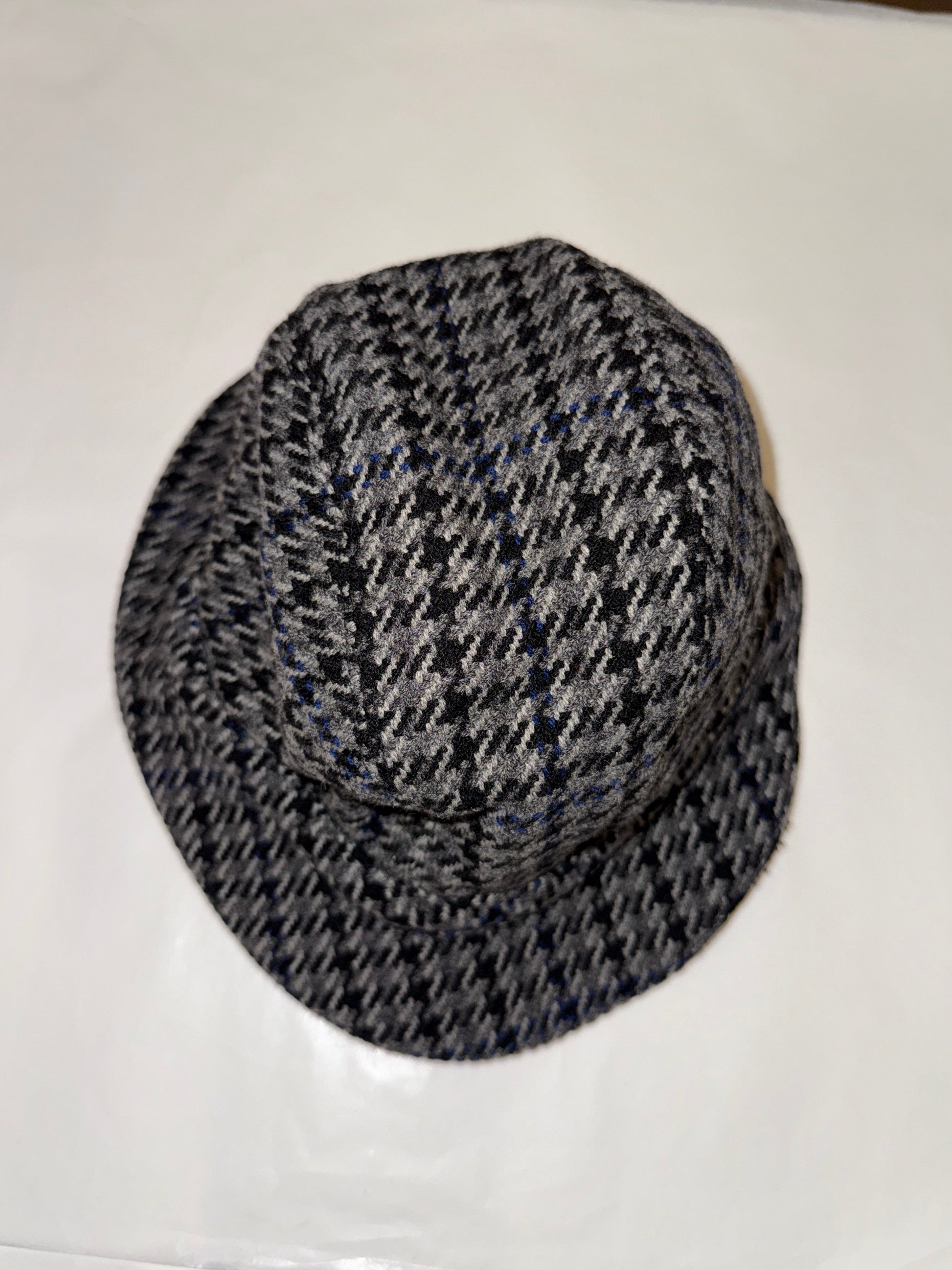 Grey, black and blue wool with a subtle houndstooth-style pattern. Classic bucket silhouette with a soft structured crown and stitched brim. Fully lined in black nylon.
