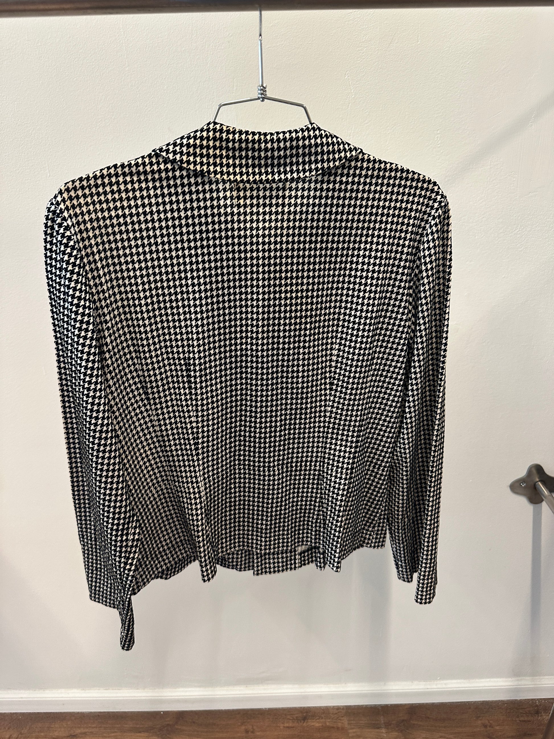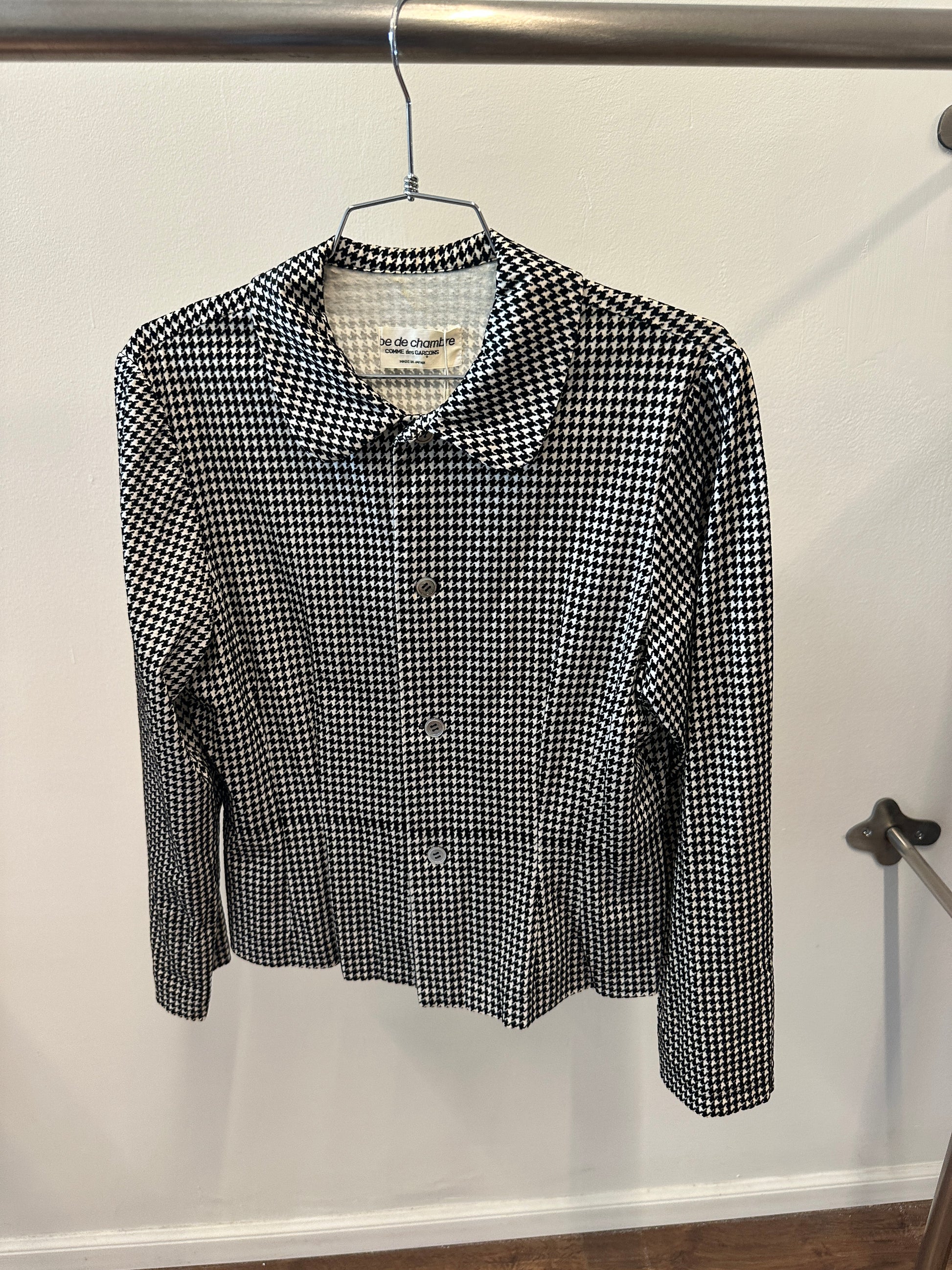 simple peter pan collar light cotton jacket with a houndstooth pattern all over and a pleat right above the lowest button