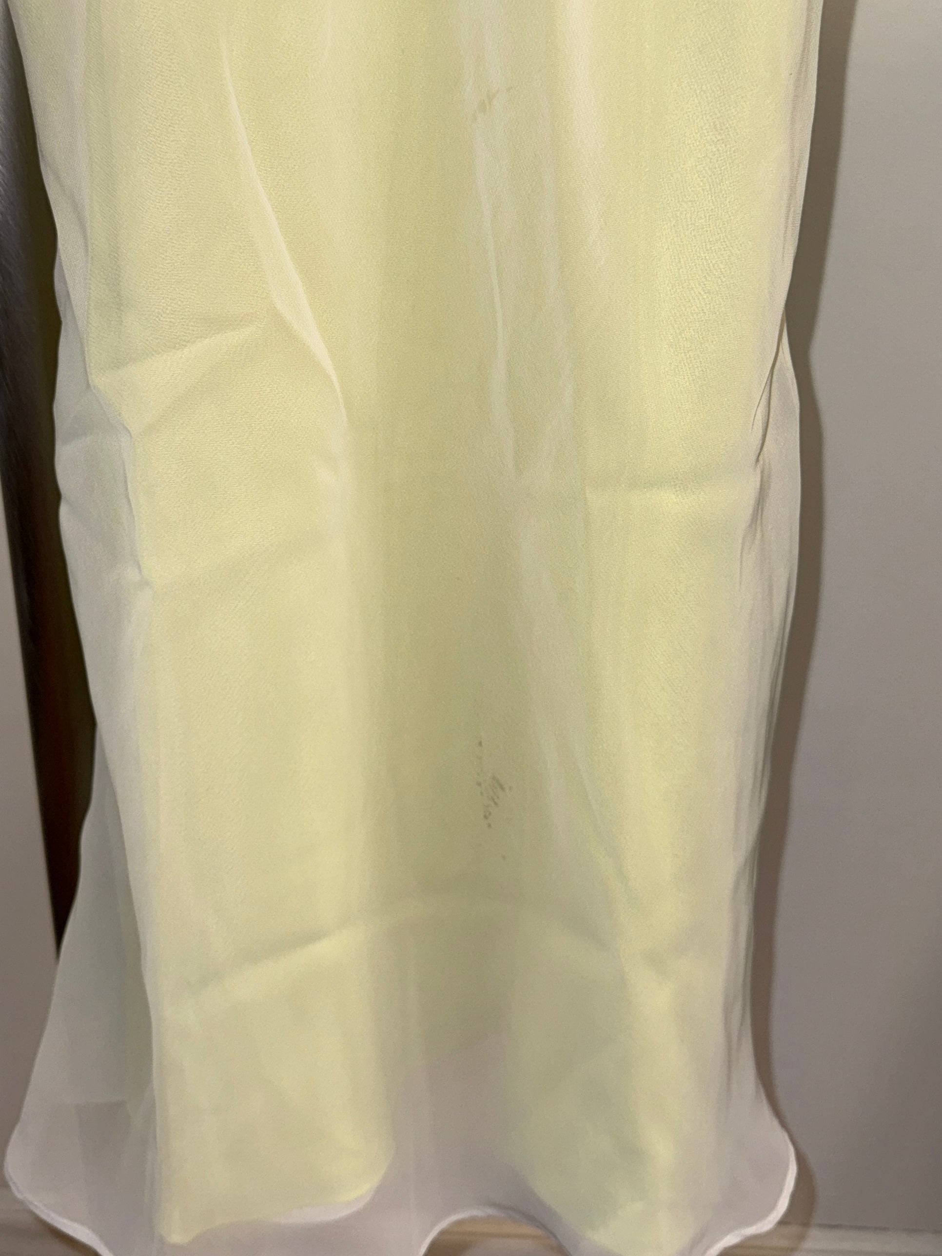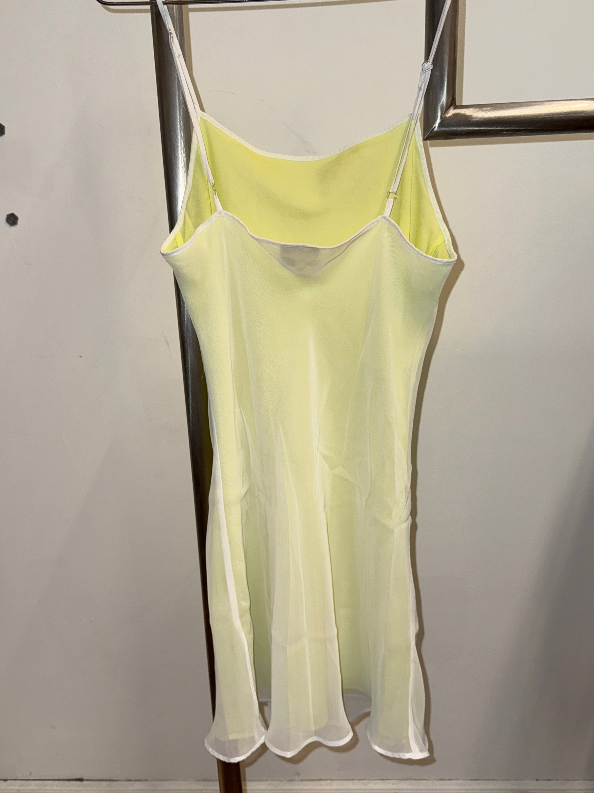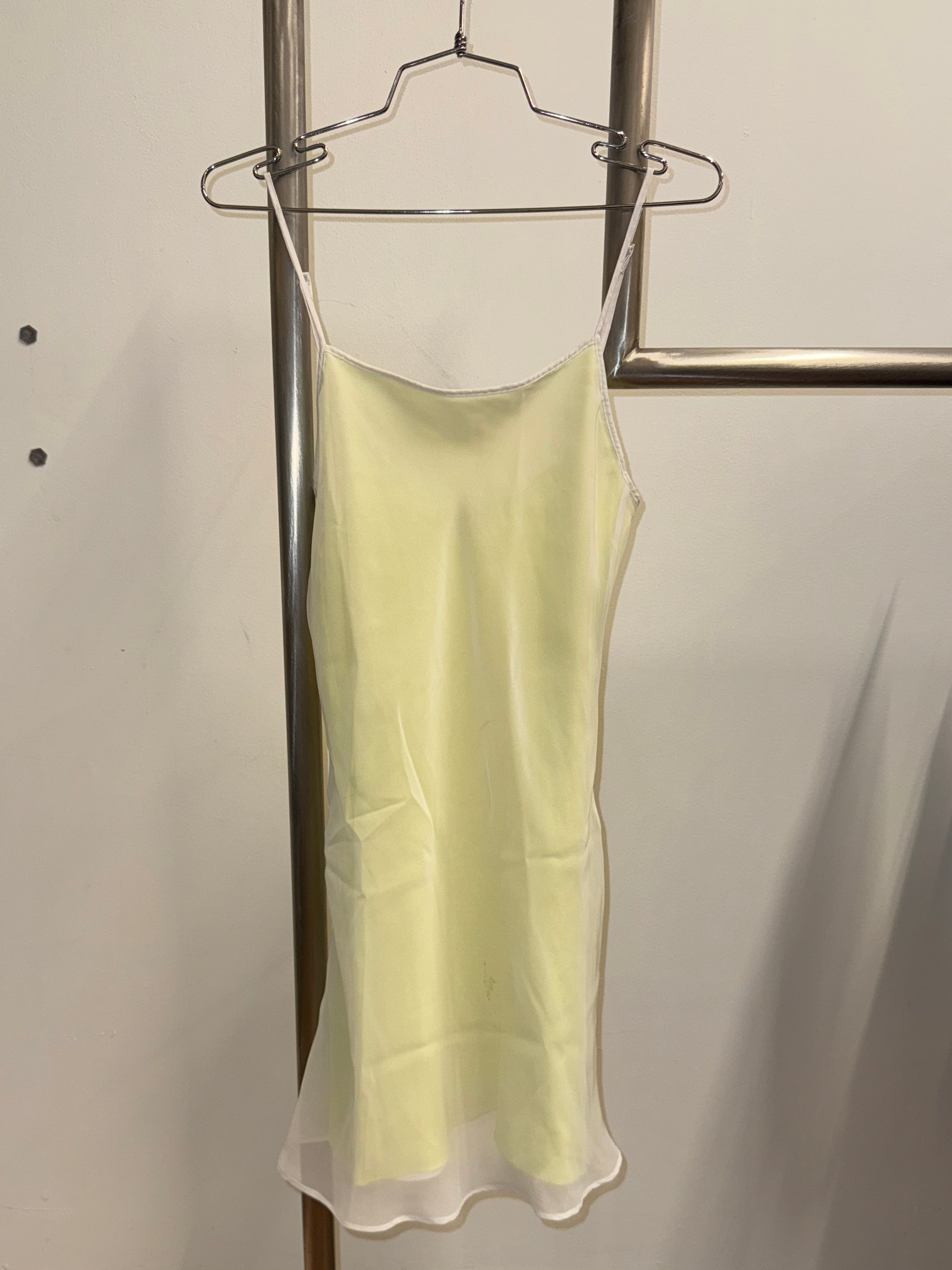 Featuring a chartreuse/light lime inner slip with an ivory sheer chiffon outer layer, delicate adjustable spaghetti straps, soft scoop neckline, and a floaty semi-sheer hem finished with white binding.