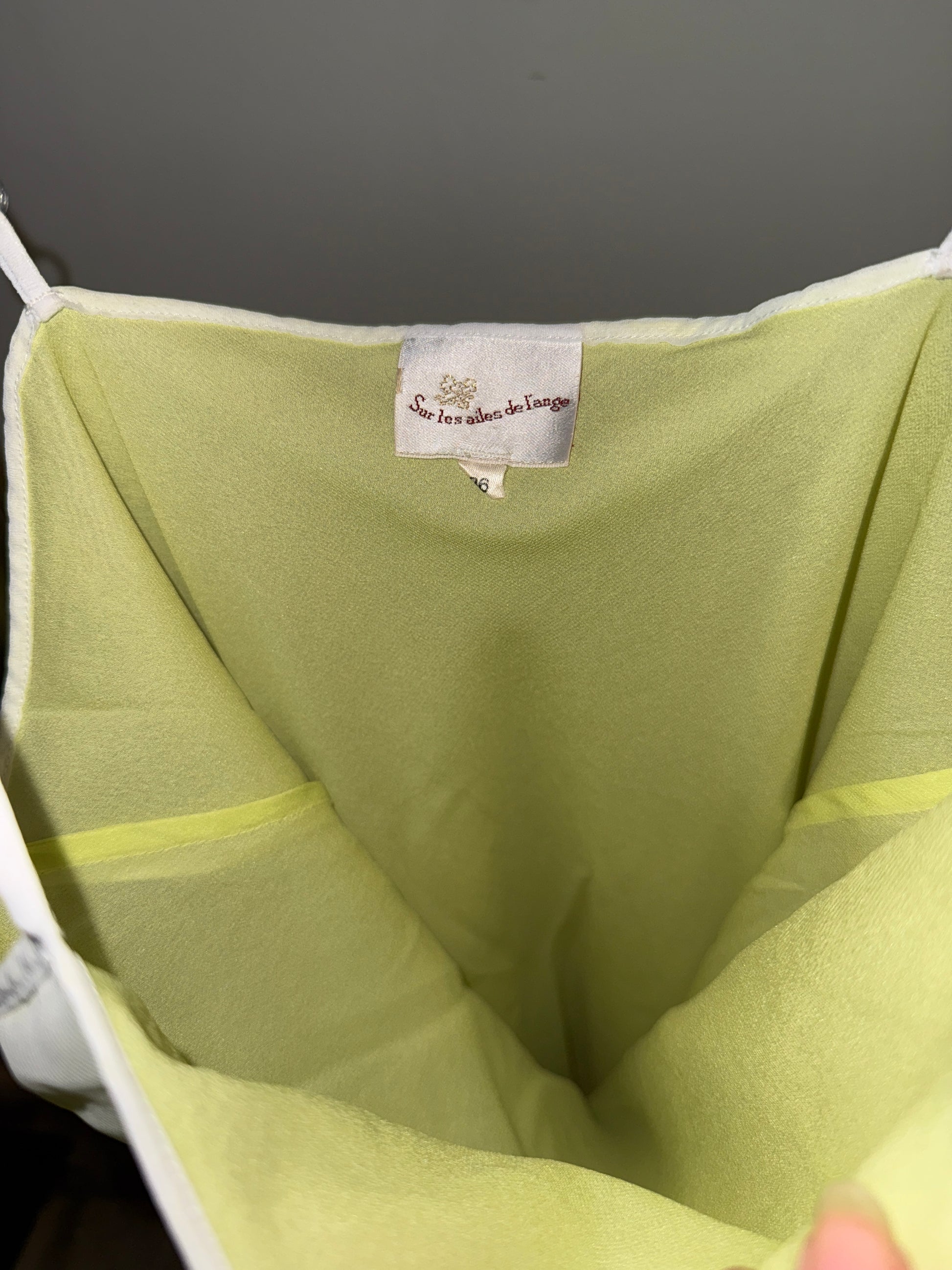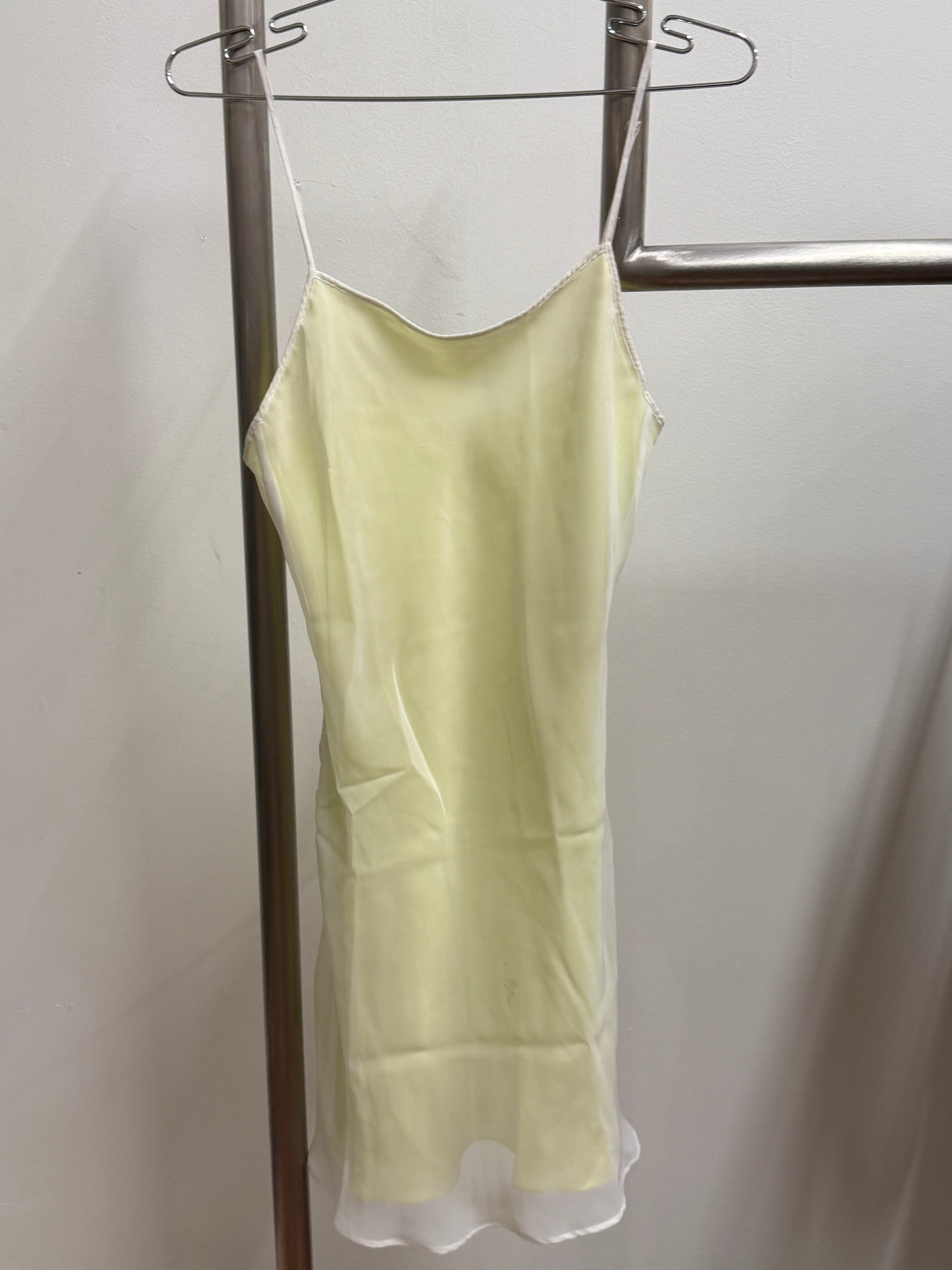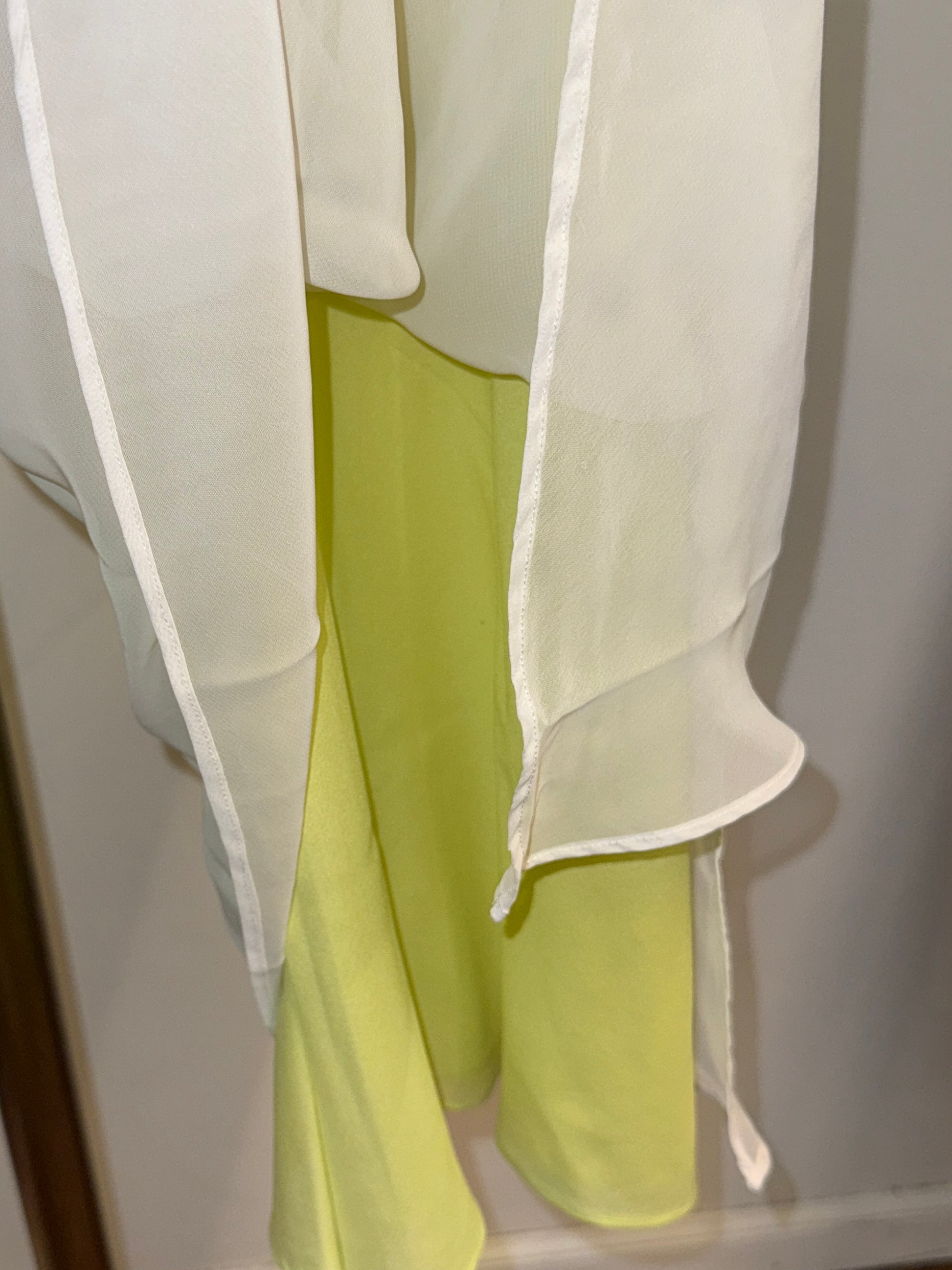 Featuring a chartreuse/light lime inner slip with an ivory sheer chiffon outer layer, delicate adjustable spaghetti straps, soft scoop neckline, and a floaty semi-sheer hem finished with white binding.