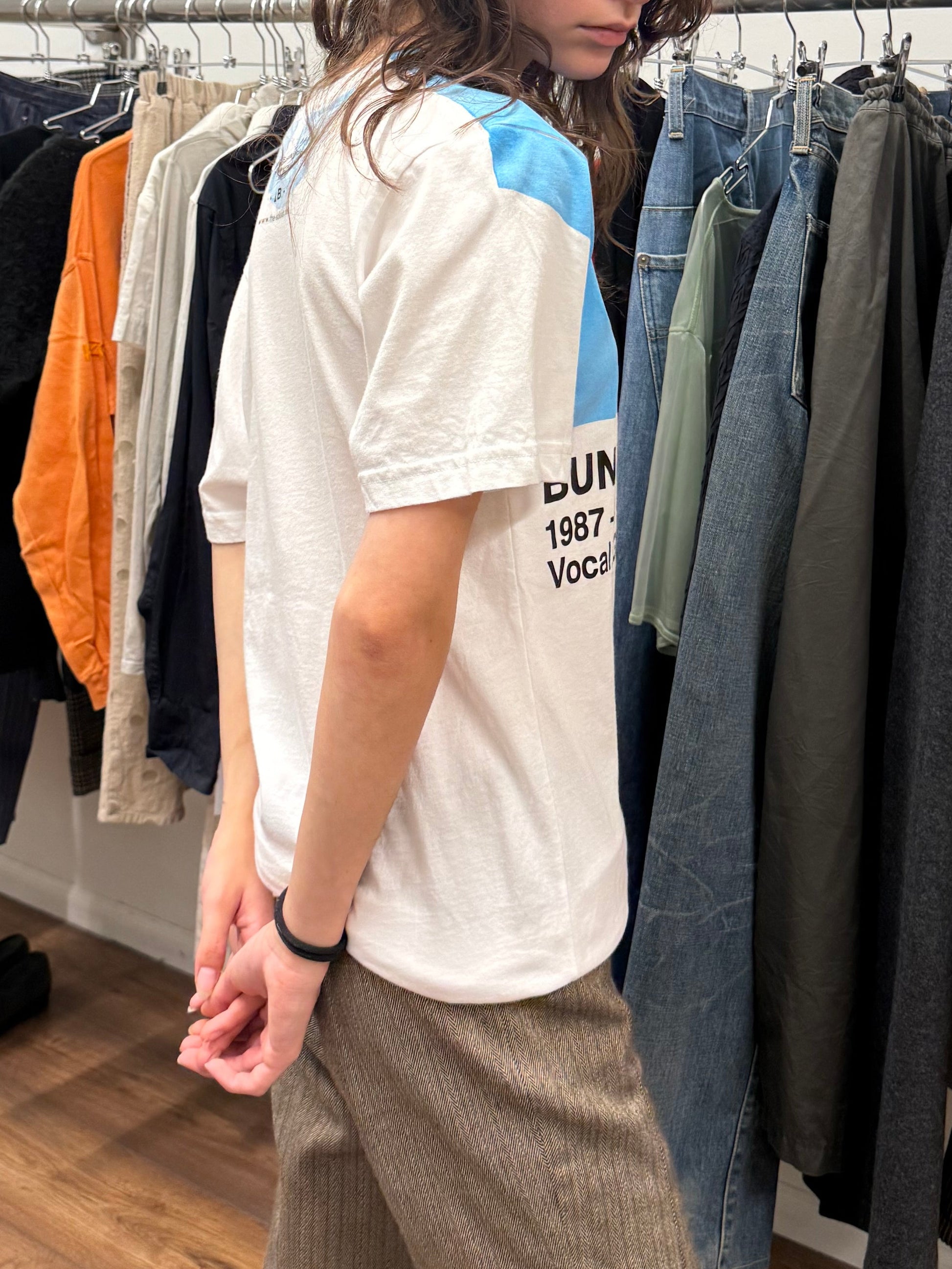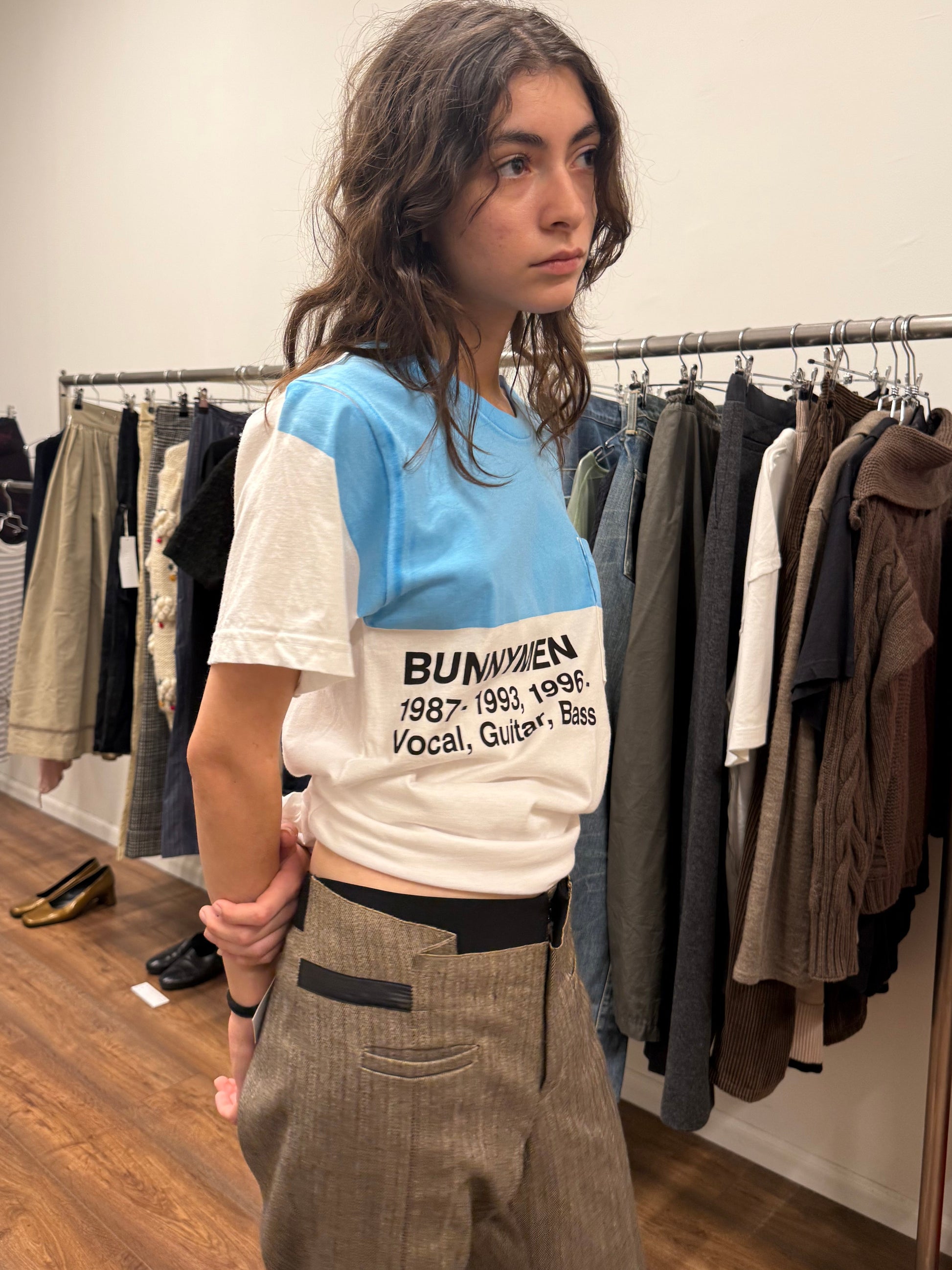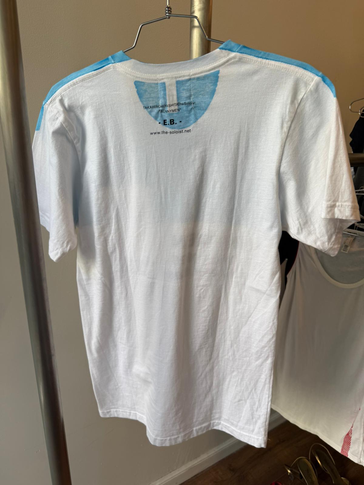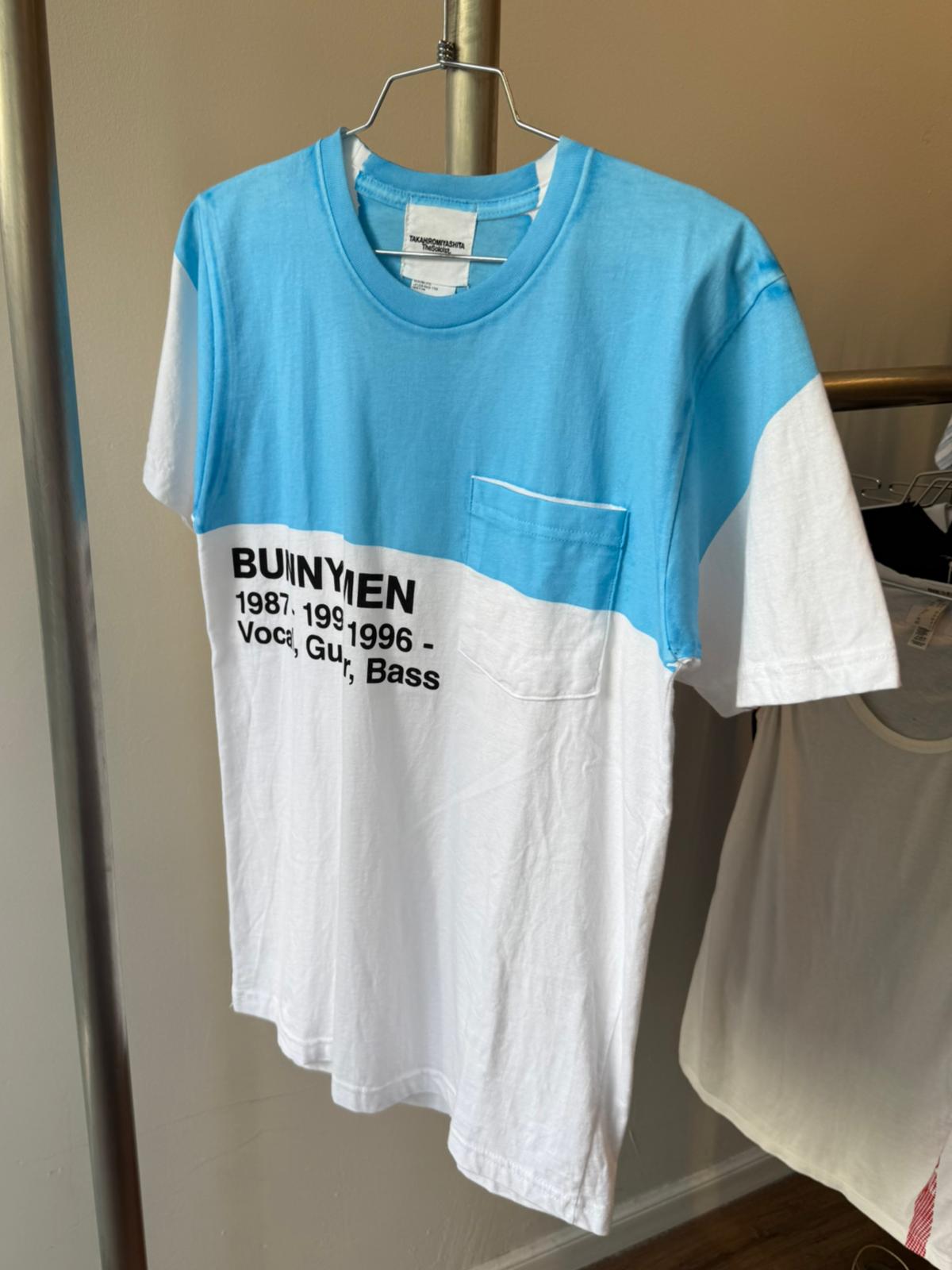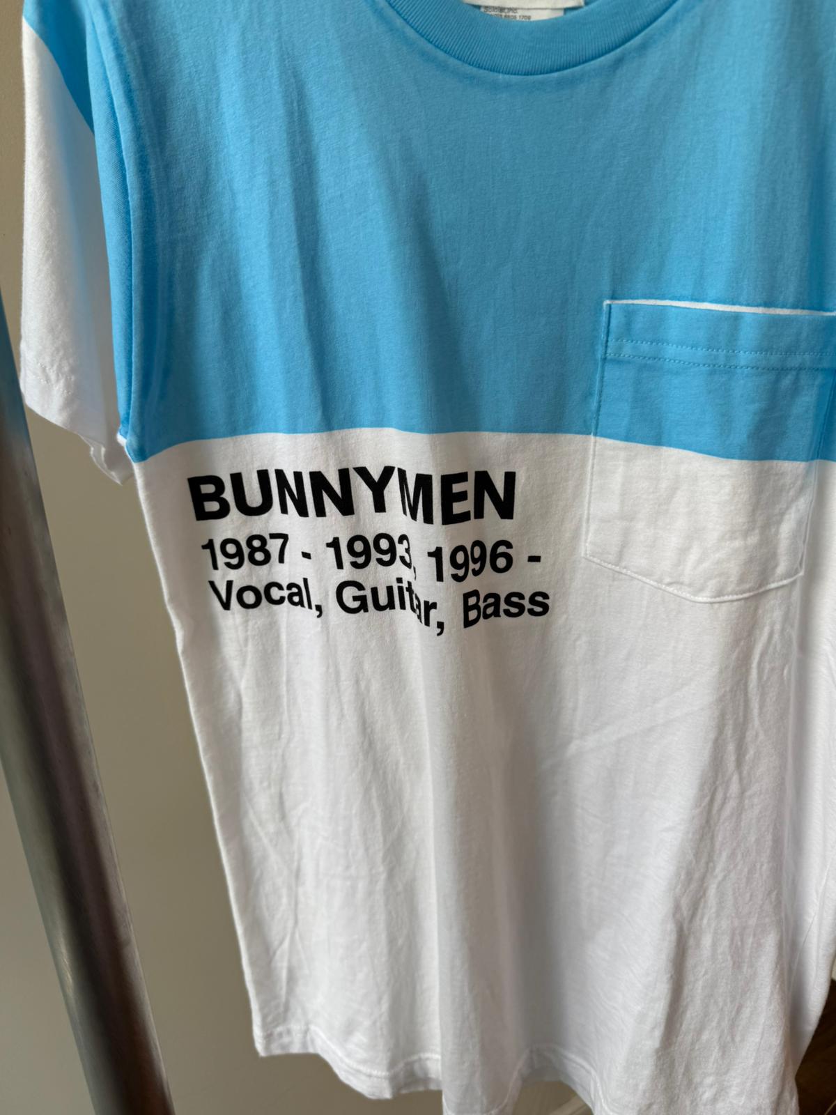 white and light blue Echo & The Bunnymen collab graphic tee with a pocket and writing on it